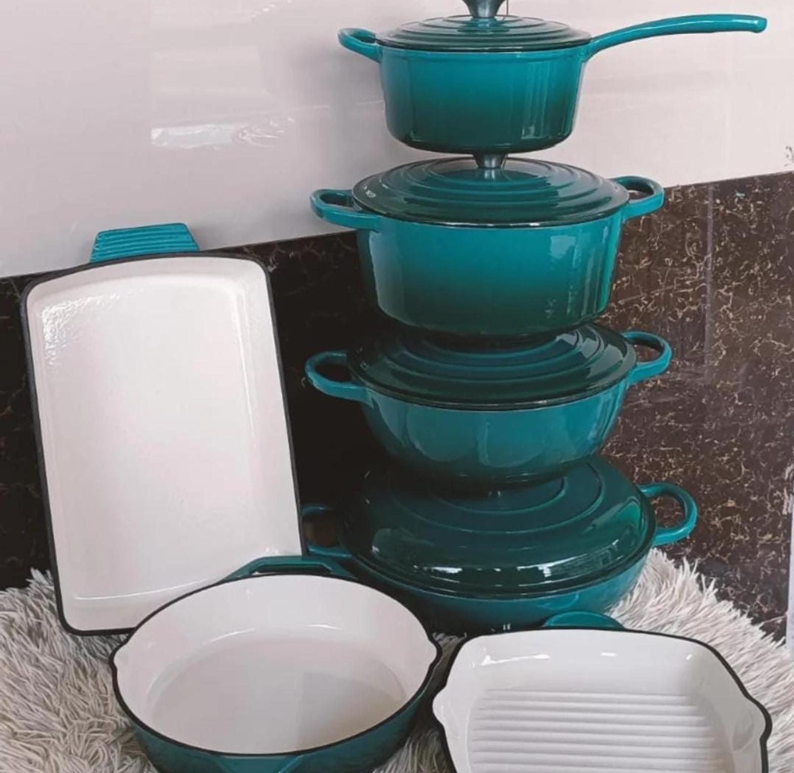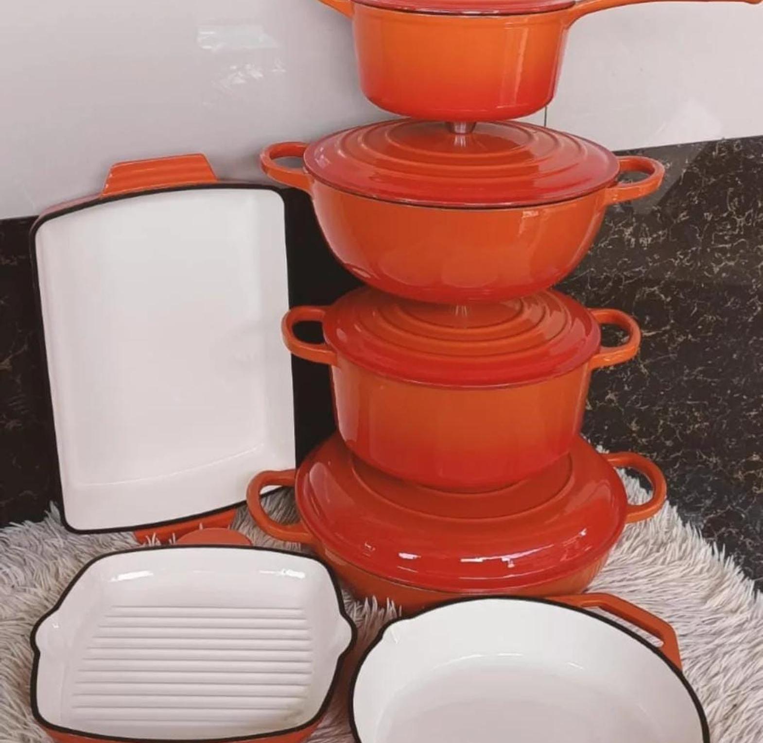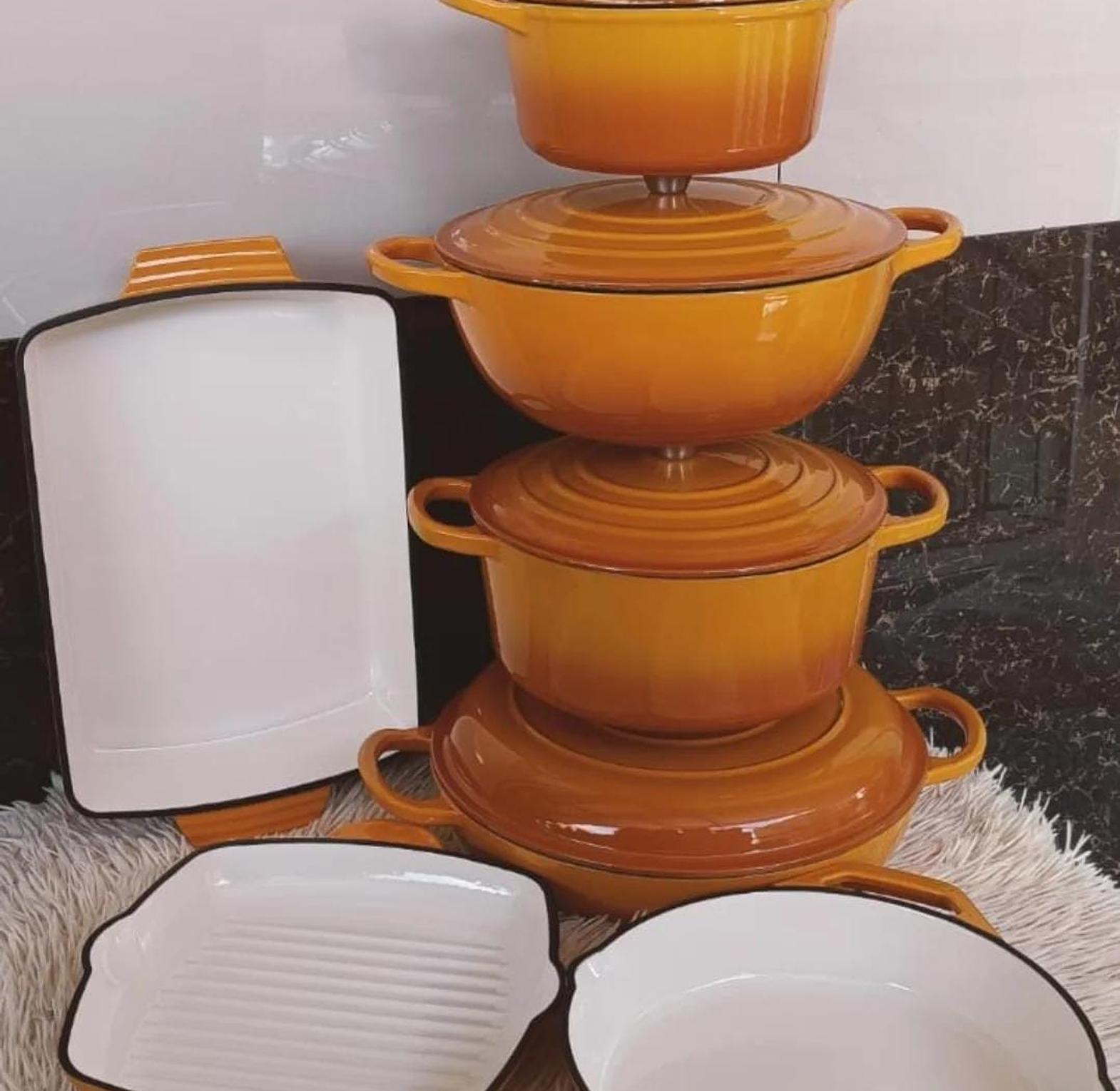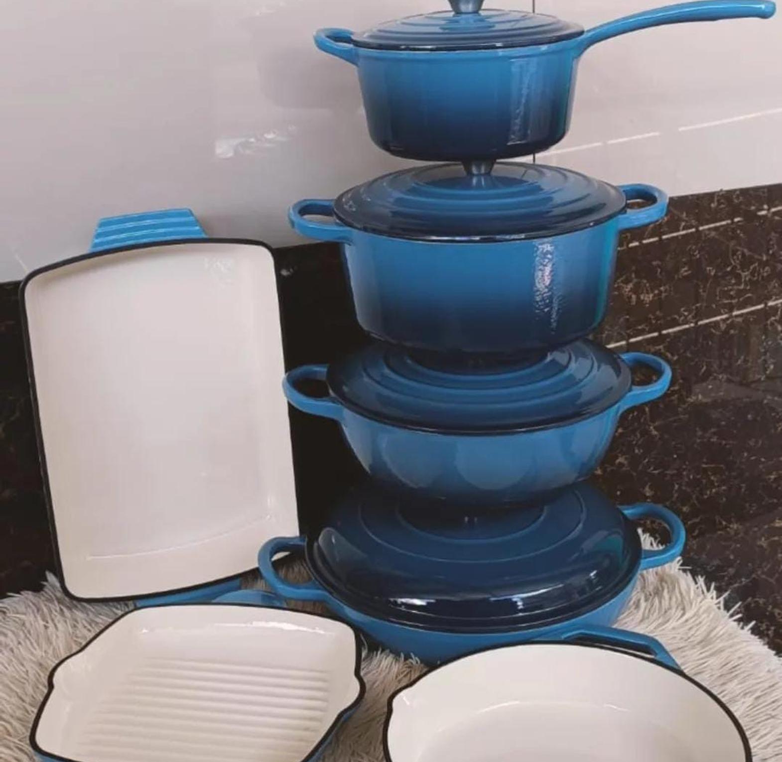 This 11-piece enamel cast iron cooking pot set is a must-have for any kitchen, combining style and functionality in one essential package. Crafted from high-quality cast iron and coated with a durable enamel finish, these pots retain and evenly distribute heat, ensuring perfect results every time. The set includes a variety of sizes, ideal for simmering soups, braising meats, baking bread, or preparing sauces. The vibrant enamel coating not only enhances the look of your kitchen but also makes cleaning easy and quick. Whether you're a professional chef or a home cook, this set offers versatility, durability, and a touch of elegance to elevate your cooking experience.
