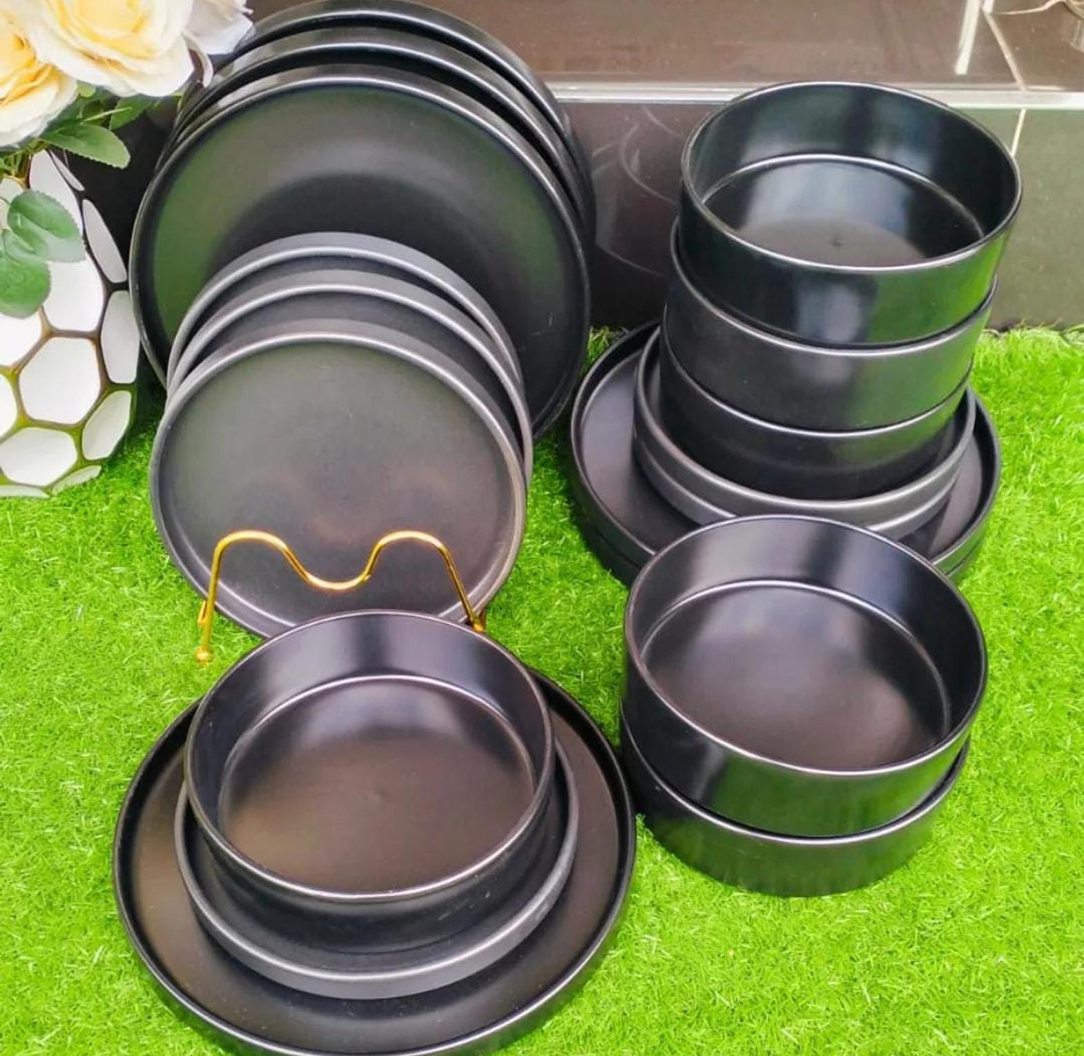 Elevate your dining experience with this 18pcs Black Plain Dinner Set, thoughtfully curated to bring style and simplicity to your table. Featuring six dinner plates, six side plates, and six bowls, each piece is crafted from durable, high-quality ceramic in a smooth matte black finish that complements any table setting. Perfect for everyday use or special occasions, this set combines practicality with bold elegance, making it a timeless addition to both contemporary and classic kitchens. Whether you're hosting guests or enjoying a quiet meal, this dinner set delivers understated sophistication with every bite.