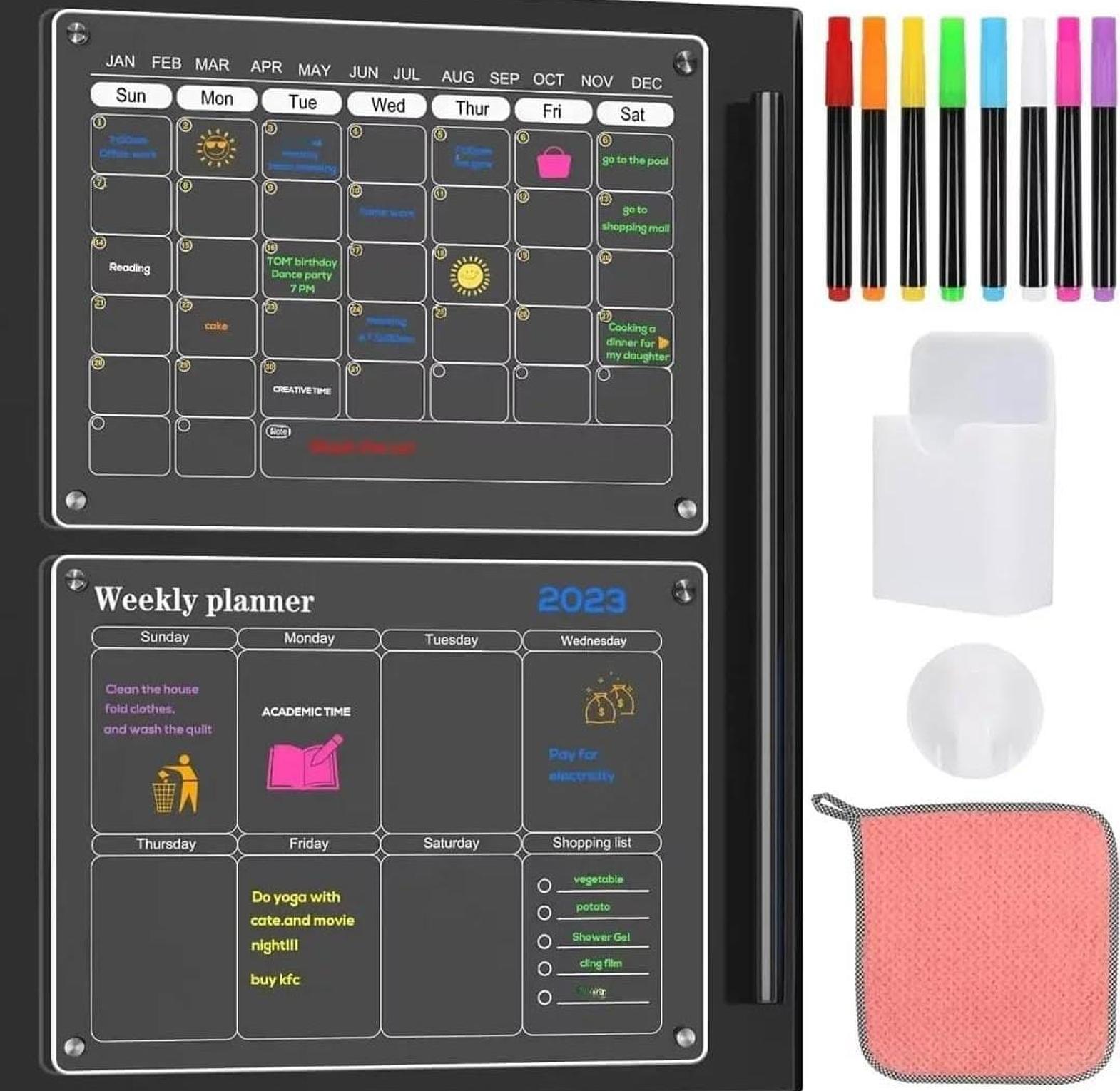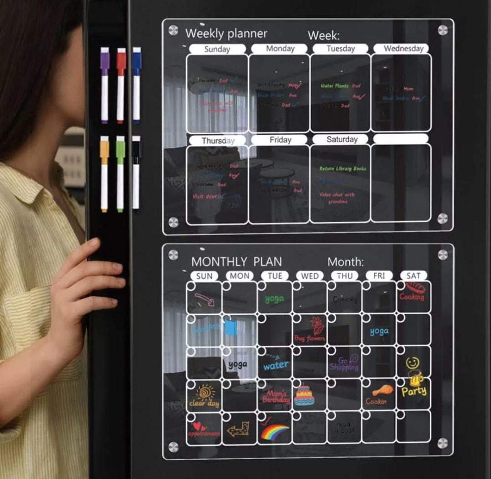 Keep track of your tasks, appointments, and meals effortlessly with our 2-piece set Magnetic Monthly/Weekly Fridge Planner. Designed to attach securely to any metal surface, these planners offer a convenient way to organize your week or month at a glance. The monthly planner allows for long-term scheduling, while the weekly planner helps you focus on day-to-day tasks and events. The sleek, magnetic design ensures that the planners stay in place without taking up extra space, and their wipeable surface makes it easy to update plans as needed. Ideal for busy families or professionals, this set is a practical addition to your kitchen or office, helping you stay organized and on top of your commitments.
