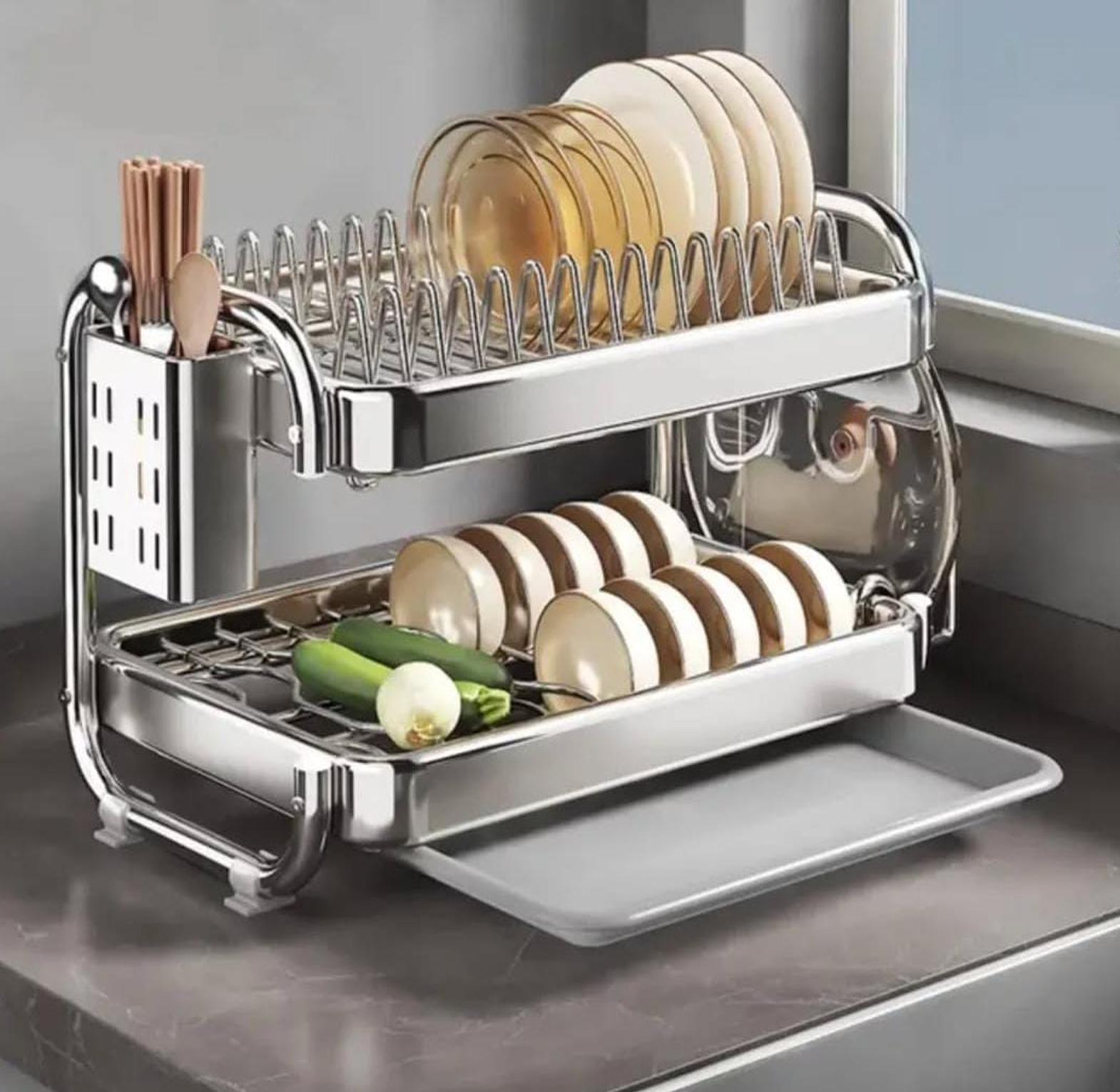 Our 3-Tier Kitchen Chrome-Plated Dish Rack is the ultimate solution for drying dishes with ease and style. Constructed from durable 201SS material, this rack offers three spacious tiers to accommodate a variety of dishes, glasses, and utensils. The sleek chrome finish not only ensures long-lasting durability but also adds a modern touch to your kitchen. The included drain tray helps to catch excess water, keeping your countertop clean and dry. Perfect for small to medium-sized kitchens, this dish rack makes it easy to store and dry your dishes while maintaining a tidy and organized space.