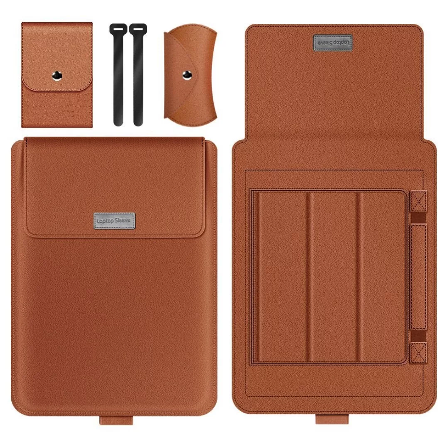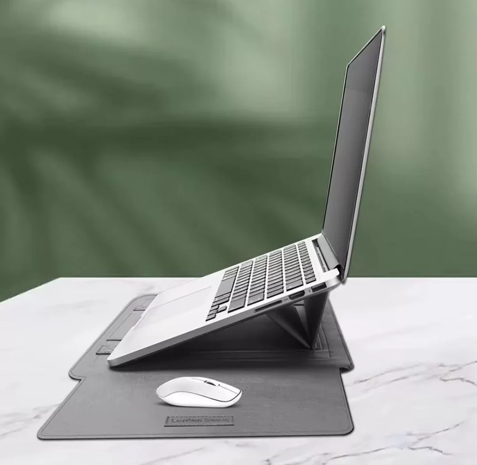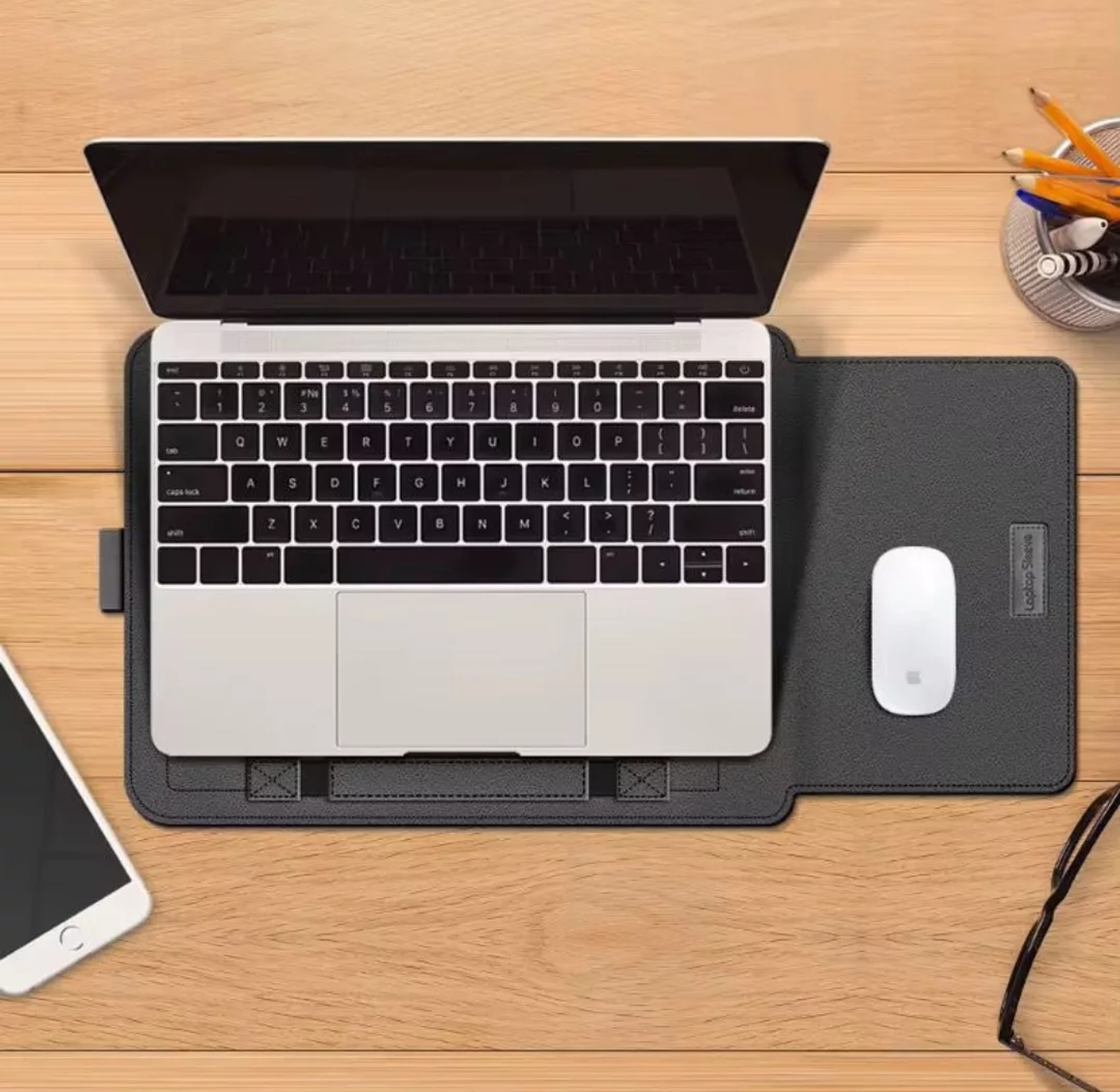 Upgrade your workspace on the go with this 3-in-1 laptop sleeve and stand, designed for maximum functionality and style. Made from premium artificial leather with a soft plush lining, it offers superior protection against scratches, stains, and water. Its multi-functional design transforms into a cooling bracket for better airflow, a lightweight carrying case, and a convenient flip mouse pad for smooth productivity anywhere. Thoughtfully designed with a pen sleeve and hand strap, it’s practical, portable, and easy to clean. Perfect for students, professionals, and digital nomads, this laptop sleeve is the ultimate blend of protection and performance.