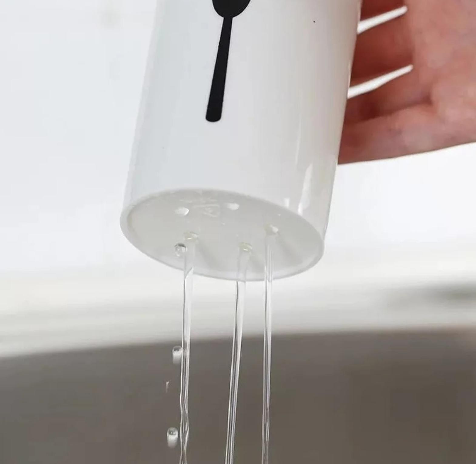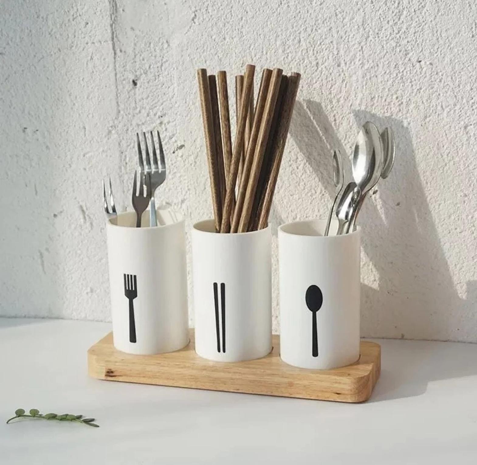 This sleek and practical 3-piece cutlery organizer is the perfect addition to any modern kitchen, offering an elegant solution for utensil storage. Each of the three pristine white cylinders is adorned with a distinct black silhouette – a fork, chopsticks, and a spoon – making organization effortless and visually appealing. Crafted for convenience, the organizer features outlet holes at the bottom of each cylinder to facilitate water drainage, ensuring your cutlery dries properly and preventing mildew. The set is securely housed on a solid oak wood base, providing stability and a touch of natural warmth to your countertop. Measuring at a compact 9.2 inches in length, 3.3 inches in width, and 5.1 inches in height, with each cylinder having a diameter of 2.5 inches, this organizer is designed to maximize space while keeping your most-used utensils within easy reach. Its thoughtful design allows for easy access and categorization of your cutlery, making meal prep and cleanup more efficient.