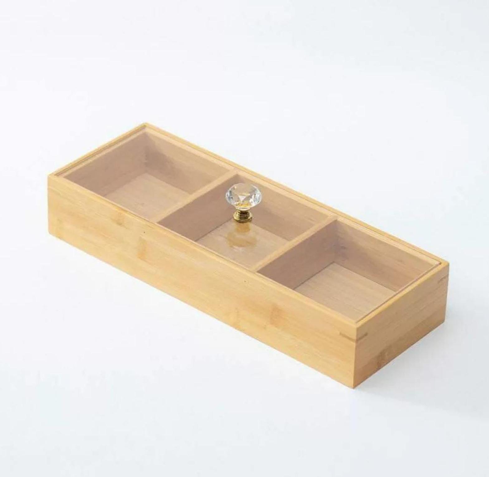 This 3-slot wooden tea bag and candy organizer brings both style and practicality to your kitchen or living area. Crafted from durable wood with a natural finish, it provides a sophisticated way to store and display your favorite tea bags, candies, or even small snacks. The divided compartments offer easy access and help keep your items neatly separated, ensuring that everything is within reach when you need it. Perfect for tea enthusiasts or anyone who loves to indulge in a sweet treat, this organizer doubles as a functional décor piece, enhancing your home with a rustic, yet refined charm. Whether placed on a countertop, in a pantry, or as part of a cozy tea corner, this piece keeps your essentials beautifully organized and easily accessible.