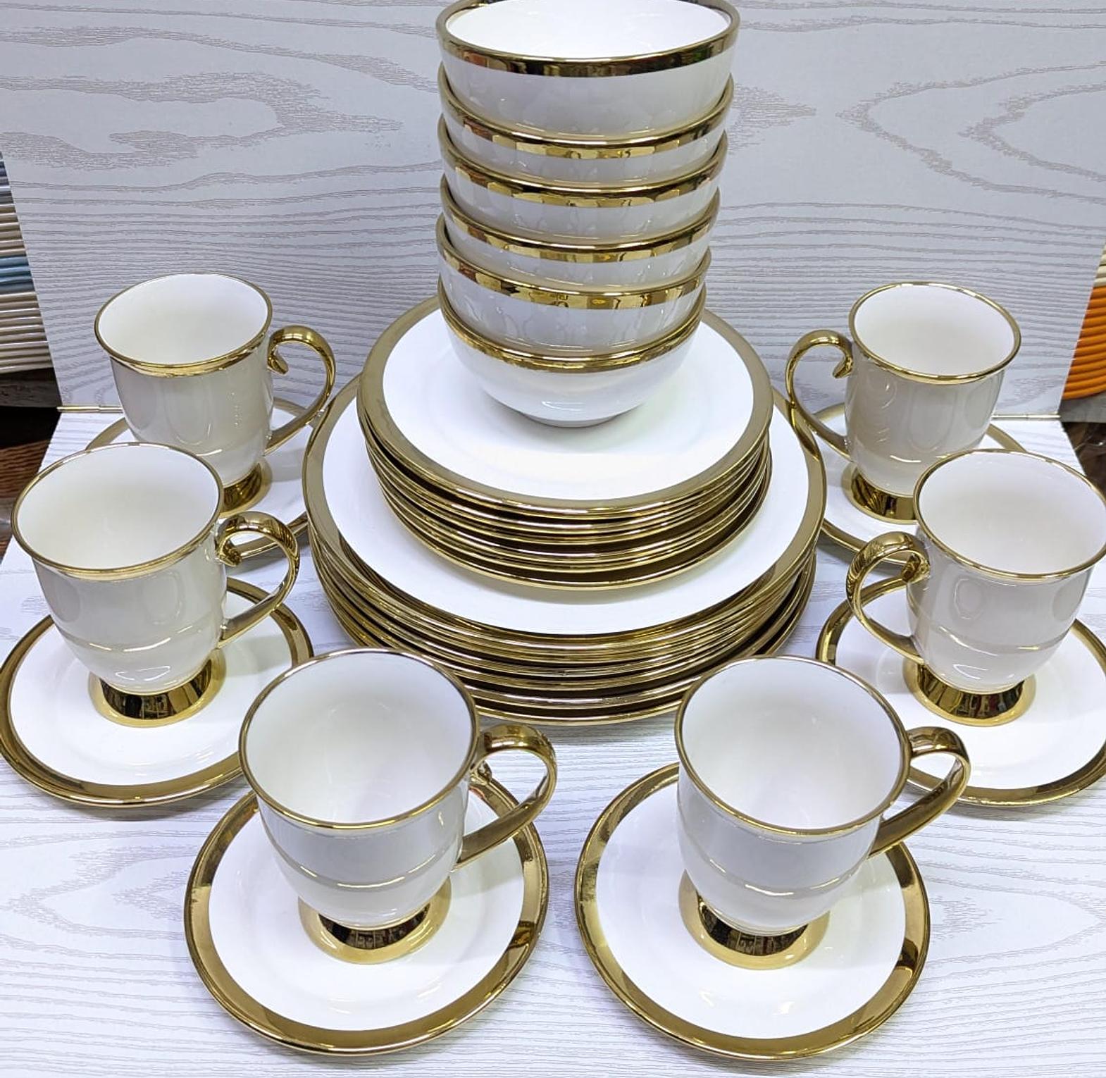 Upgrade your dining table with our elegant 30-piece ceramic dinner set, designed for those who appreciate both style and quality. This stunning set includes 6 dinner plates, 6 side plates, 6 soup bowls, 6 mugs, and 6 saucers, each beautifully crafted with a premium ceramic finish and a sophisticated gold rim. Perfect for both everyday meals and special occasions, this set adds a touch of luxury to your dining experience. The durable, chip-resistant ceramic ensures long-lasting use, while the refined gold accents bring a timeless elegance to your table setting. Ideal for hosting dinner parties or elevating your home decor, this 30-piece set combines beauty and functionality in one elegant package.