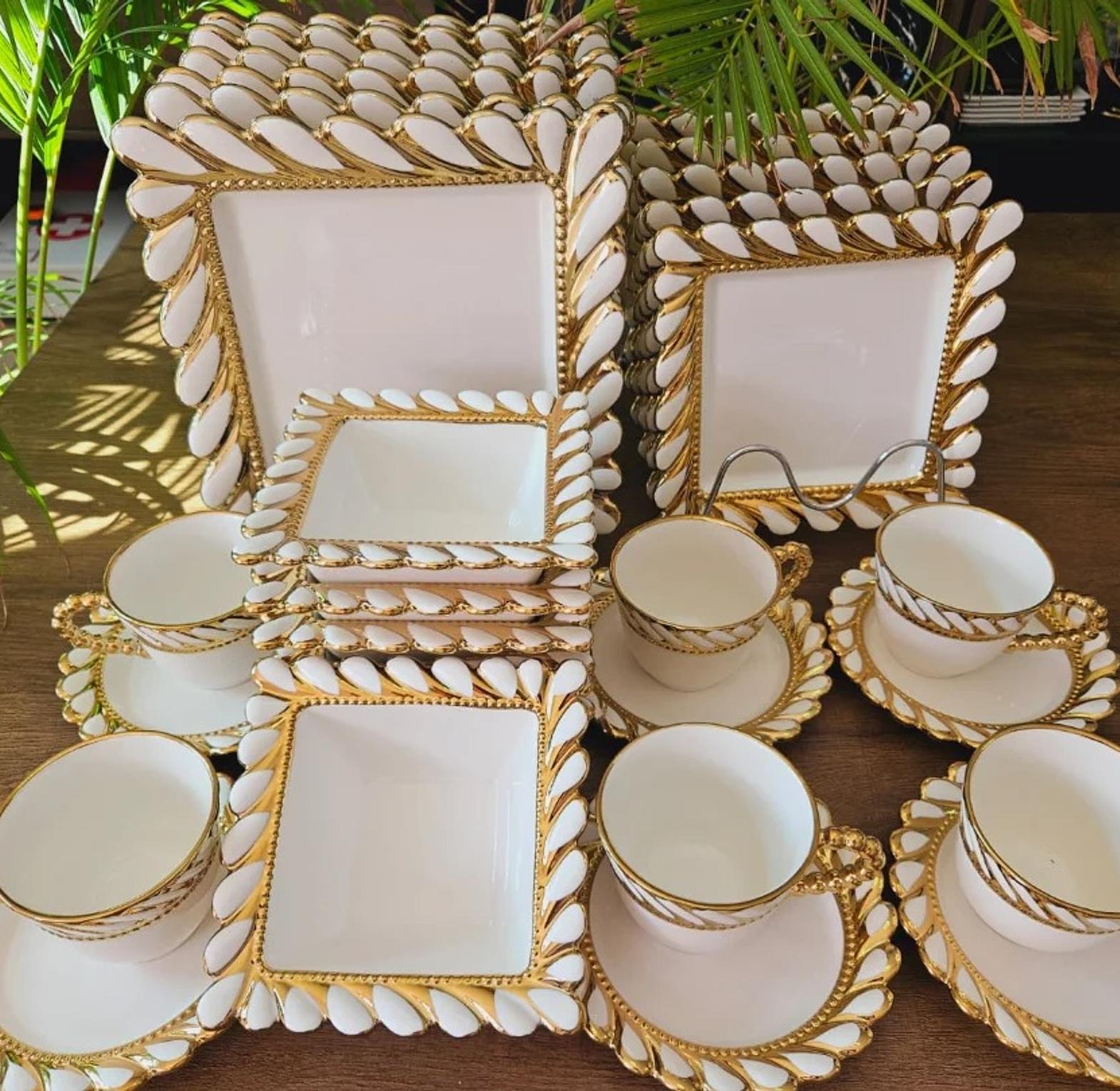 Transform your dining table into a lavish setting with the Opulent Edge 30-Piece Ceramic Dinner Set. This comprehensive collection is meticulously designed for those who appreciate refined aesthetics and superior quality. The set includes 6 dinner plates, 6 side plates, 6 soup bowls, 6 mugs, and 6 saucers, providing a complete service for six individuals. Each piece features a contemporary squared shape that adds a unique modern flair to your table. The pristine white ceramic is beautifully accented with a delicate yet striking gold rim, elevating the entire set with a touch of luxury and sophistication. Crafted from high-quality ceramic, these pieces are durable and designed for both everyday elegance and special occasions. Perfect for formal dinners, festive celebrations, or simply to make every meal feel extraordinary, the OpulentEdge set brings an air of grandeur to your home. Its timeless design ensures it complements various decor styles, making it a cherished addition to any kitchen or dining room. This exquisite dinner set is a must-have for those seeking luxury dinnerware, ceramic plate sets, gold rimmed dishes, modern dining sets, and complete dinnerware collections.