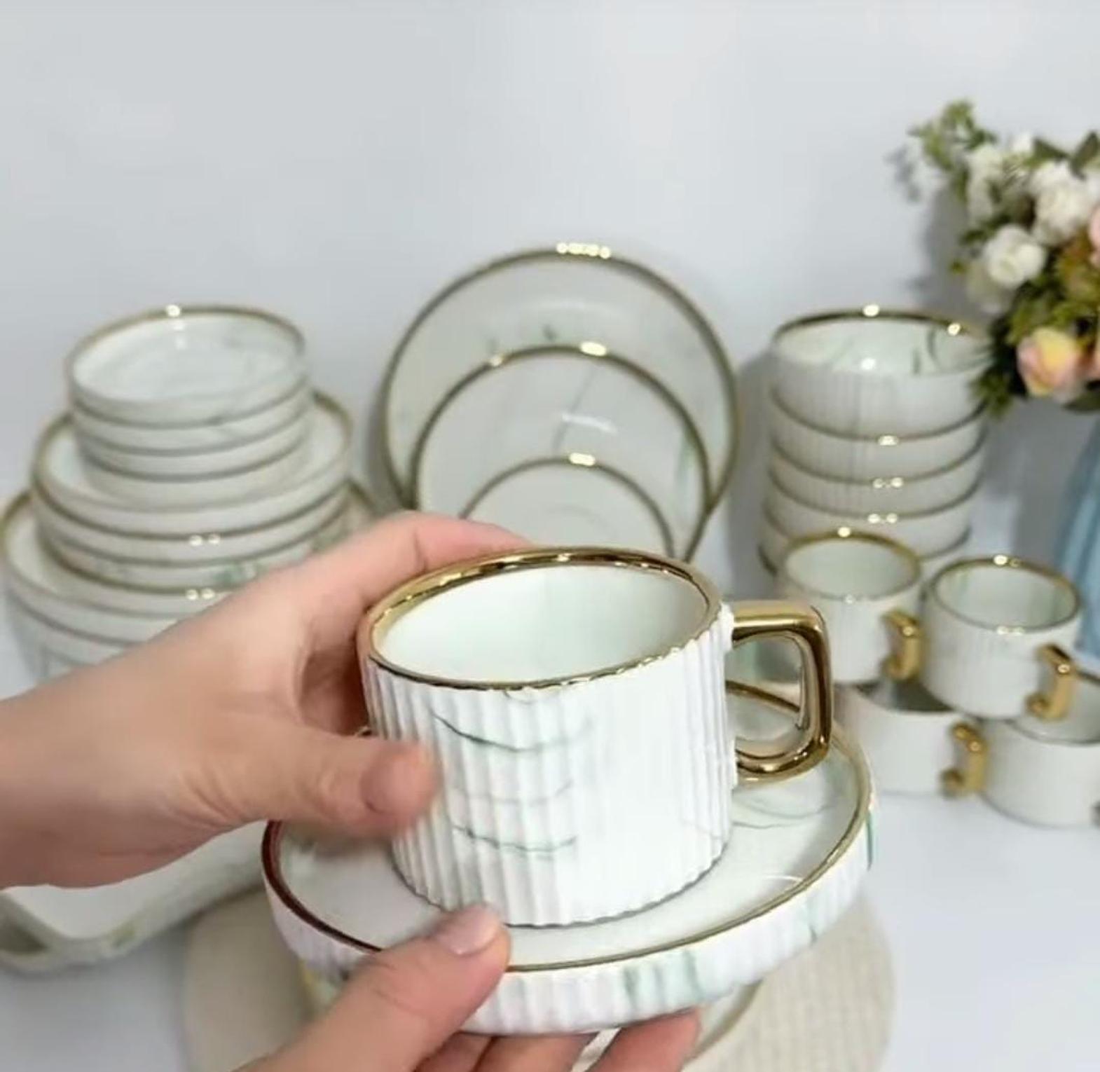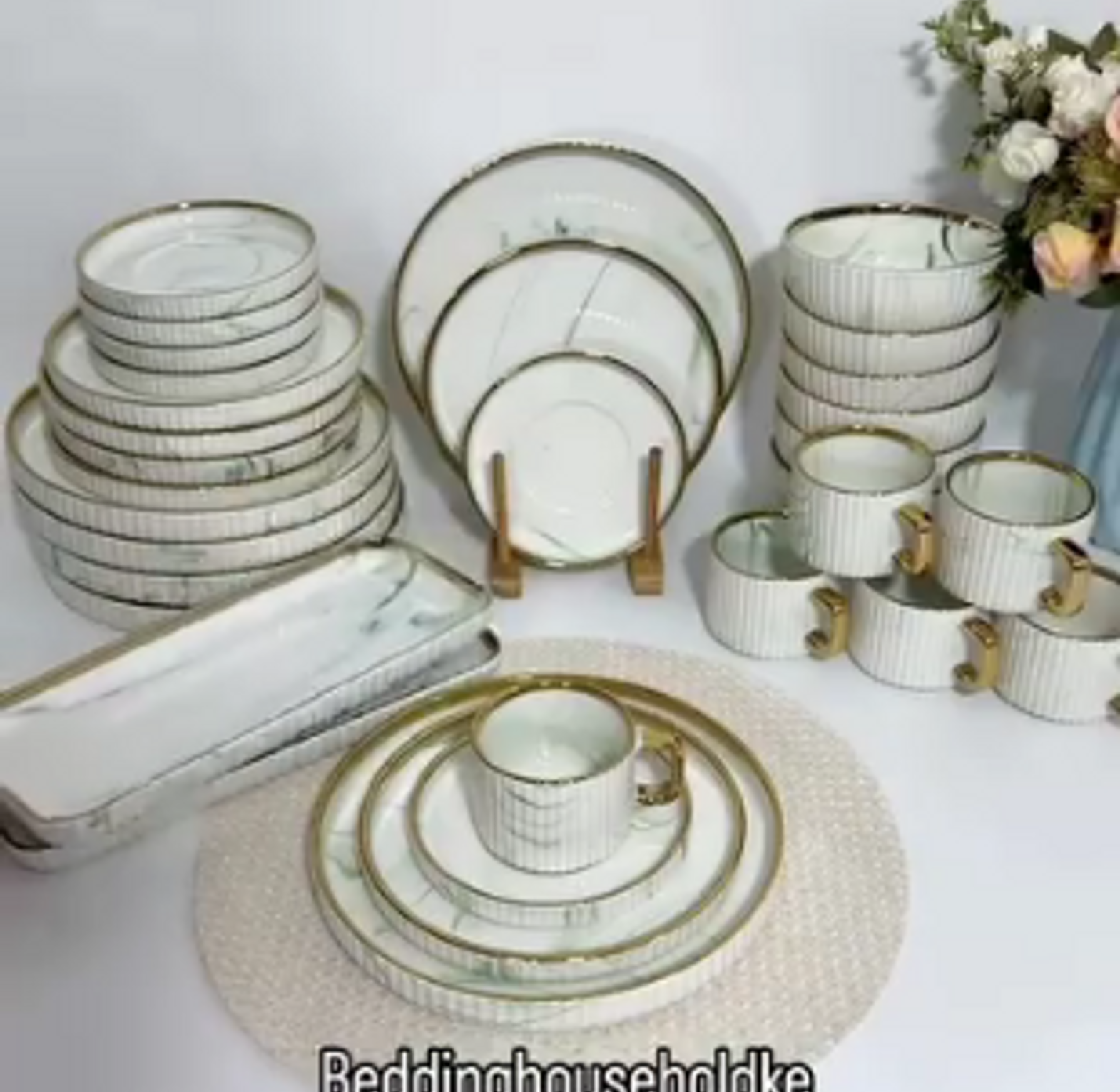 This 32-piece elegant European porcelain dinner set brings a refined touch to any dining experience, whether for daily meals or special gatherings. Made from high-quality porcelain, each piece features a smooth, durable finish and graceful design that embodies classic European charm. The set includes 6 dinner plates (10"), 6 side plates (8"), 6 soup bowls (6"), 6 mugs (220ml), 6 matching saucers, and 2 rectangular platters—making it a complete and cohesive collection for serving multiple courses in style. Perfect for both casual and formal settings, this set offers both beauty and practicality, elevating your table with understated luxury and long-lasting quality.