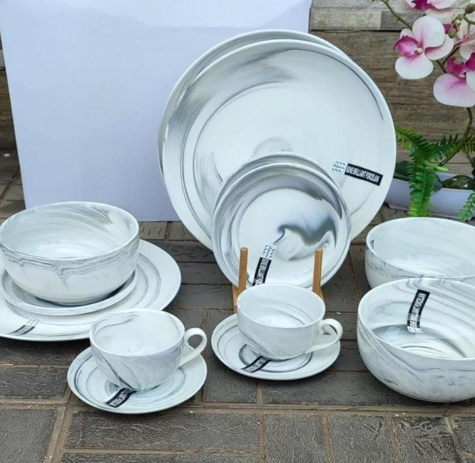 Set your table in style with our 36-piece Grey-Marble Nordic Classy Dinner Set, where sleek Nordic-inspired design meets timeless marble aesthetics. The soft grey tones and subtle marbling create a refined, modern look that enhances any dining occasion, from casual meals to formal gatherings. This set includes everything you need for a complete dining experience, including dinner plates, side plates, bowls, and cups, all crafted with high-quality porcelain for durability and long-lasting beauty. The elegant and versatile design easily complements various table settings, adding a touch of sophistication to your home while offering a functional and stylish dining solution.