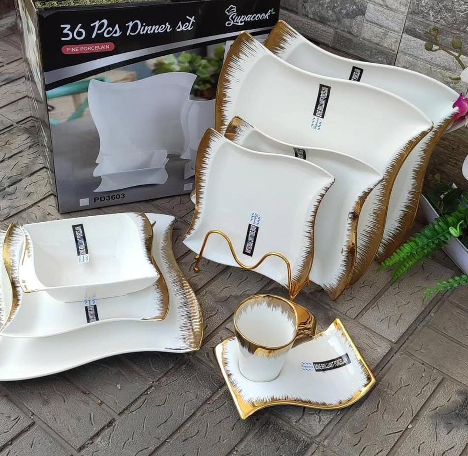 Redefine your dining experience with this stunning 36-piece Nordic-shaped dinner set, beautifully finished with a graceful gold rim that adds just the right touch of luxury. This thoughtfully arranged set includes 6 dinner plates, 6 medium plates, 6 side plates, 6 bowls, 6 cups, and 6 saucers — everything you need to host in style or elevate your daily meals. Inspired by clean Nordic design, each piece features soft, structured lines that feel modern yet warm, making it suitable for any table setting. The gold detailing adds a refined edge, perfect for those who enjoy minimalism with a hint of opulence. Whether it’s a cozy family brunch or a formal dinner with guests, this set effortlessly blends function, beauty, and timeless appeal.