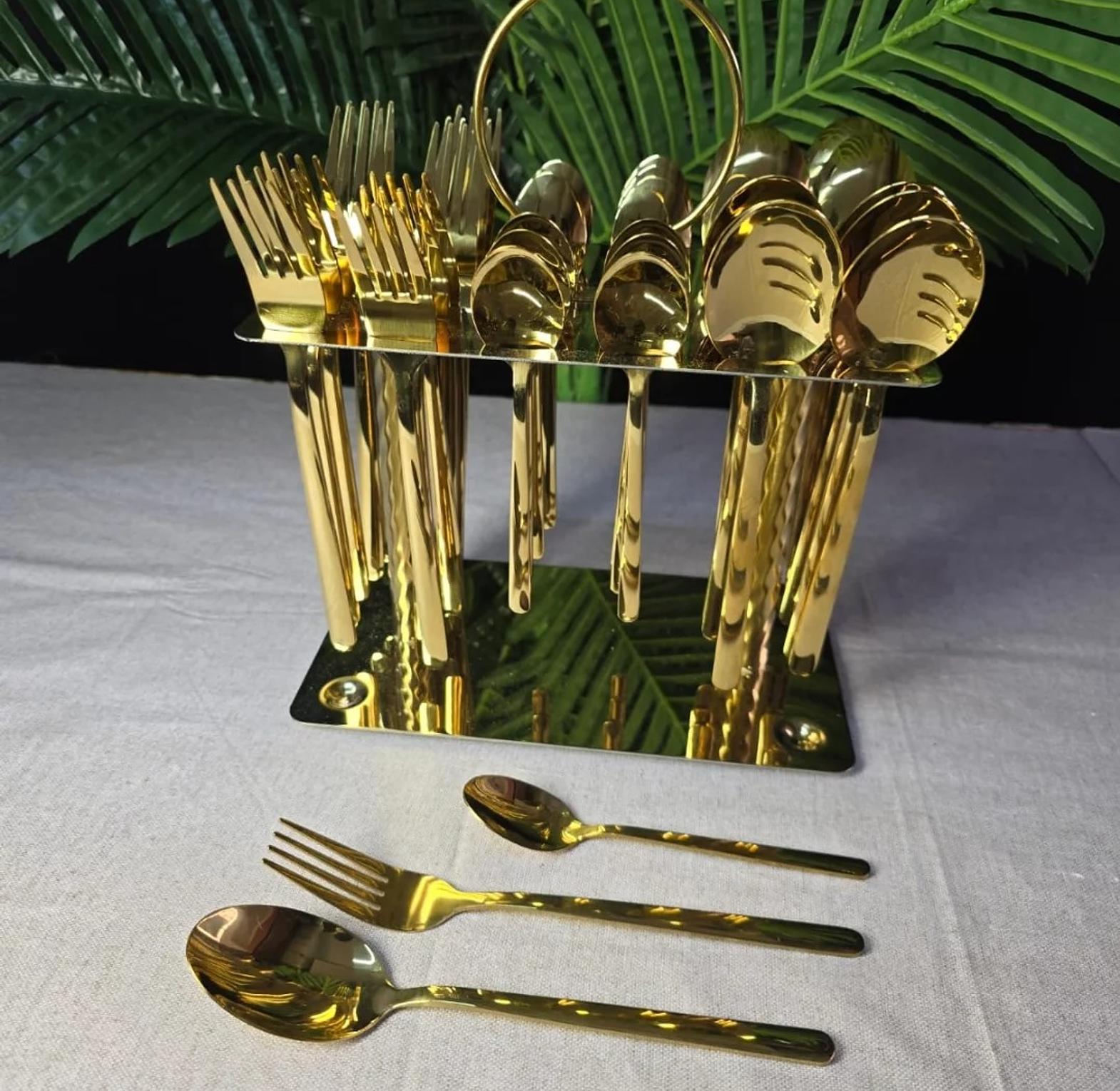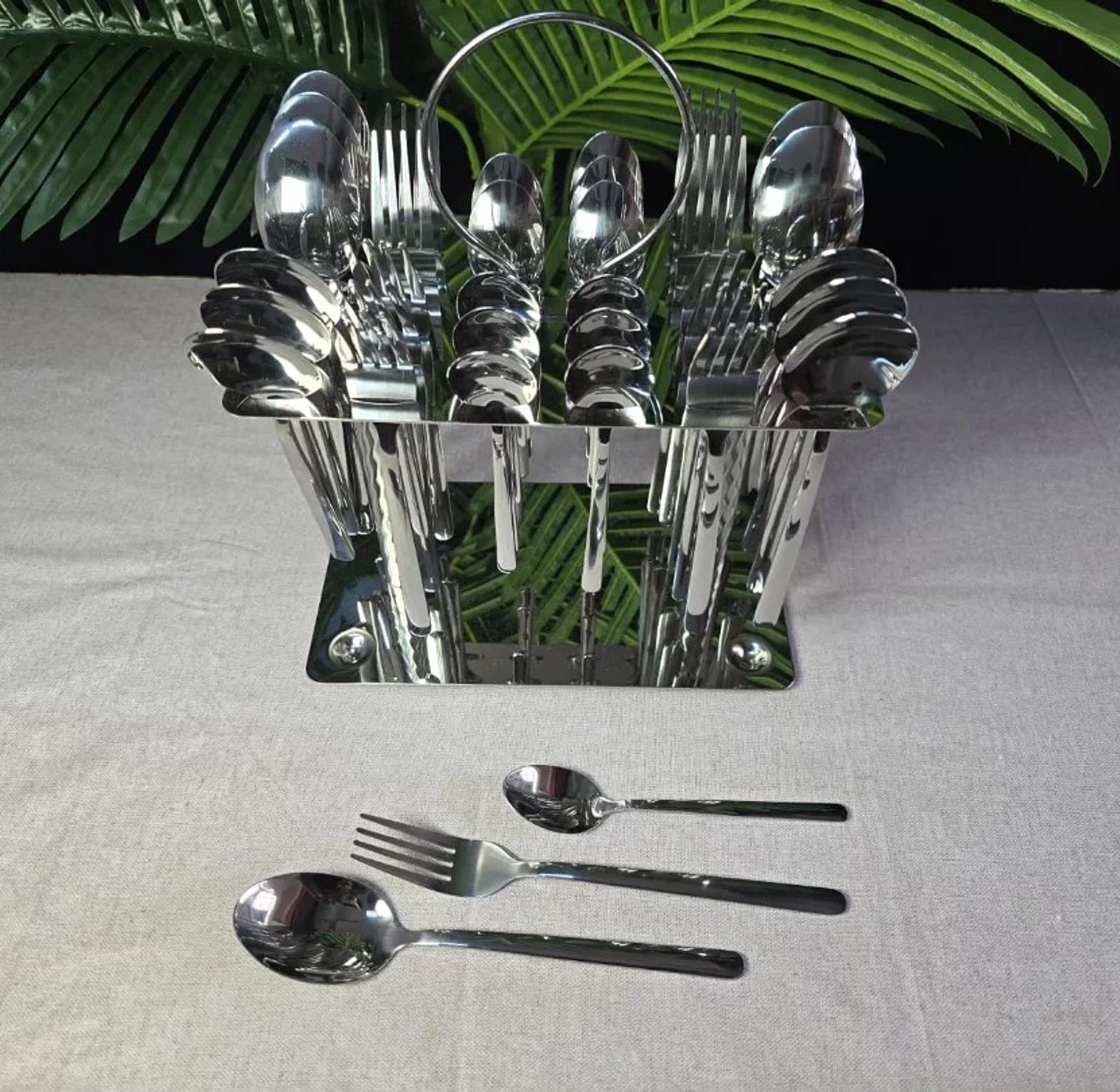Elevate your dining experience with the exquisite Mirror Glow 36-Piece Cutlery Set, a perfect blend of sophisticated design and everyday functionality. This comprehensive collection is designed to cater to all your dining needs, including 12 table spoons, 12 tea spoons, and 12 forks, providing service for a large gathering or ample spares for daily use. Each piece is crafted with a brilliant silver and gold finish, lending a timeless elegance that complements any table setting, from casual brunches to formal dinners. The highlight of this set is its unique and stylish stand, which not only provides a convenient and organized storage solution but also acts as a striking decorative element for your kitchen or dining area. Made from high-quality materials, the cutlery is designed for durability and comfortable handling, ensuring a pleasant dining experience. This set combines practical utility with a modern aesthetic, making it an ideal choice for new homeowners, those upgrading their kitchenware, or anyone looking to add a touch of polished luxury to their home. This cutlery set is a must-have for those seeking cutlery sets, modern flatware, cutlery with stand, 36-piece dining sets, and elegant kitchen utensils.