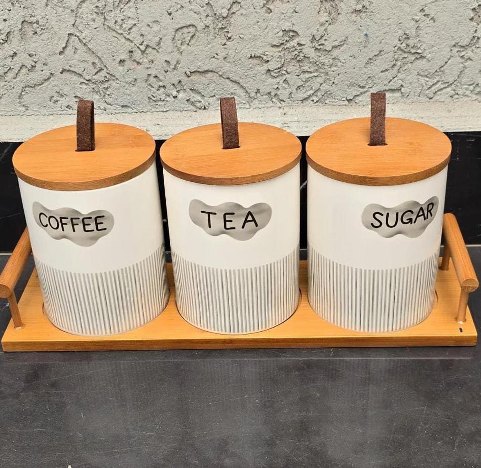 Upgrade your kitchen storage with this beautifully designed 3-piece ceramic canister set, complete with a sleek bamboo stand for a touch of natural elegance. Each canister is crafted from high-quality, durable ceramic, providing an airtight seal to keep dry goods like sugar, coffee, tea, or spices fresh and protected. The smooth, minimalist design blends seamlessly with modern and rustic decor, while the bamboo stand offers stability and an eco-friendly aesthetic. Ideal for both functionality and style, this canister set adds sophistication to your countertop while keeping your essentials neatly organized and easily accessible.