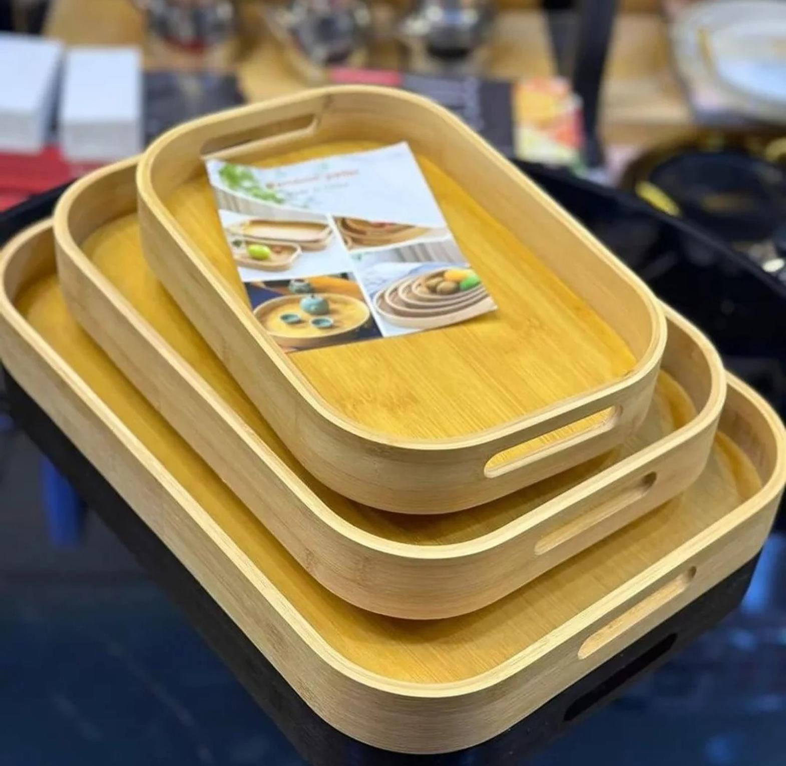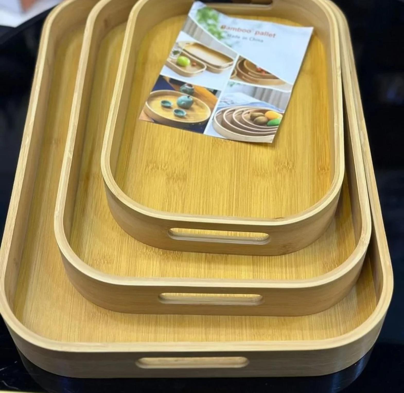 Enhance your home with the natural beauty and versatile functionality of our 3-Piece Multi-functional Bamboo Serving Trays with Handles. This set includes three different-sized trays, each crafted from sustainable and high-quality bamboo wood, offering a light, durable, and eco-friendly solution for various needs. The natural grain of the bamboo adds a warm, organic touch to any decor.