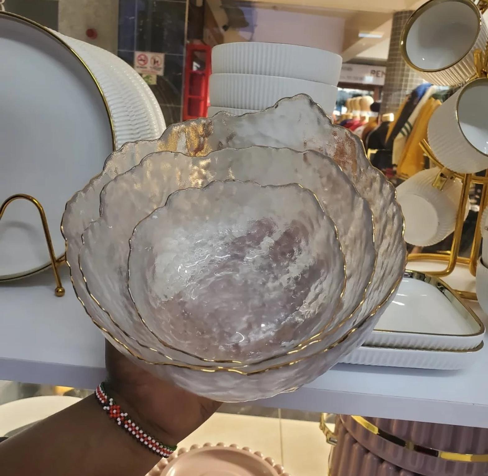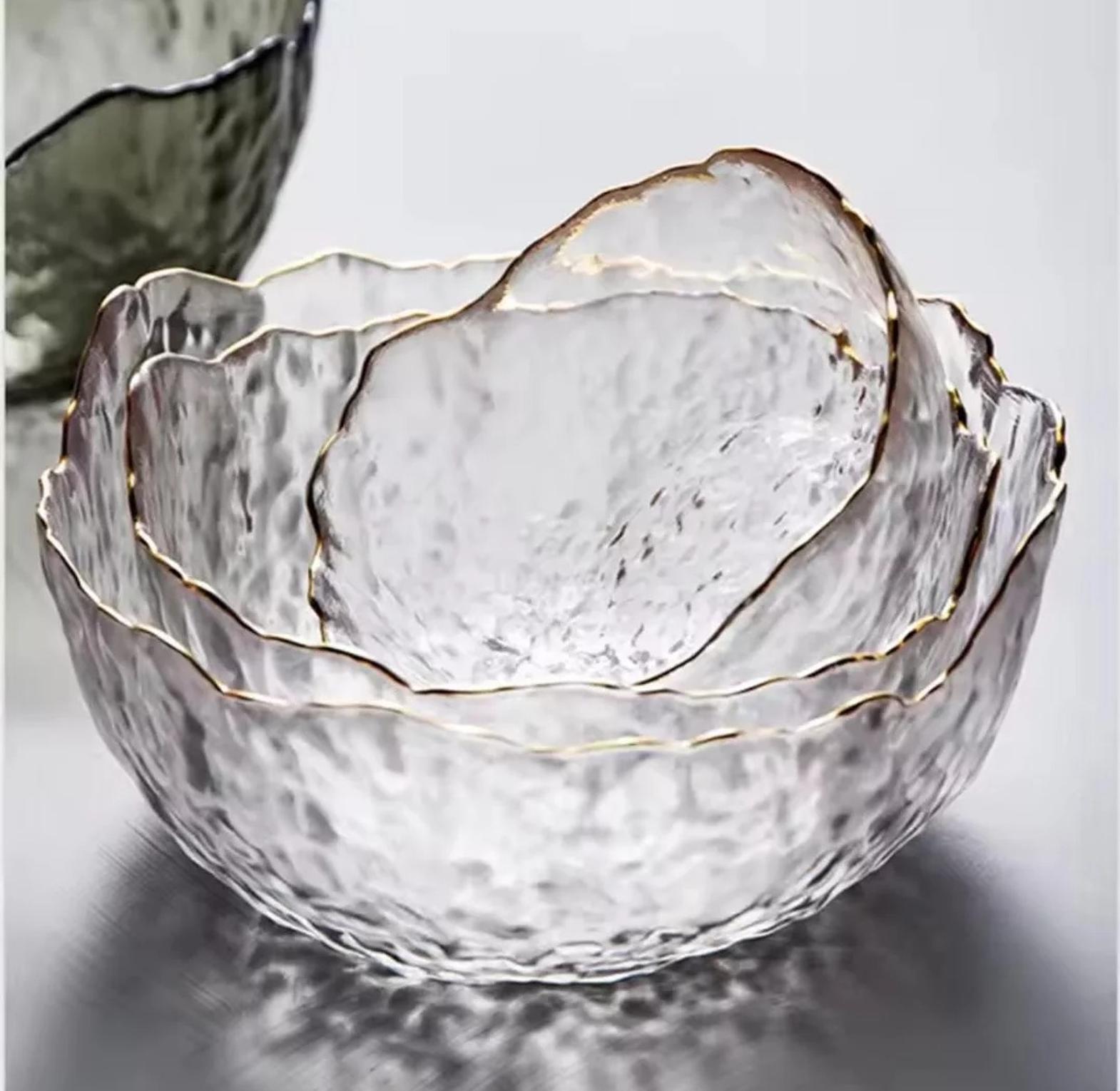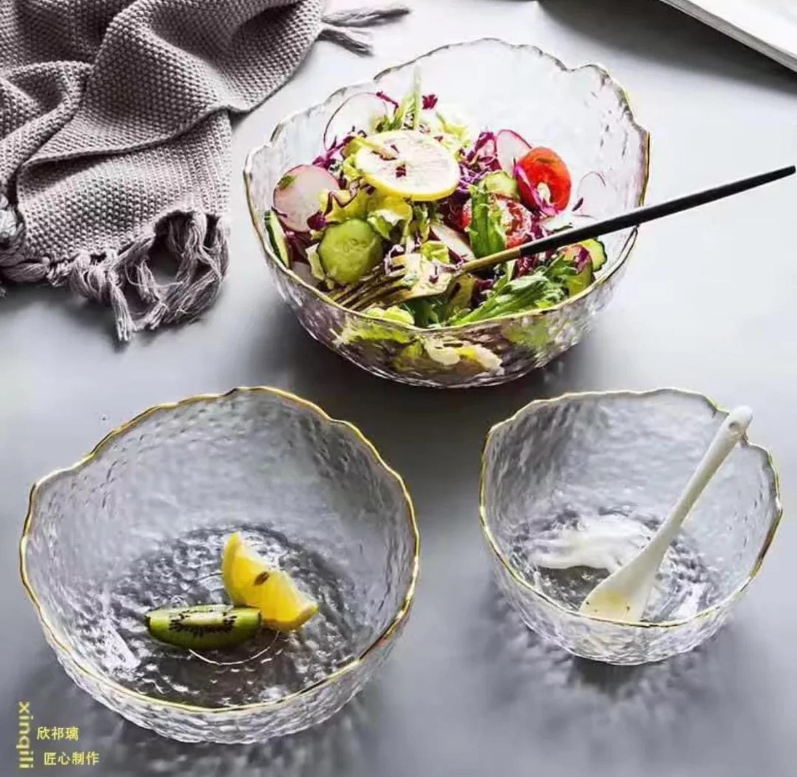 Enhance your table setting with the captivating beauty and practical design of the 3pcs Set Salad/Fruit Gold-Rimmed Serving Bowls. This versatile 3-piece set is an essential addition for any host or culinary enthusiast, designed to showcase your salads, fruits, and delectable desserts in stunning style. Each bowl is crafted from high-quality, clear glass, featuring a distinctive hammered texture that creates a mesmerizing play of light and shadow, adding depth and character to your presentation. The irregular, organic rim of each bowl is delicately finished with an elegant gold accent, providing a luxurious touch that beautifully complements any décor. The set includes three convenient capacities: a spacious 1050ml bowl ideal for large salads or fruit platters, a versatile 700ml bowl perfect for side dishes or individual servings, and a charming 300ml bowl suitable for nuts, dips, or small desserts. These bowls are great for serving at dinner parties, family gatherings, or for adding a touch of everyday luxury to your meals. Their durable construction ensures long-lasting use, while their exquisite design makes them a truly eye-catching centerpiece.