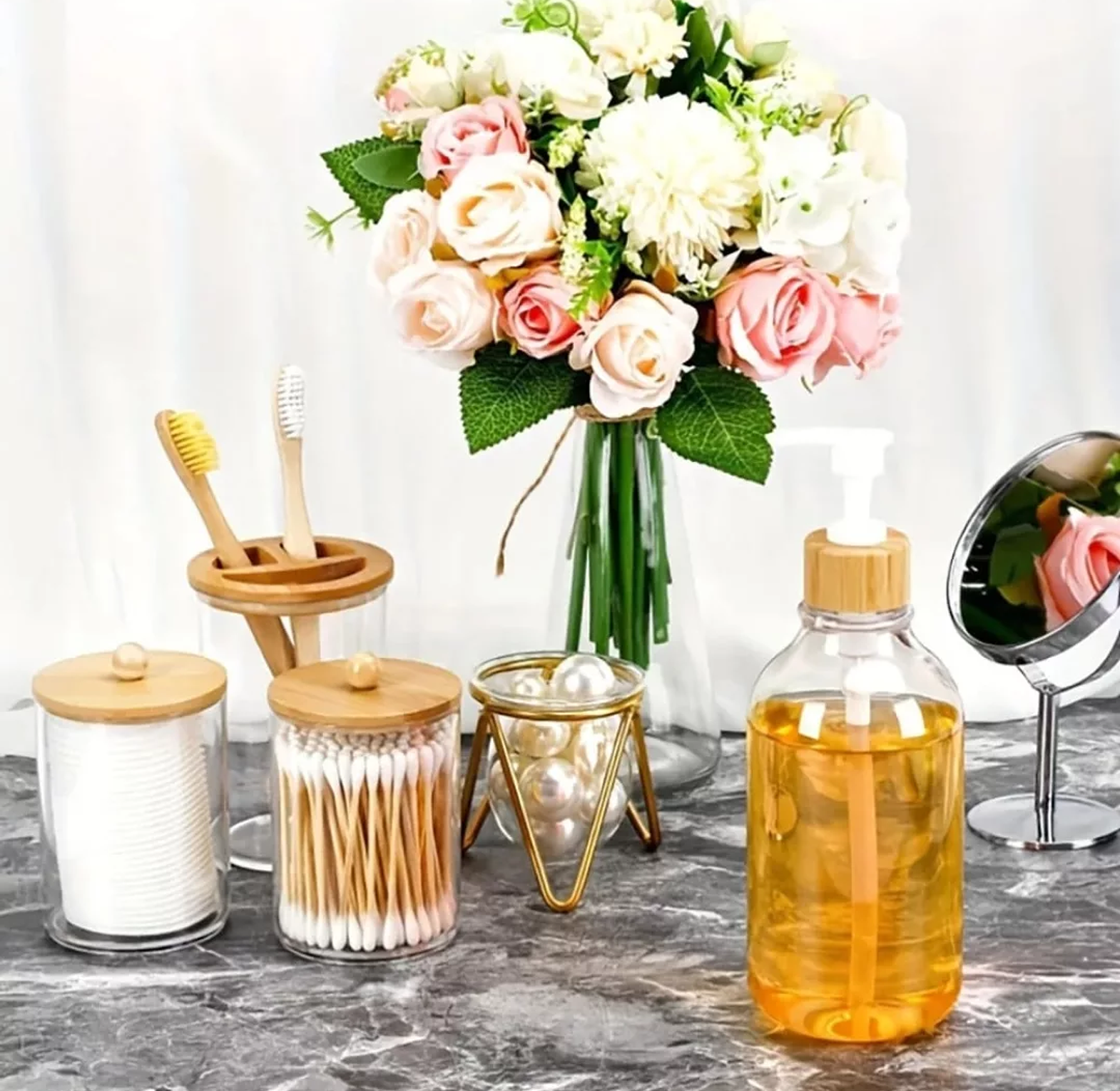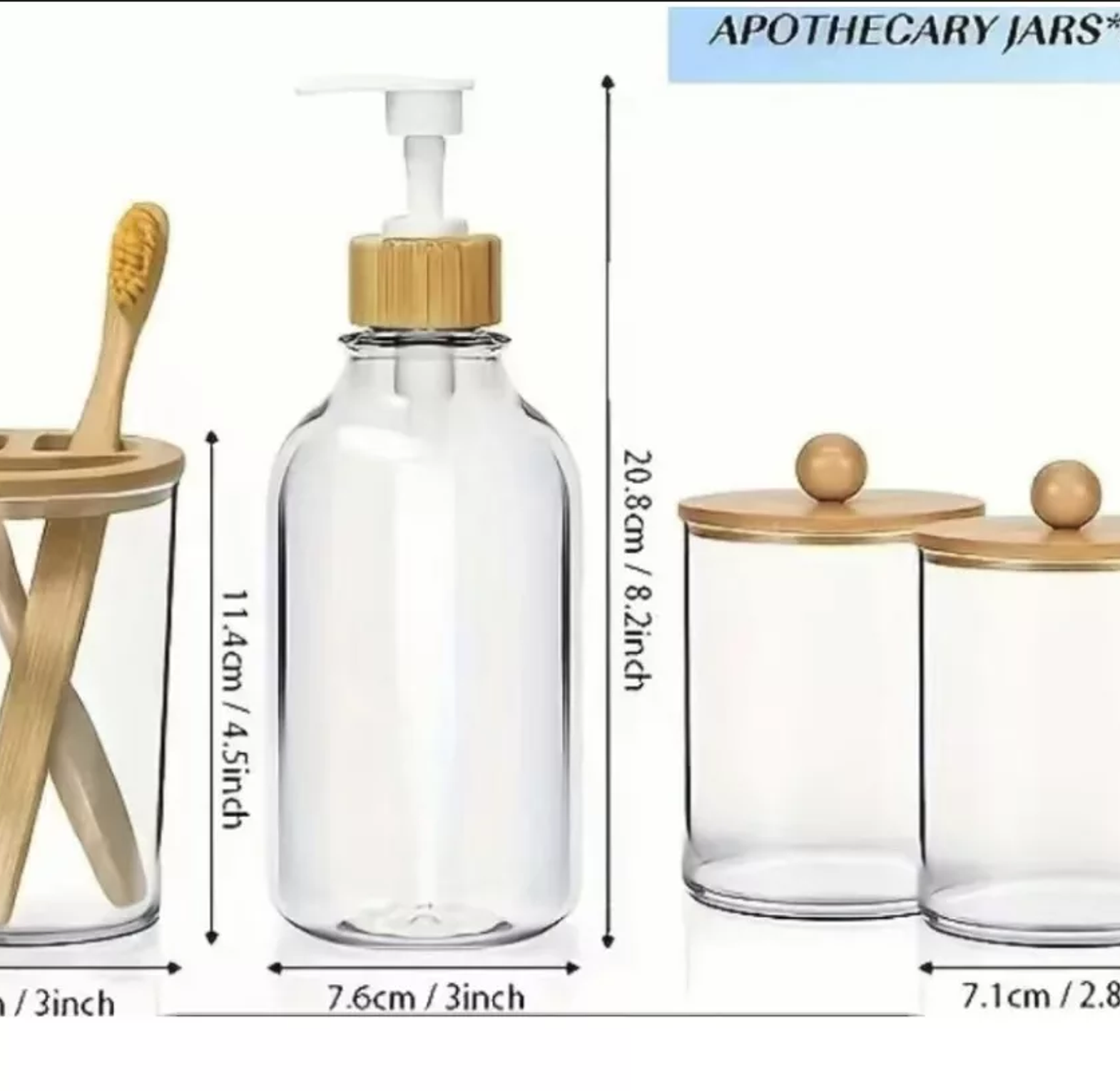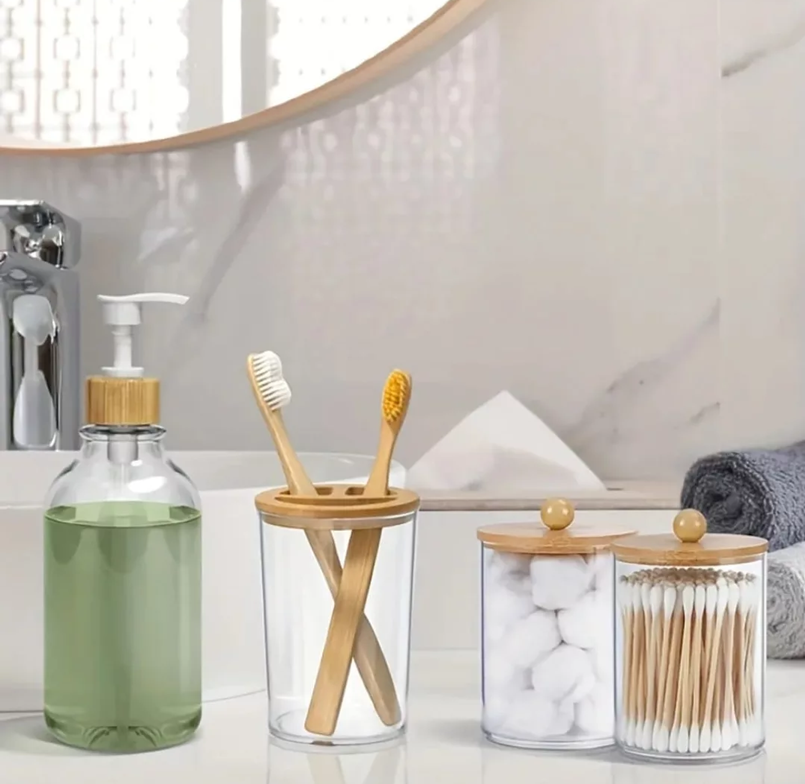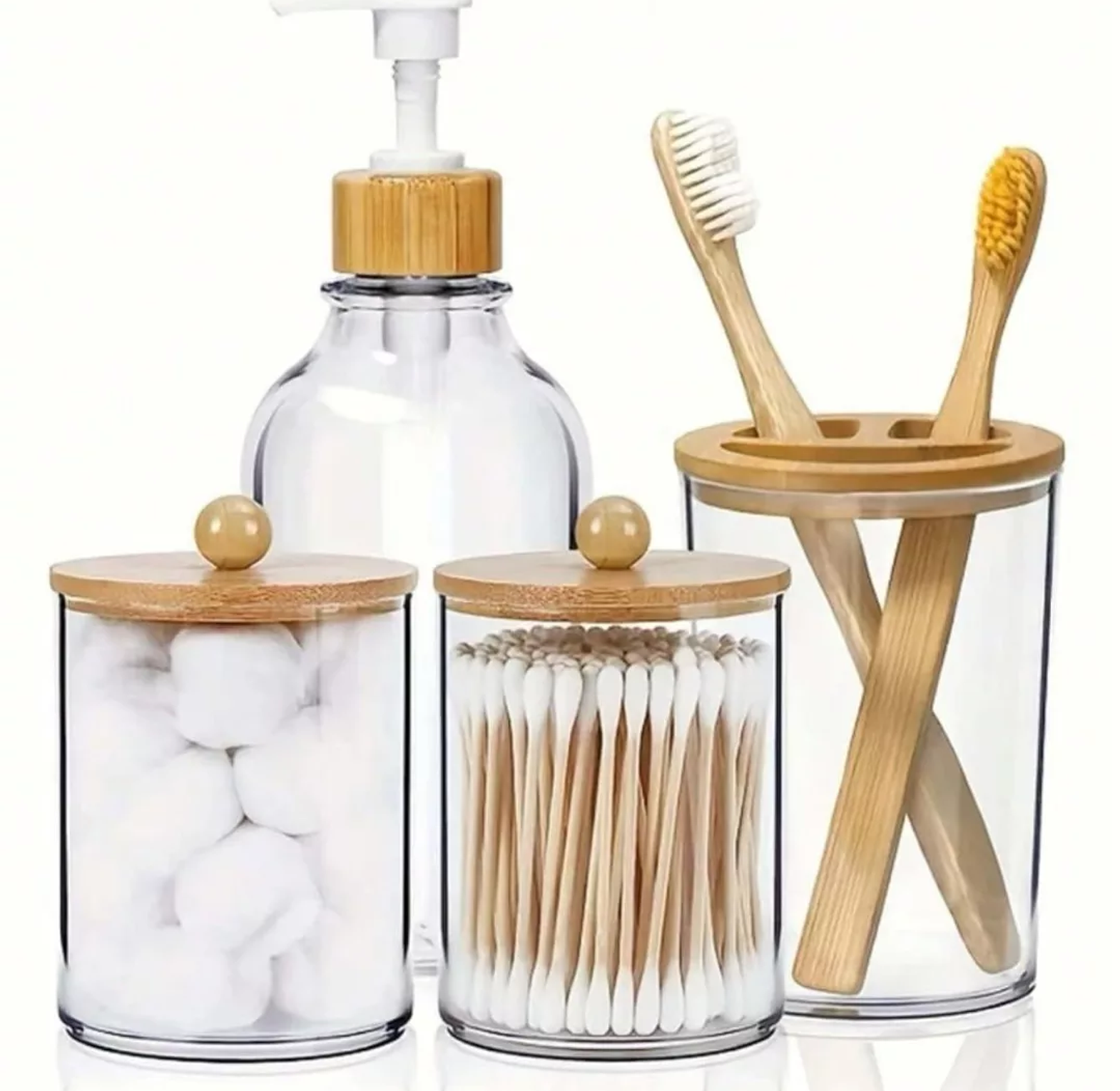 Transform your bathroom into a cozy, organized space with this 4-piece bamboo bathroom accessories set, designed in a rustic boho style to complement modern and natural interiors. The set includes a soap dispenser, toothbrush holder, and two cotton swab holder jars, offering both style and practicality. Made from a blend of PET and durable plastic, these accessories are lightweight, easy to clean, and long-lasting. Perfect for adding a warm, earthy touch to your bathroom décor, this set combines everyday convenience with eco-inspired elegance.