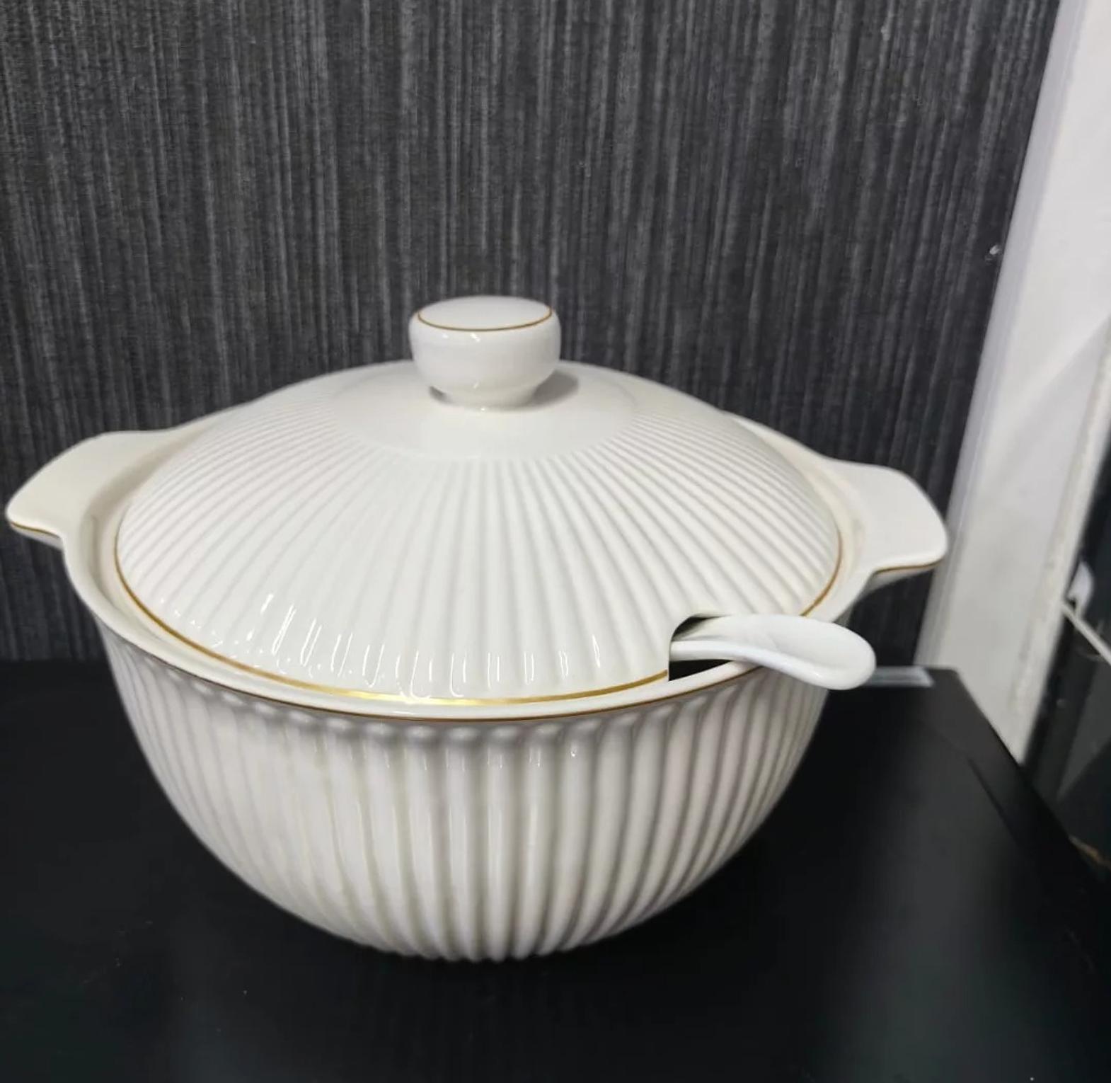 Present your culinary creations with elegance using our Elegant Fluted Ceramic Serving Dish with Lid & Spoon. This beautifully crafted dish is designed for both functionality and aesthetic appeal, making it an ideal centerpiece for family meals, dinner parties, or special occasions. With a generous 4-liter capacity, it's perfect for serving soups, stews, casseroles, salads, or any large-batch dish.