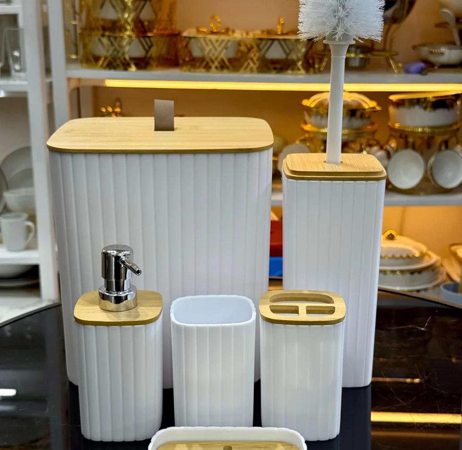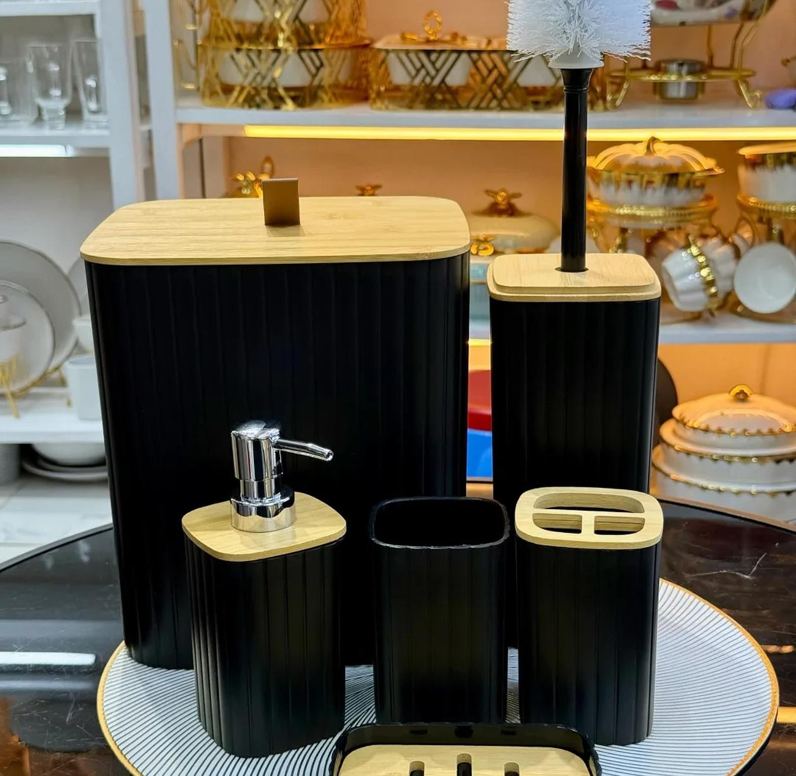 Transform your bathroom into a more organized and aesthetically pleasing space with this contemporary 6-in-1 Bathroom Accessory Set. This comprehensive collection includes all the essentials you need: a convenient trash can, a discreet toilet brush with its holder, a functional lotion dispenser, a practical toothbrush holder, a versatile toothbrush cup, and a tidy soap dish. Each piece is designed with a sleek, clean finish, complemented by elegant bamboo wooden tops that add a touch of natural warmth and sophistication. The thoughtful design ensures both durability and ease of use. Available in classic black, crisp white, and modern grey, this set allows you to easily match your existing bathroom decor. It's the perfect way to unify your bathroom's style while keeping everything neatly arranged and readily accessible.