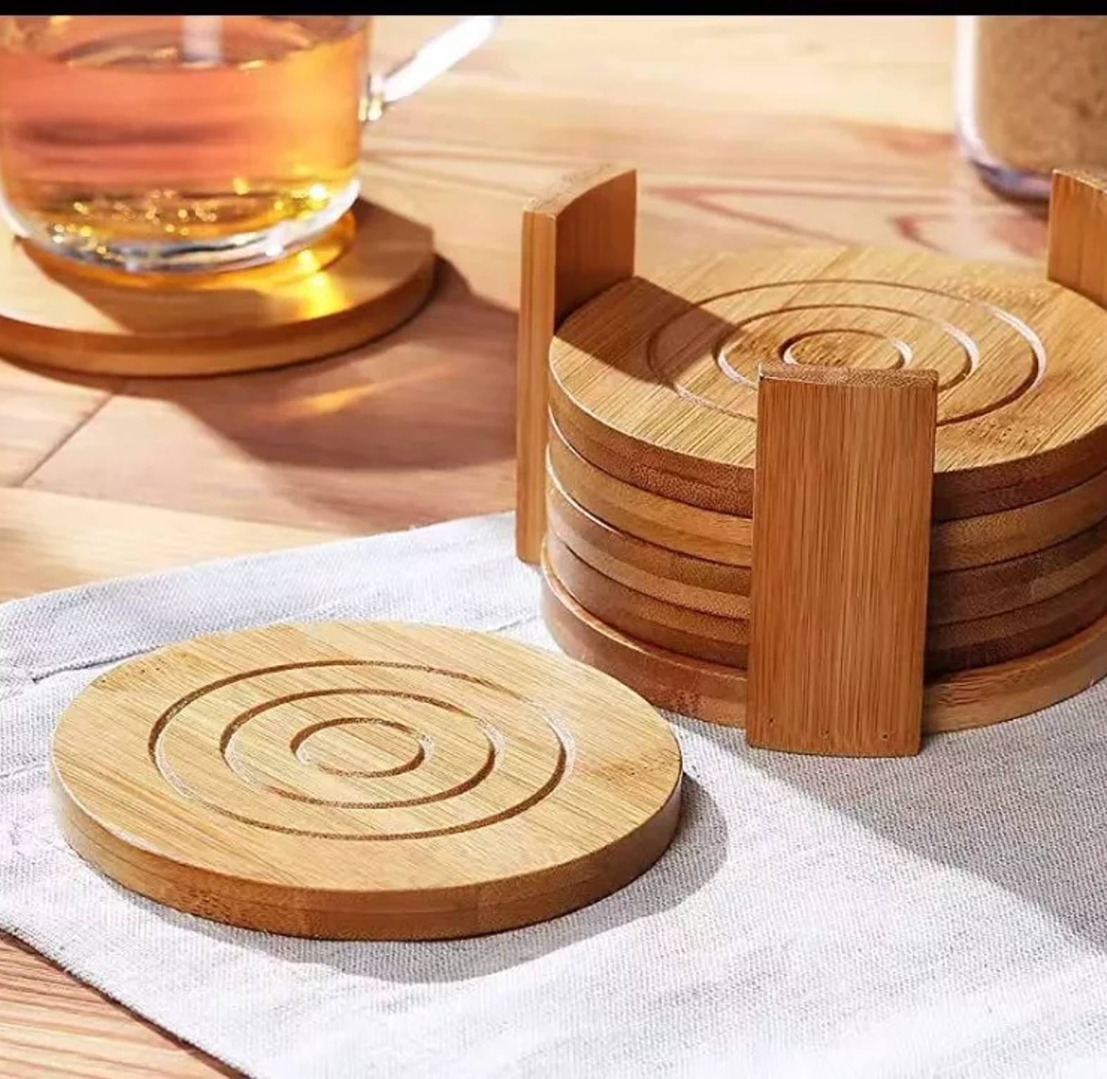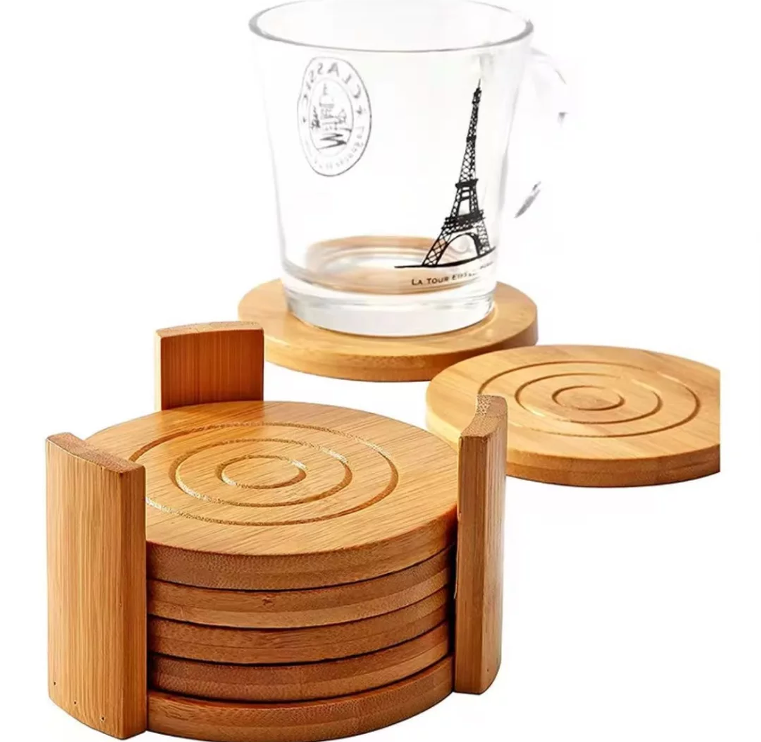 Introduce a functional and stylish accessory to your living space with this 6-piece set of premium bamboo coasters. Each piece is made from natural bamboo, offering an eco-friendly and remarkably durable solution for protecting your valuable tabletops. The material naturally resists moisture and heat damage, effectively shielding surfaces from stains, scratches, and the rings left by hot or cold drinks. The circular design, featuring a subtle concentric pattern, accommodates all standard cups, mugs, bottles, and glasses. The set includes a matching, vertically oriented bamboo holder that keeps all six coasters neatly stacked and organized when not in use, ensuring a clean and clutter-free look on your coffee table or counter.