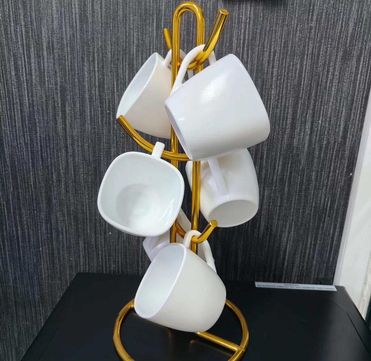 The set is completed by a striking gold-finished metal display stand, which not only provides a space-saving storage solution but also acts as a beautiful decorative accent for your countertop. The sturdy stand keeps your mugs organized and easily accessible, while its elegant design adds a luxurious touch. Ideal for both everyday use and entertaining guests, this versatile mug set makes a thoughtful gift and is an essential addition to any home seeking a blend of practicality and sophisticated style.