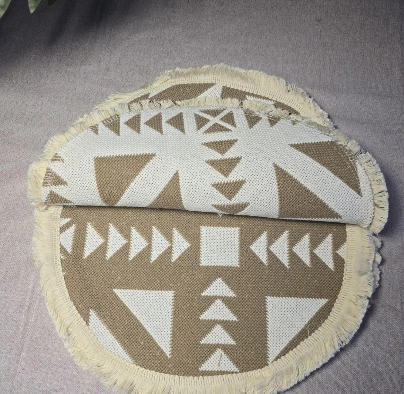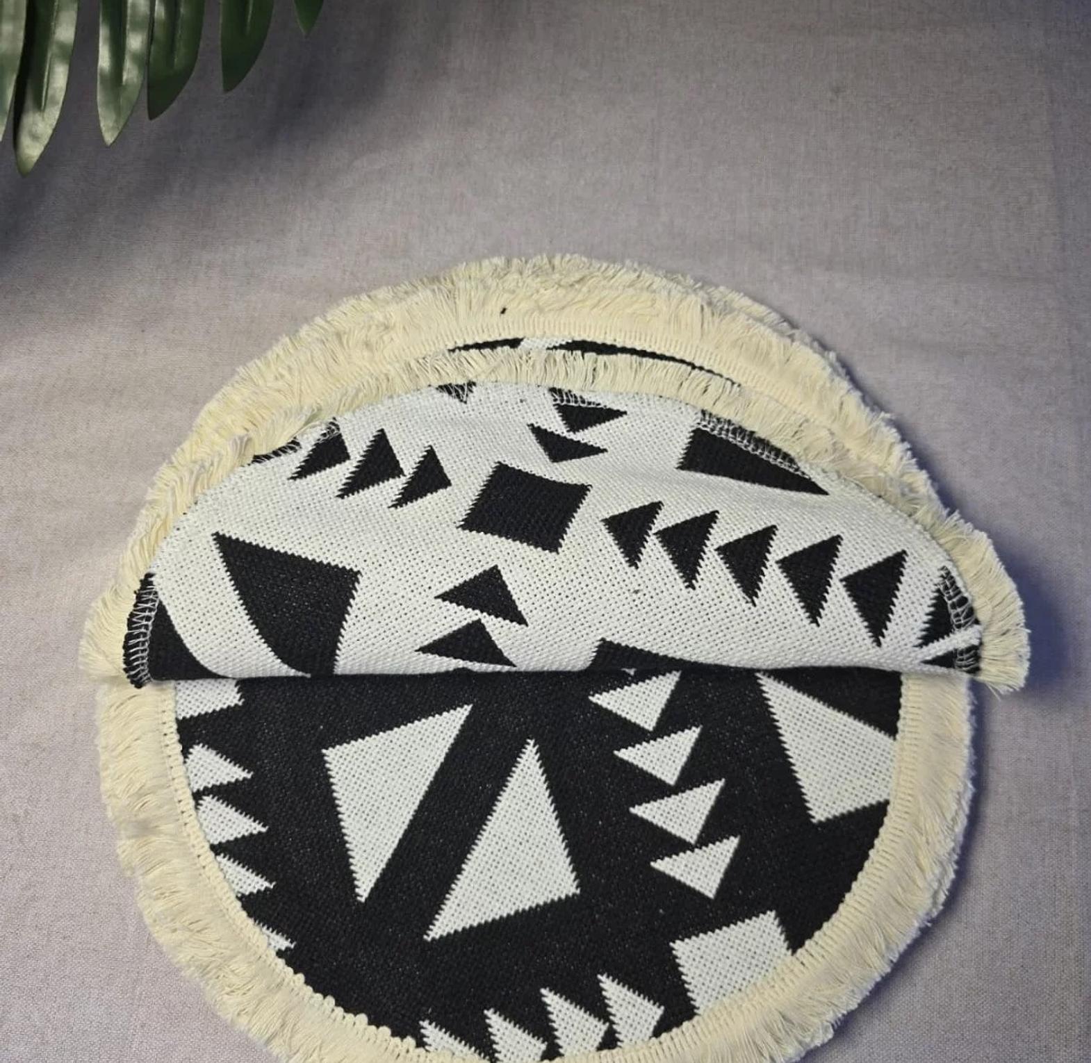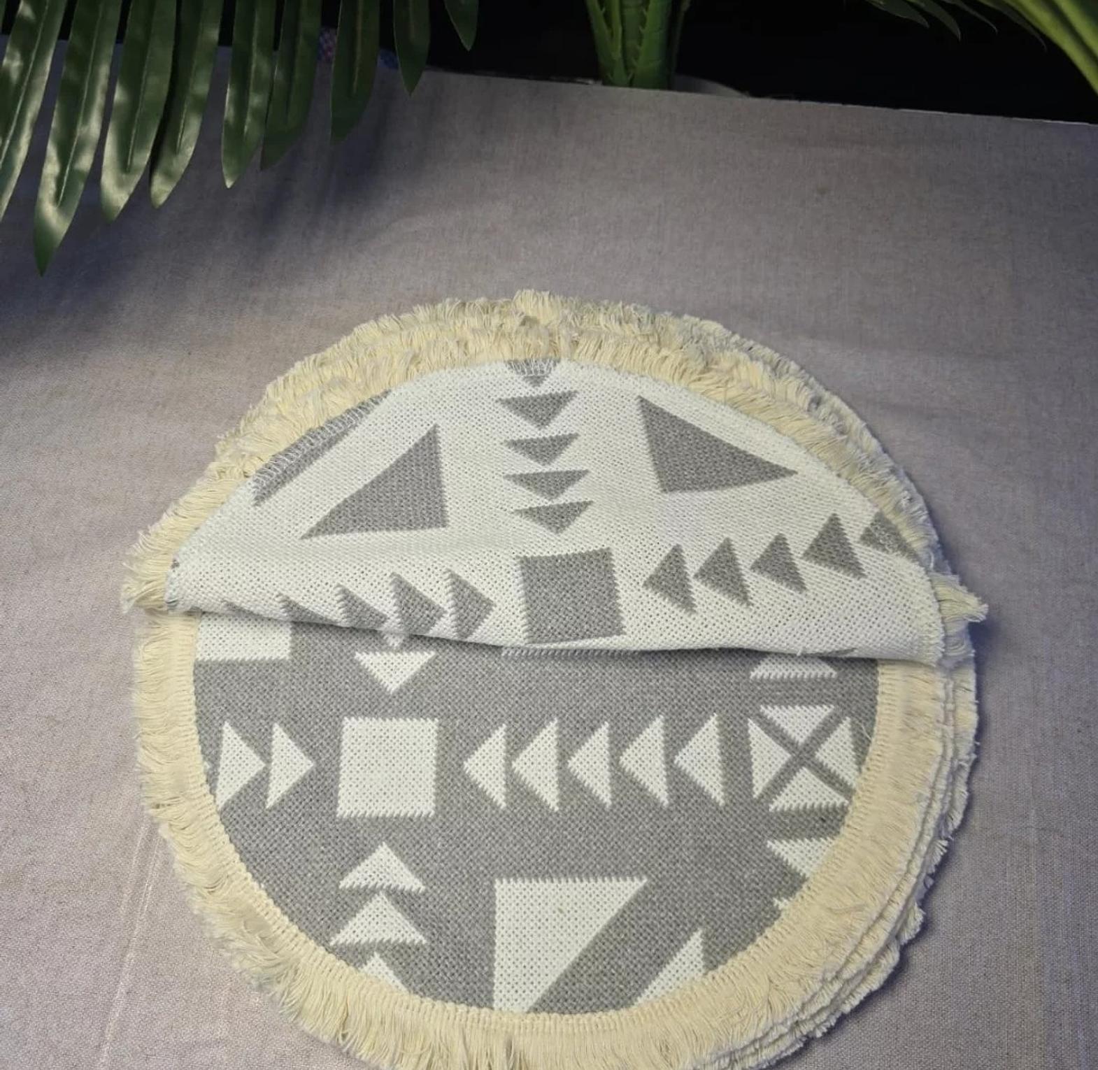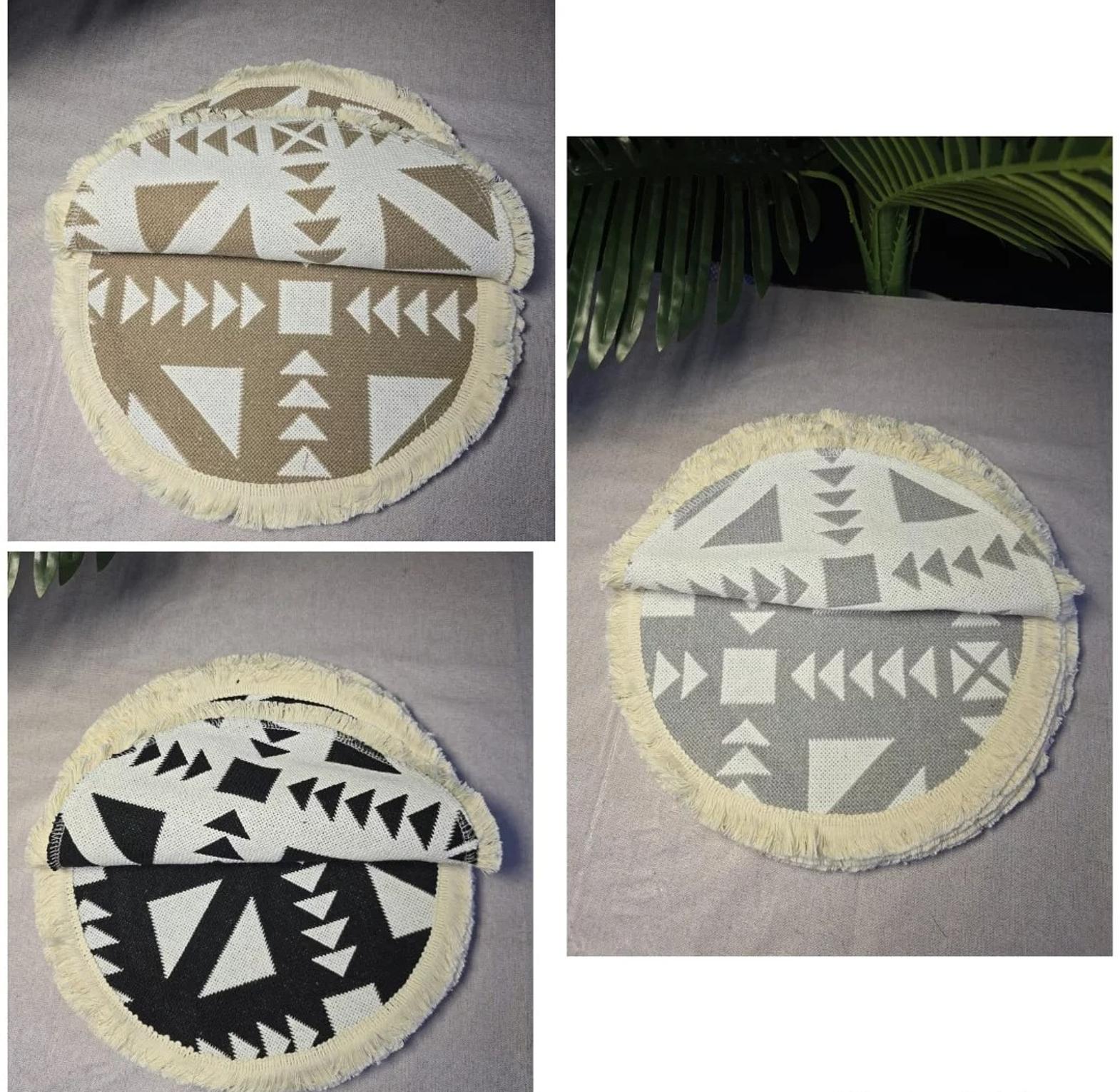 Elevate your dining presentation with the Geometric Fringe Reversible Placemats, a captivating set of six handcrafted pieces that combine unique design with practical versatility. Each placemat is meticulously hand-made from a soft and durable cotton-blended linen material, ensuring both a pleasant tactile experience and long-lasting quality. What truly sets these placemats apart is their double-sided design, featuring distinct yet complementary geometric patterns on each face. This allows you to effortlessly refresh your table setting by simply flipping them over, offering two looks in one. The edges are adorned with playful, soft fringing, adding a touch of bohemian charm and textural interest. These placemats are designed to coordinate beautifully with the matching Geometric Bloom Double-Sided Table Runner (as previously described, with available colors in black, grey, and brown patterns), creating a cohesive and stylish dining ensemble. Perfect for everyday meals or special occasions, they protect your table surfaces while adding a sophisticated and artistic flair. This unique set is a must-have for those seeking handmade placemats, reversible table linens, cotton linen blended decor, geometric dining accents, and distinctive table settings.