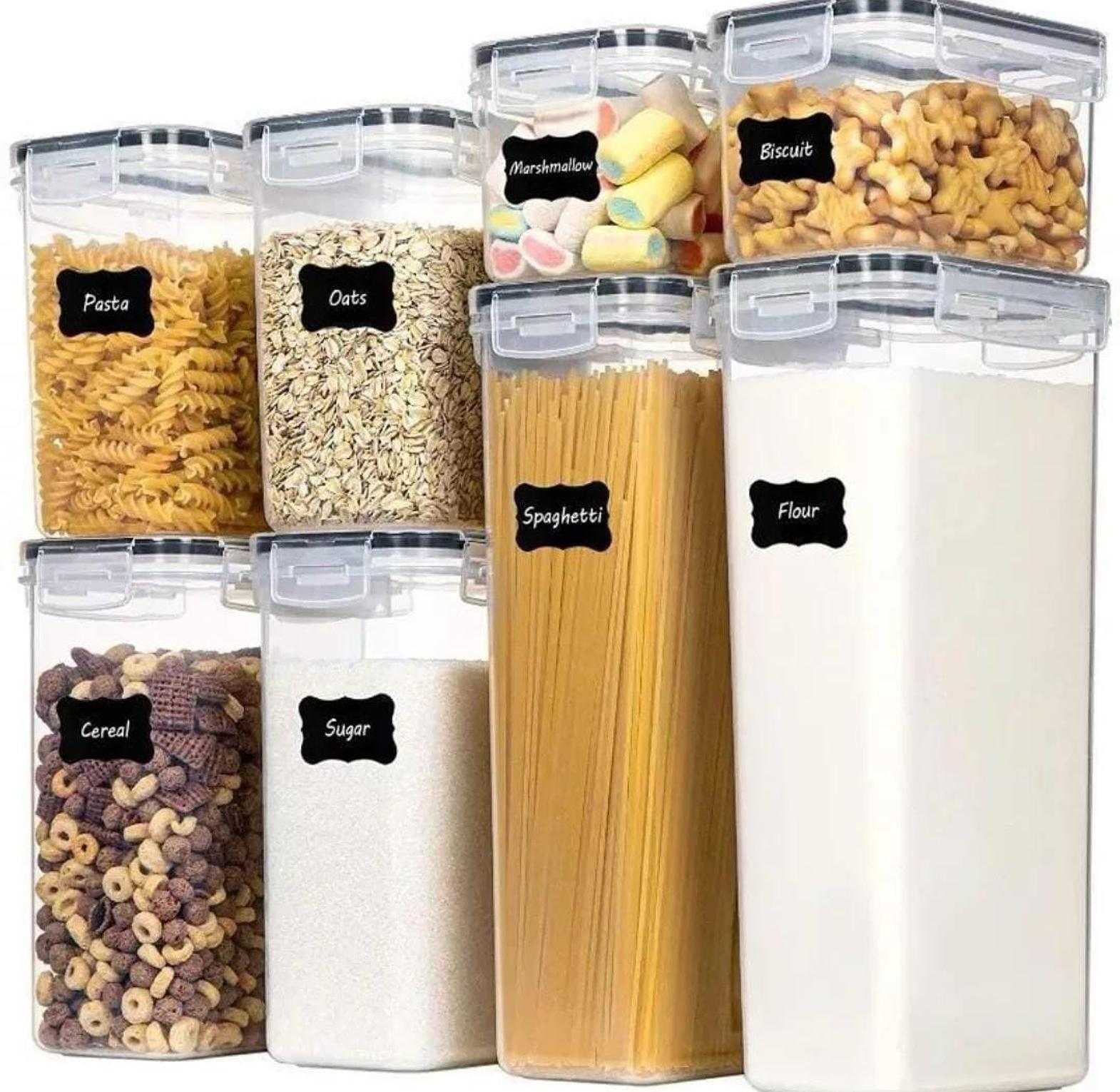 Keep your kitchen effortlessly organized with this 8 pcs Food/Pantry Storage Container Set, designed to bring both order and elegance to your pantry. Made from durable, BPA-free plastic with airtight lids, these containers help preserve the freshness of dry goods like grains, pasta, flour, snacks, and cereals. The clear, stackable design allows for easy visibility and space-saving storage, making it simple to find what you need at a glance. Ideal for busy households or anyone looking to maintain a clutter-free kitchen, this set not only boosts functionality but also adds a clean, modern look to your shelves. Whether you're meal prepping, bulk-storing, or just keeping things tidy, these containers are a must-have kitchen essential.