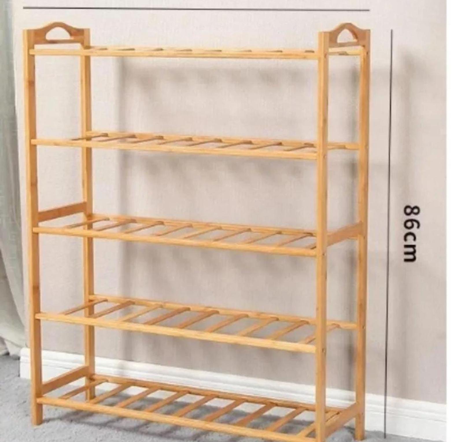 Organize your footwear neatly with this 5-layer bamboo shoe rack, crafted from durable, eco-friendly bamboo for strength and timeless appeal. Its multi-tier design provides ample space for shoes, sandals, and boots, helping you keep your entryway or closet clutter-free. The open slatted shelves allow for air circulation, keeping shoes fresh, while the smooth finish adds a warm, natural touch to your home décor. Lightweight yet sturdy, it’s easy to assemble and perfect for bedrooms, hallways, or walk-in closets.