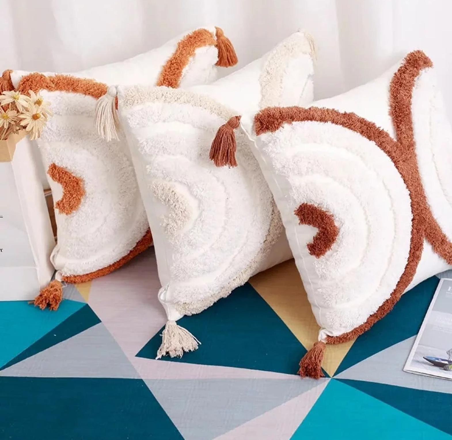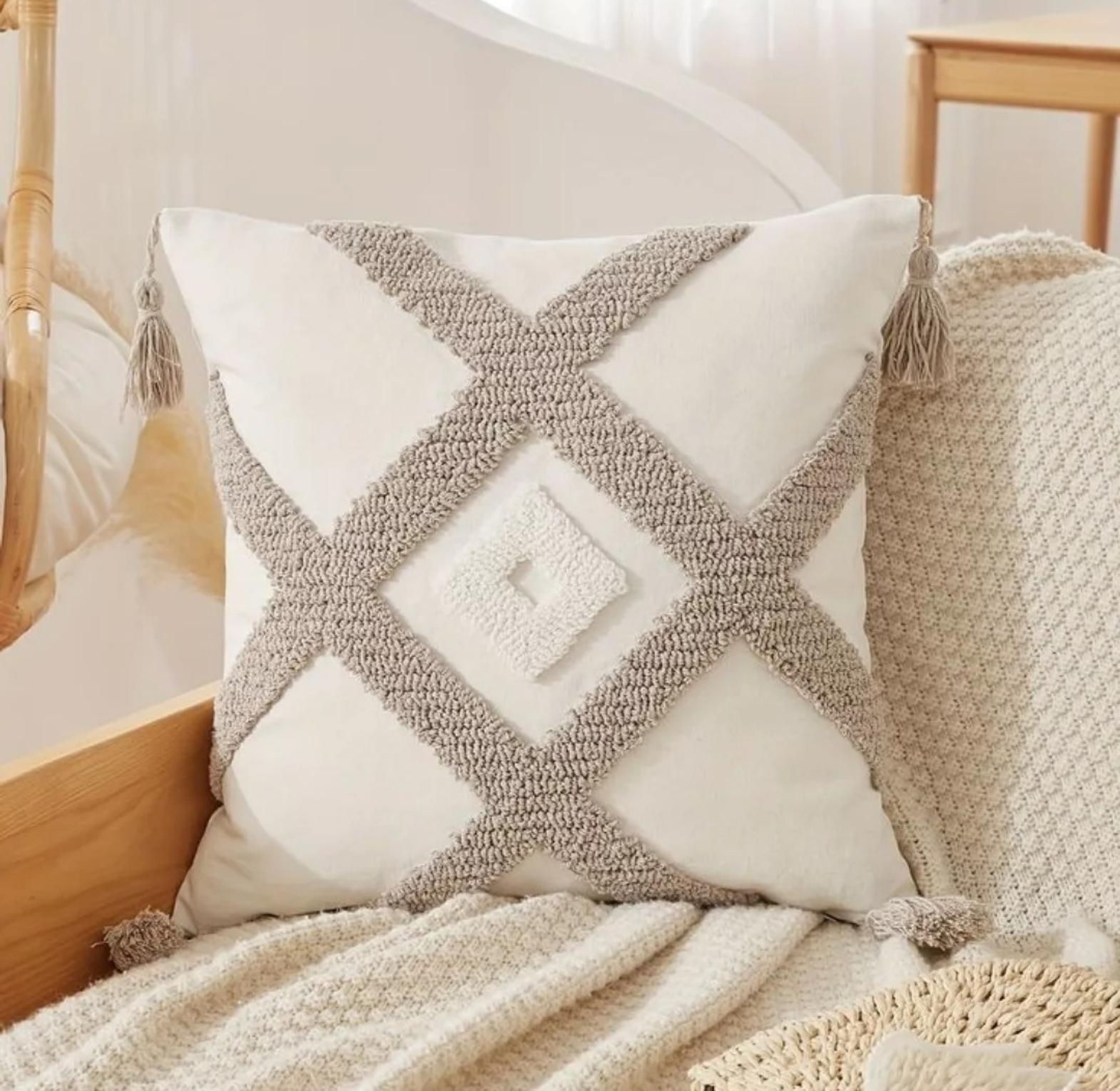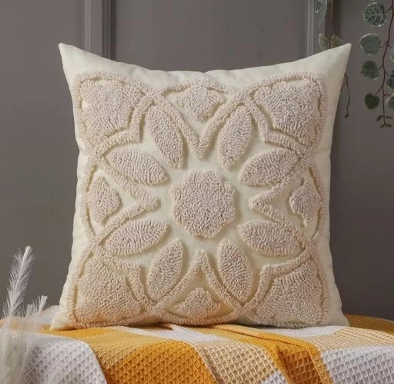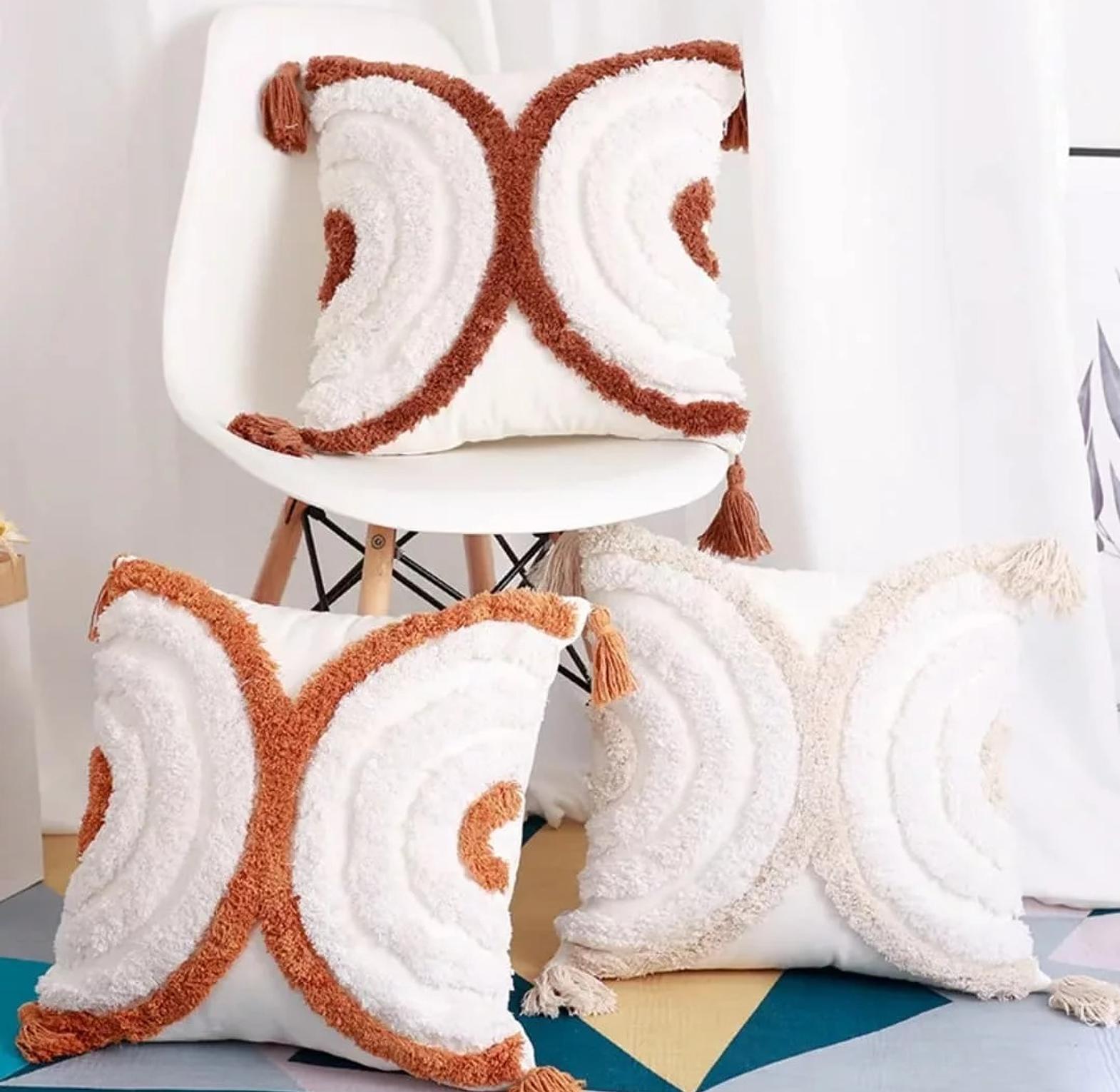 Elevate your home decor with the captivating Boho Bloom Tufted Tassel Throw Pillow Cover, designed to bring a relaxed, artistic vibe to your living space. Measuring a versatile 45 x 45 cm (18 x 18 inches), this pillow cover is the ideal size for sofas, chairs, beds, or accentuating any cozy corner. Crafted with a delightful tufted pattern, it offers a rich, tactile texture that invites comfort and visual interest. The distinctive boho-inspired design is beautifully accented with charming tassels on each corner, adding a playful and authentic bohemian touch. Made from high-quality, durable fabric, the BohoBloom cover is soft to the touch and built to withstand everyday use, ensuring long-lasting beauty. Its neutral yet expressive color palette (as seen in the image, featuring white with earthy accents) makes it easy to integrate into various interior styles, from eclectic bohemian to modern farmhouse. Instantly refresh your living room or bedroom with this stylish and comfortable accent piece. This pillow cover is a must-have for those seeking boho throw pillows, textured cushion covers, tassel pillow designs, square decorative pillows, and bohemian home decor accents.