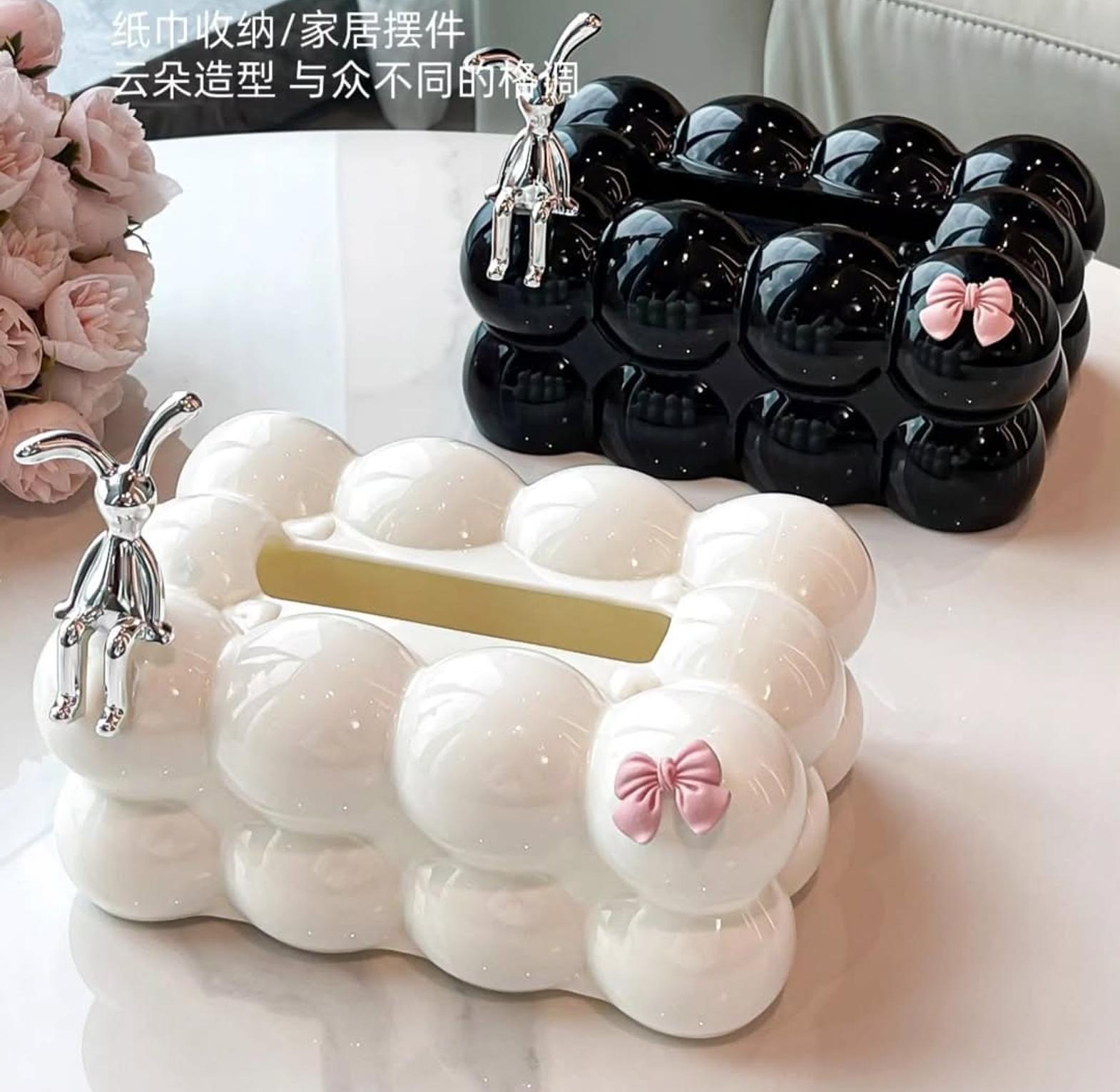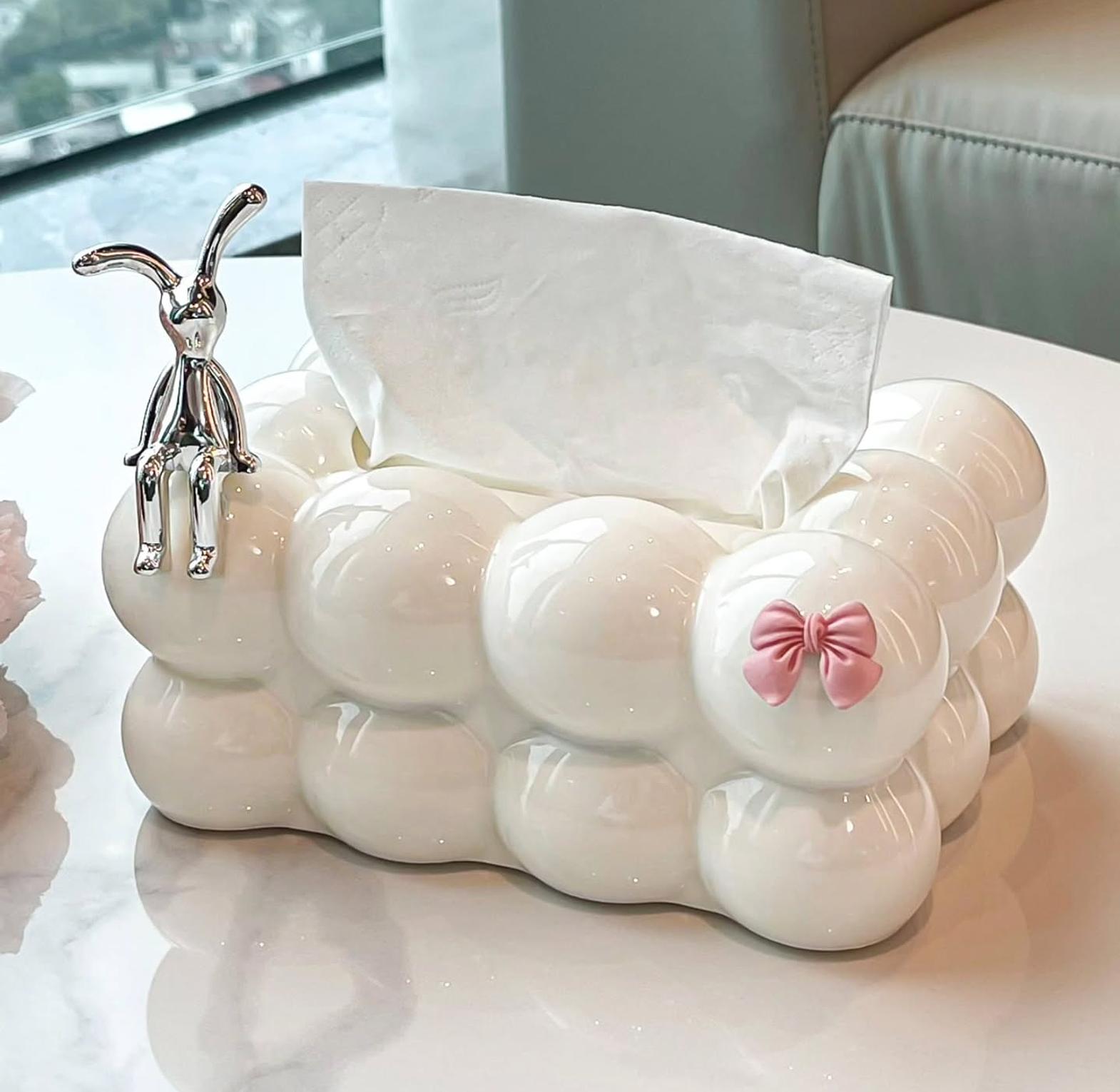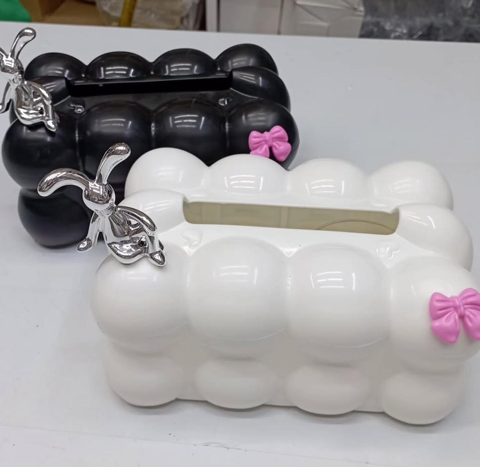 Elevate your space with the bubble tissue box/serviette holder, a decorative yet functional accent designed to blend seamlessly with modern interiors. Featuring a playful bow and bunny figurine detail, this holder adds a touch of charm while keeping tissues neatly stored and easily accessible. Available in classic white and black, it’s versatile enough for living rooms, bedrooms, offices, or bathrooms, offering both practicality and style. Durable, elegant, and easy to use, this tissue box cover is the perfect accessory to complement any décor.