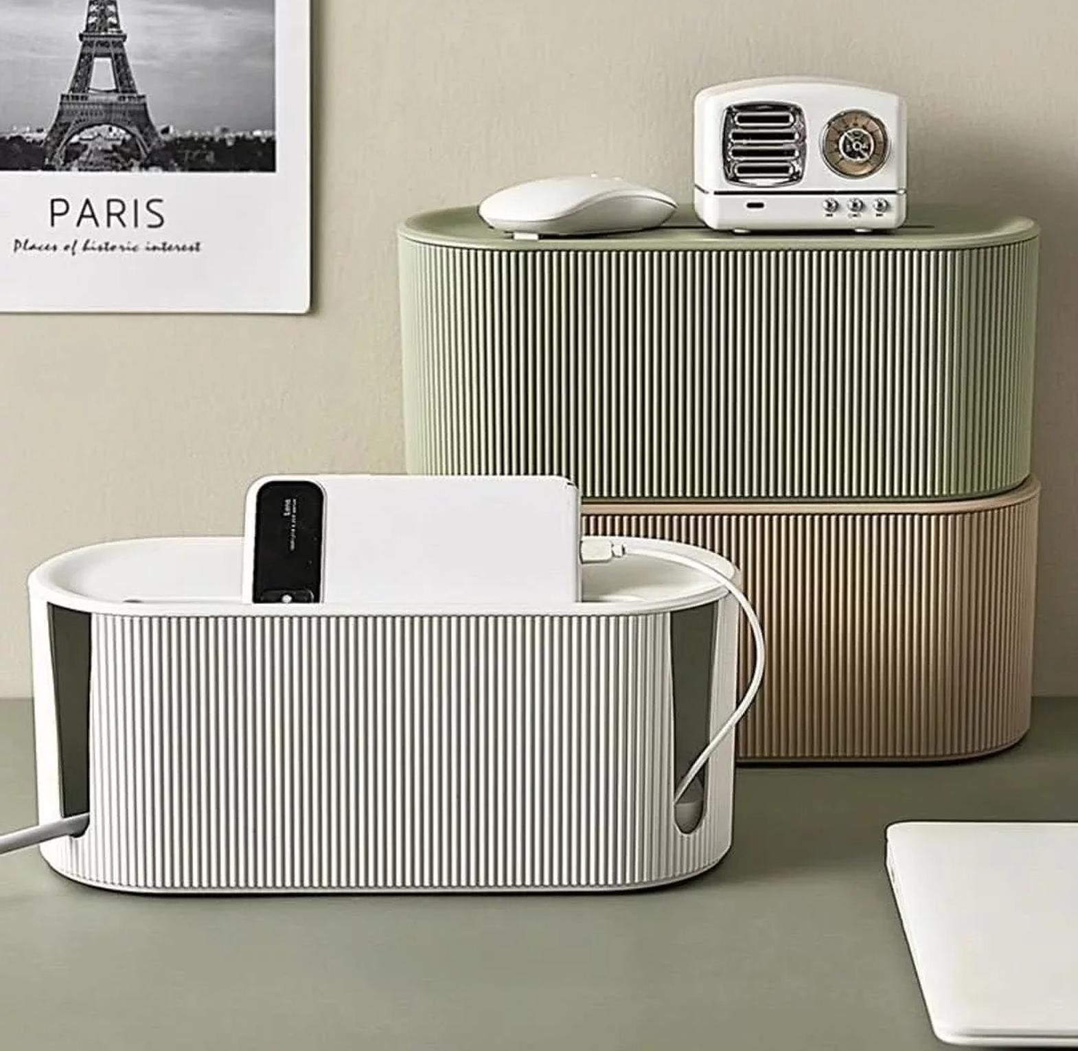 Achieve a clean and organized aesthetic in your home or office with this Modern Cable Management & Storage Box. This essential organizer is expertly designed to effectively conceal power strips, adapters, and excess cables, transforming messy tangles into a neat and streamlined setup. By enclosing your cords, it not only reduces visual clutter but also prevents dust accumulation and enhances safety by minimizing tripping hazards, especially important in homes with children or pets. The box features convenient openings on the sides to allow cables to enter and exit smoothly, while the top surface provides a stable platform for charging devices or placing small items. Perfect for use under desks, next to entertainment centers, or on bedside tables, this cable storage box is a practical and stylish solution to keep your cables well-organized and maintain a polished look in any room.