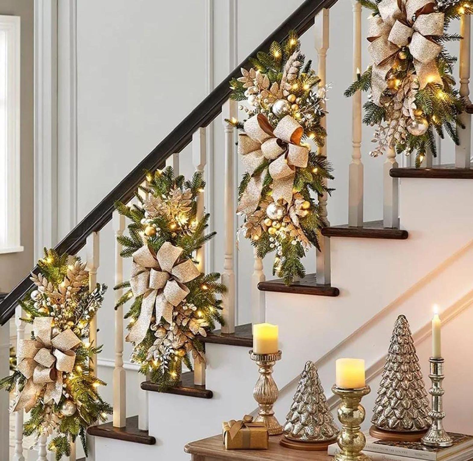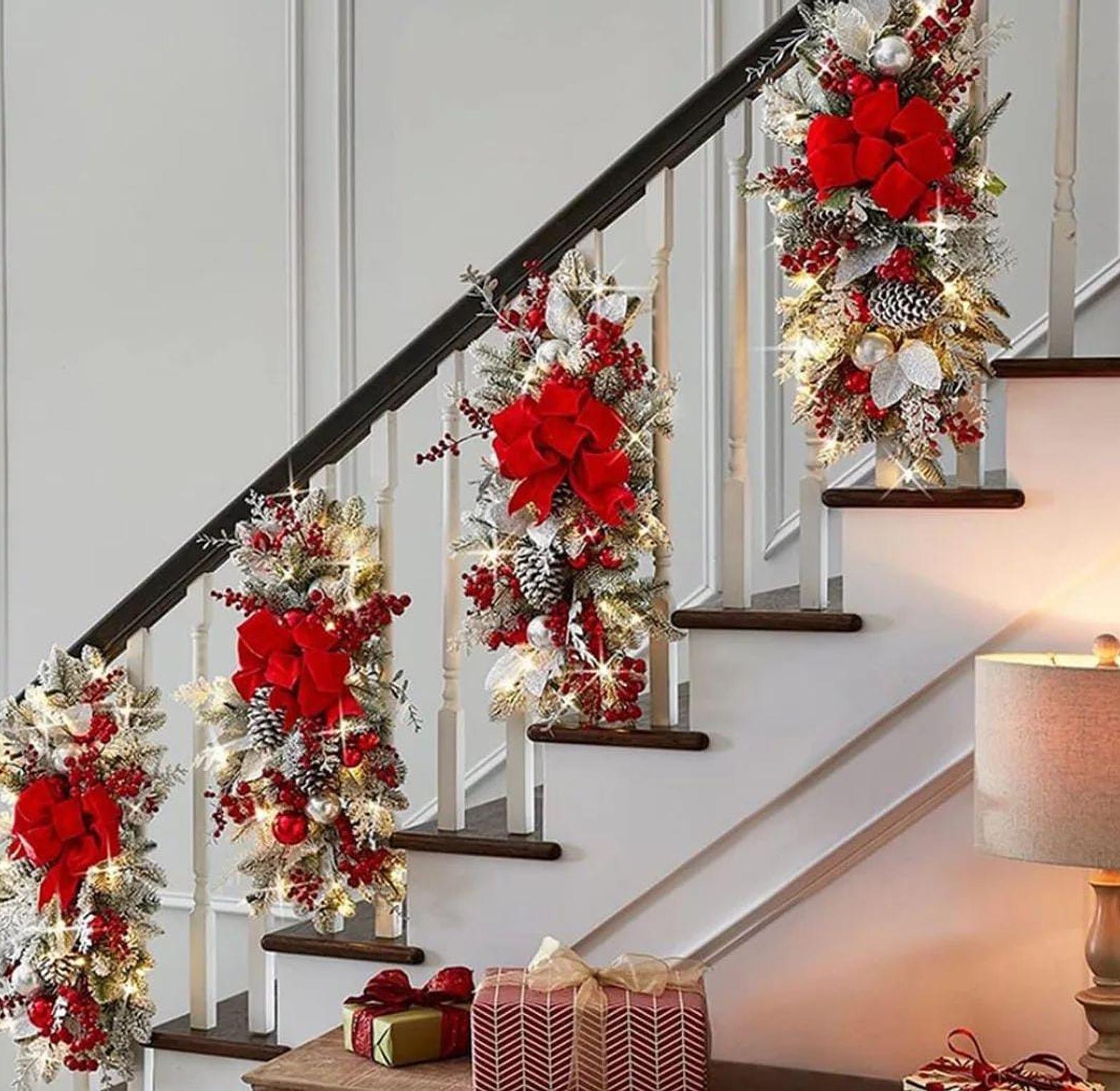 Our Christmas swag wreath pendants bring festive elegance to your home, designed with LED lights that add a warm, glowing ambiance to your decorations. The beautiful swag features rich greenery, festive ribbons, and decorative trims, creating a welcoming and joyful atmosphere for your staircase, doors, windows, or any space that needs a holiday touch. The built-in LED lights illuminate the wreath, creating a soft, twinkling effect that adds depth and sparkle to your decor. Whether used indoors or outdoors, this versatile ornament can be easily hung and styled to suit your Christmas theme, making it a perfect addition to your seasonal decorations.