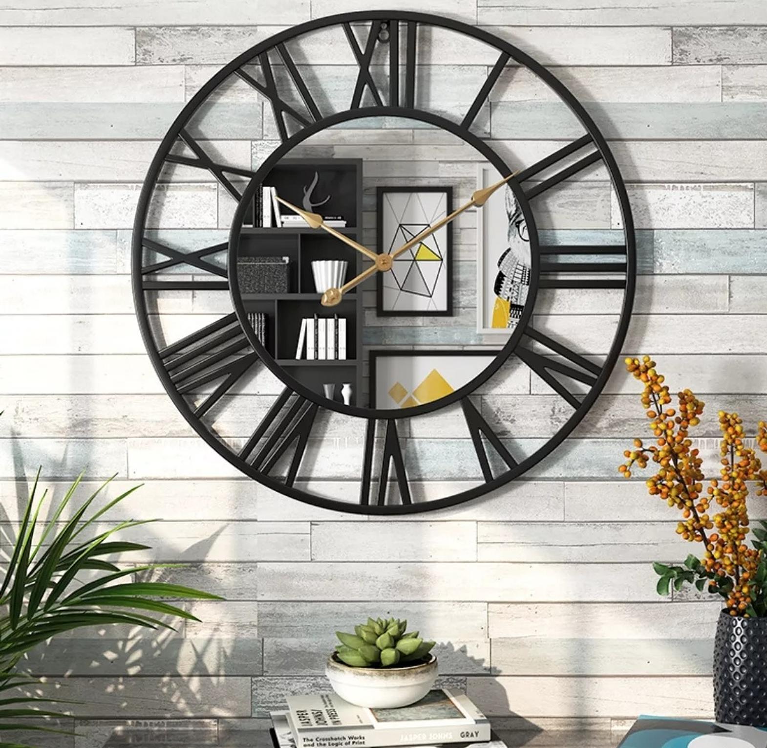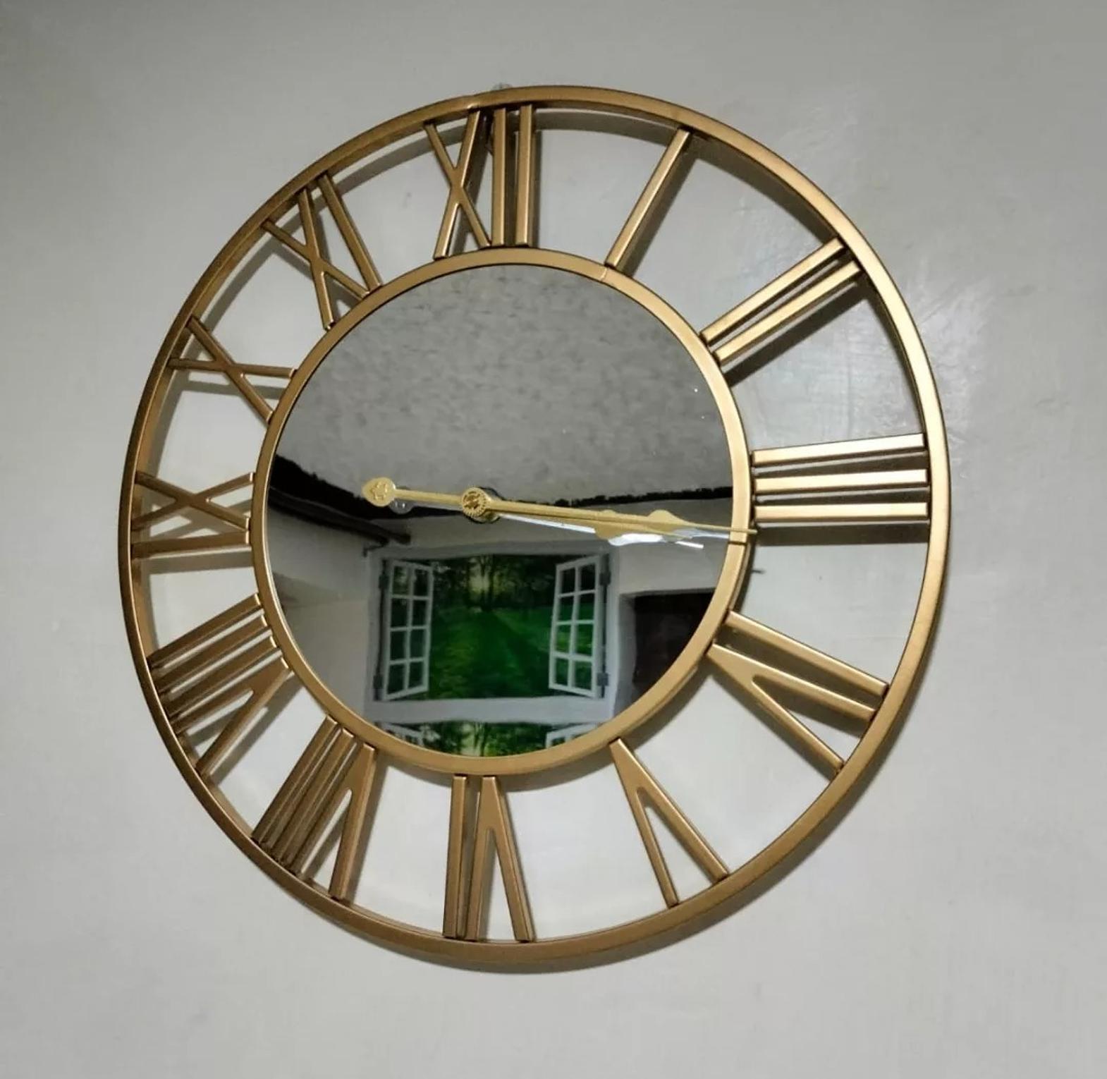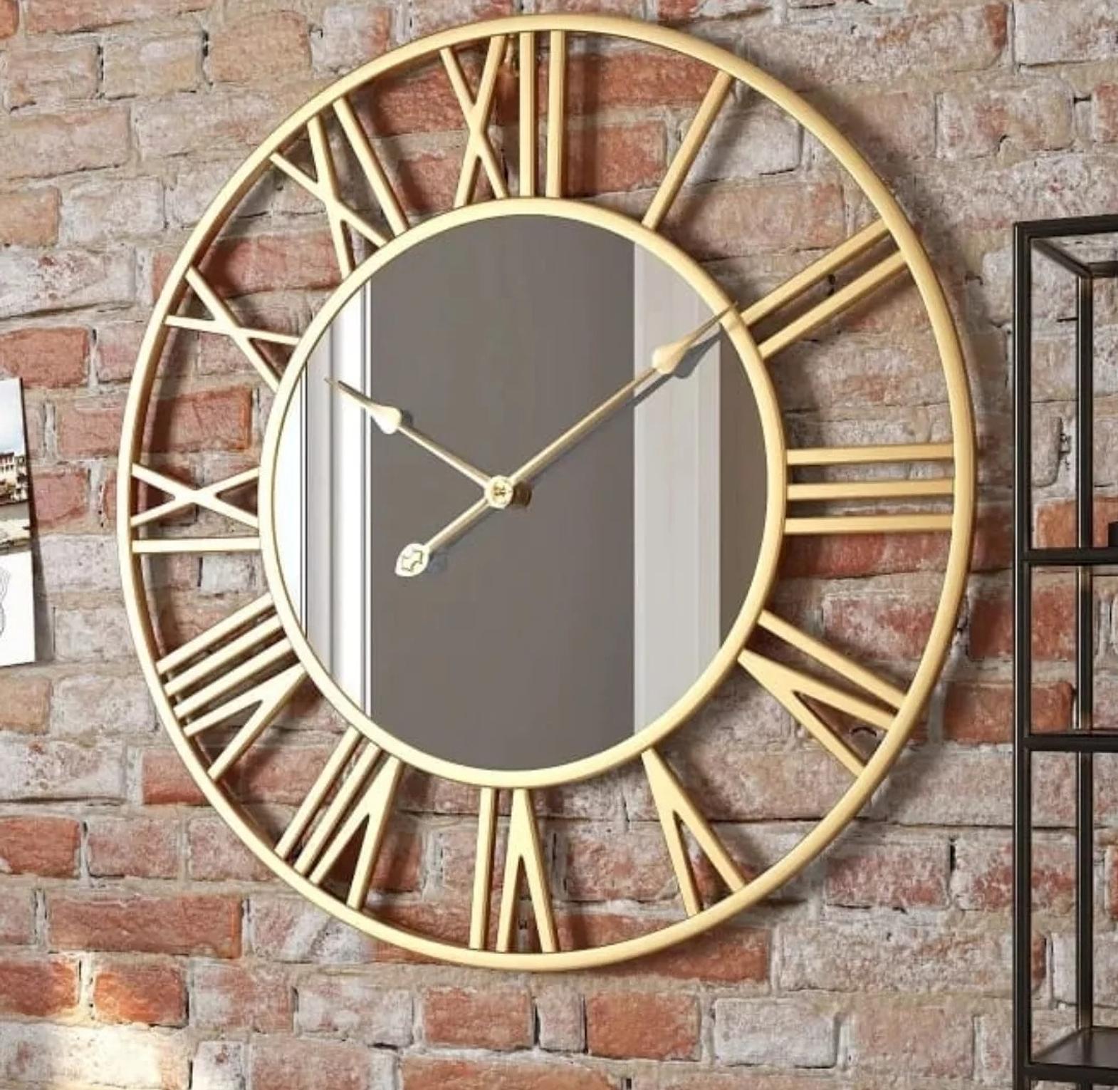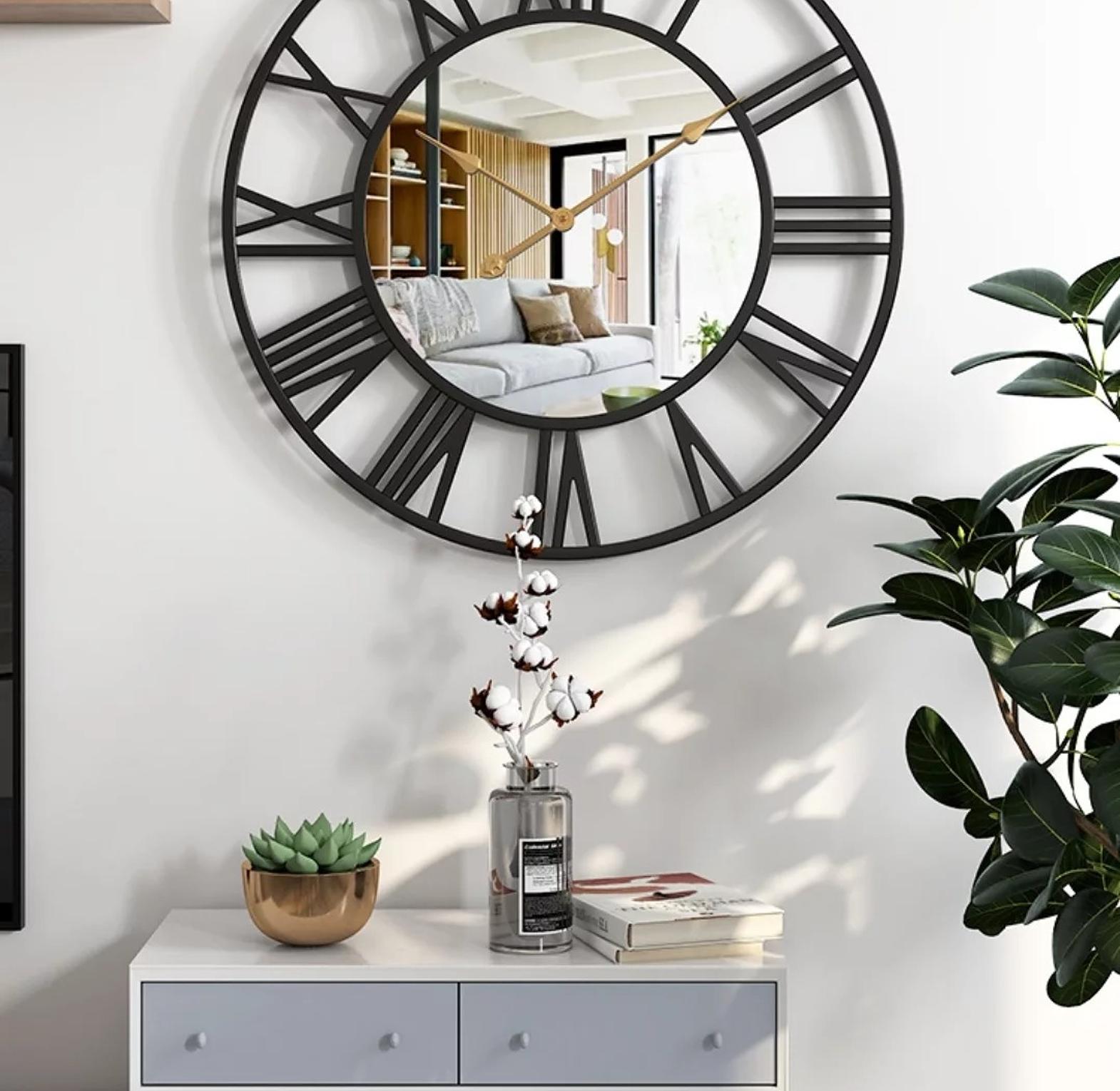 Elevate your living space with the exquisite Regal Roman Metal Mirror Clock, a stunning fusion of modern design and timeless elegance. This large wall clock, boasting a 50cm diameter, is meticulously crafted from durable wrought iron with a sleek black finish, creating a bold and sophisticated statement piece. The central round mirror face not only adds a touch of luxury but also enhances the sense of space and light in any room. Around its circumference, beautifully rendered Roman numerals provide a classic and distinguished look, ensuring easy readability while contributing to its European-inspired charm. Designed with a silent sweeping movement, this clock offers precise timekeeping without any distracting ticking sounds, maintaining a peaceful atmosphere in your home. Perfect for a living room, dining area, or grand entryway, the Regal Roman clock serves as both a functional timepiece and a captivating piece of wall art, seamlessly blending with contemporary, industrial, or classic interior styles. This decorative mirror clock is a must-have for those seeking large wall clocks, metal wall decor, silent clocks, Roman numeral clocks, and luxury living room accents.
