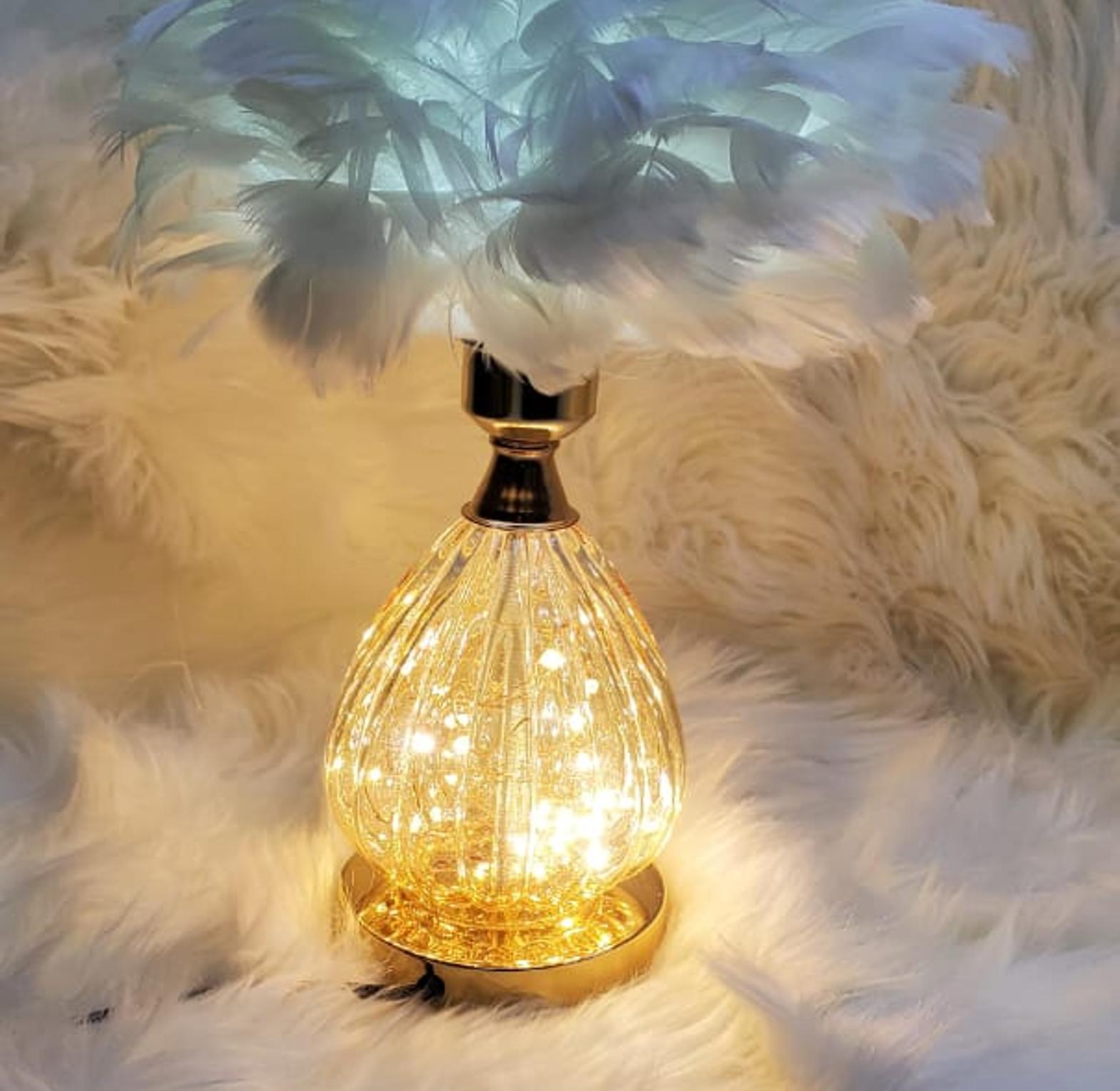 Perfect for bedrooms, living rooms, or as an accent piece, the Crystal Feather Table Lamp not only adds a warm, cozy glow but also serves as a statement decor item. Its elegant design complements both classic and contemporary interiors, while the high-quality materials ensure durability and lasting beauty. Illuminate your space with style and charm, making this unique lamp a standout addition to your home decor.