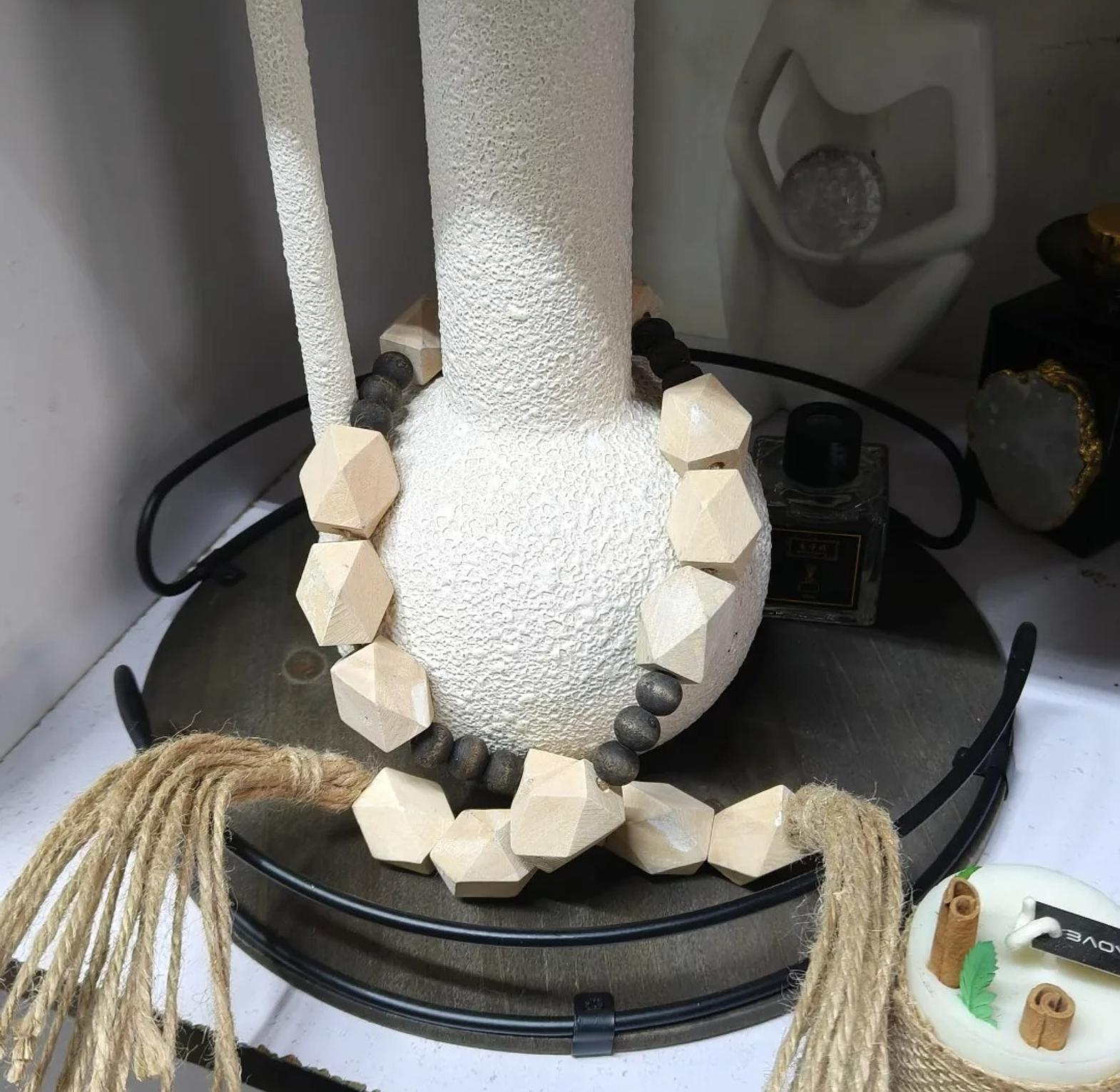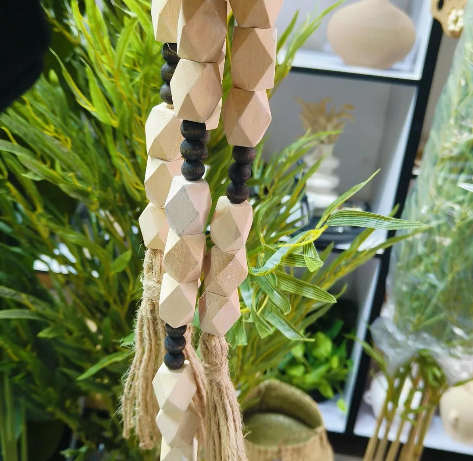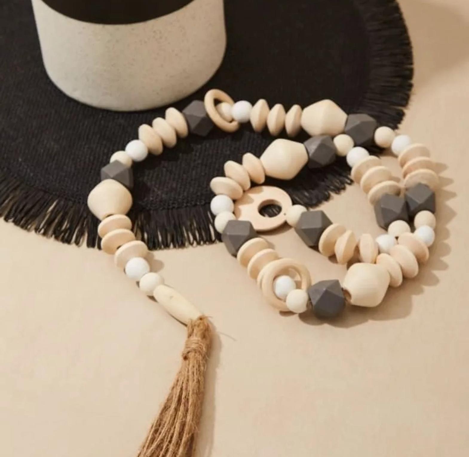 Elevate your home's aesthetic with the Geometric Harmony Wood Bead Garland, a versatile and stylish decorative accent. This exquisite garland is thoughtfully designed with a series of geometric faceted wooden beads that offer a contemporary twist on classic farmhouse and bohemian styles. Interspersed with smaller, contrasting dark beads, the garland creates a striking visual rhythm. Each end is adorned with rustic jute tassels, adding an extra layer of organic texture and charm. Ideal for draping over books, coiling in a decorative bowl, accentuating a mantelpiece, or adding a warm touch to shelves and side tables, this garland is perfect for creating a cozy and inviting atmosphere. Its natural wood tones and minimalist design ensure it complements a wide range of interior styles, from modern and Scandinavian to rustic and eclectic. This decorative piece is a must-have for those seeking wood bead decor, bohemian garlands, farmhouse accents, natural home accessories, and unique decorative strings.