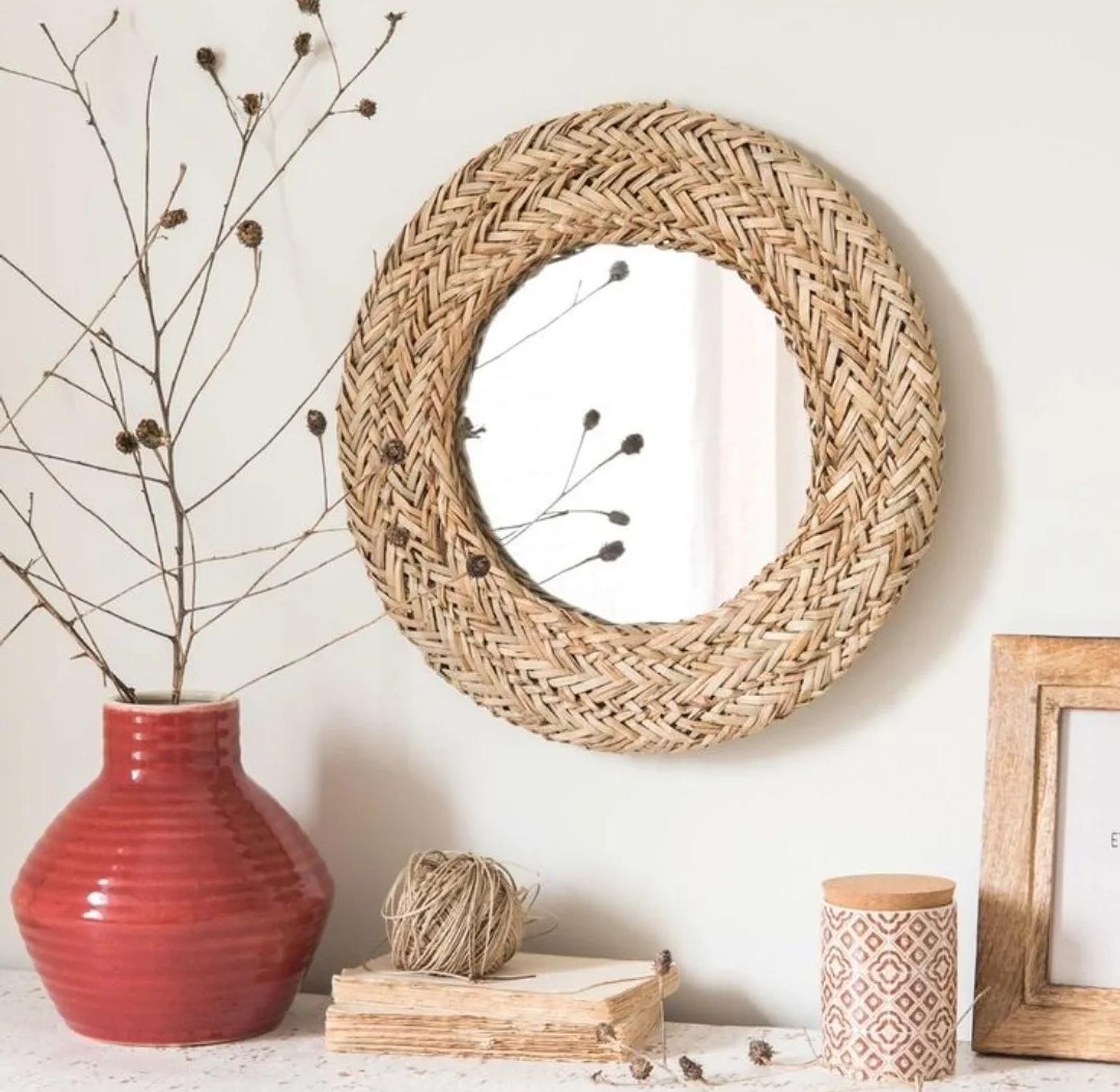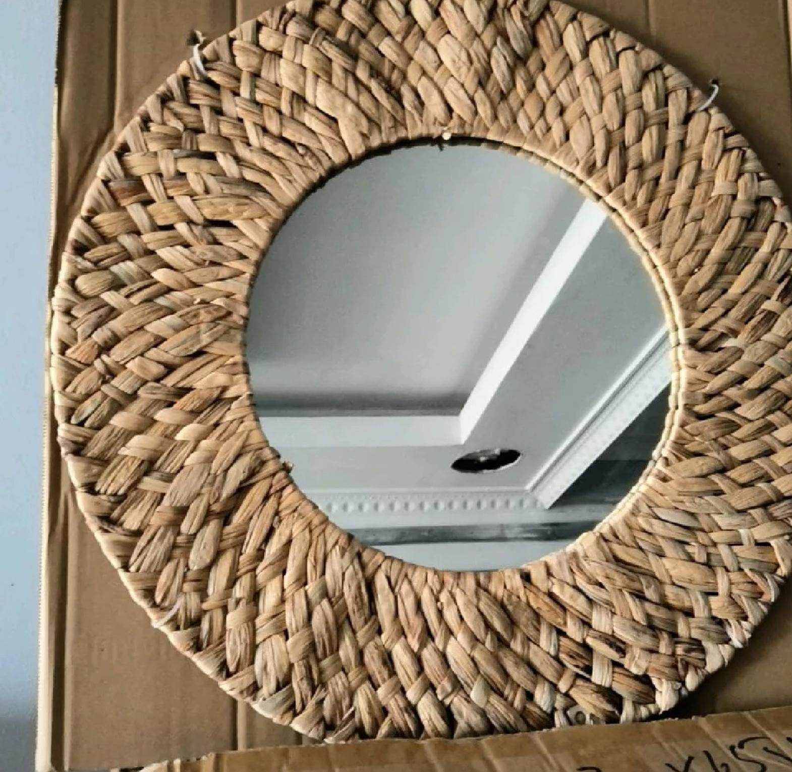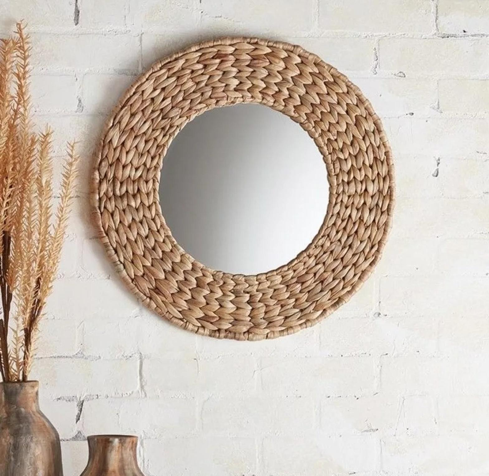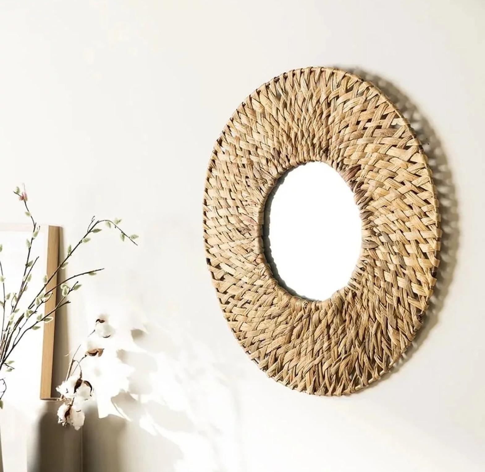 Bring the serene charm of natural textures into your home with the Coastal Rattan Decorative Wall Mirror. This stunning mirror features a generous 60cm diameter, making it an ideal statement piece for hallways, living rooms, bedrooms, or bathrooms. The frame is meticulously handmade from natural water hyacinth, intricately braided to create a rich, tactile border that exudes organic elegance. Each mirror is a unique piece of artisanal craftsmanship, showcasing the beautiful variations in the natural material. The warm, earthy tones of the woven frame perfectly complement a variety of interior styles, from bohemian and coastal to rustic and Scandinavian. Beyond its reflective utility, this mirror acts as a captivating piece of wall art, adding depth, light, and natural character to your chosen space. Easy to hang and designed for lasting beauty, the Coastal Rattan mirror is an essential accent for those seeking natural decorative mirrors, handmade wall decor, bohemian home accents, rattan framed mirrors, and organic interior pieces.