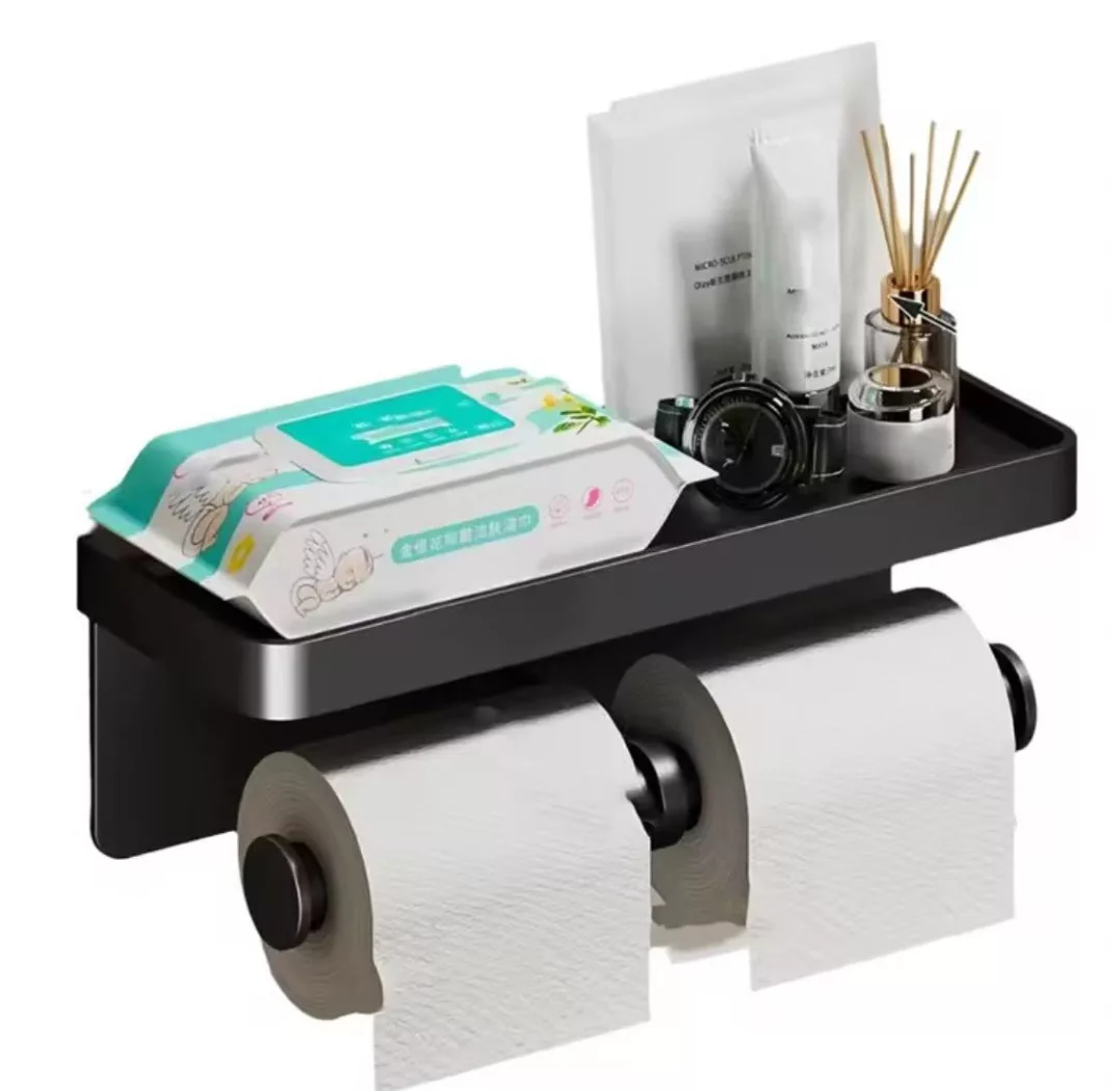 Upgrade your bathroom or kitchen utility with this robust and contemporary double-roll paper holder. Constructed from high-quality aluminum alloy, this unit is designed for long-lasting durability and resistance to moisture. The key feature is the efficient double-roll capacity, ensuring you always have a spare roll readily accessible. Installation is hassle-free thanks to its no-drilling required adhesive mounting system, protecting your walls while providing a secure fixture. An indispensable element is the top storage shelf, perfect for holding wet wipes, small decorative items, mobile phones, or air fresheners, keeping them neatly within reach. Its multipurpose design and sleek aesthetic make it an ideal and practical organizational tool for both washrooms and food preparation areas.