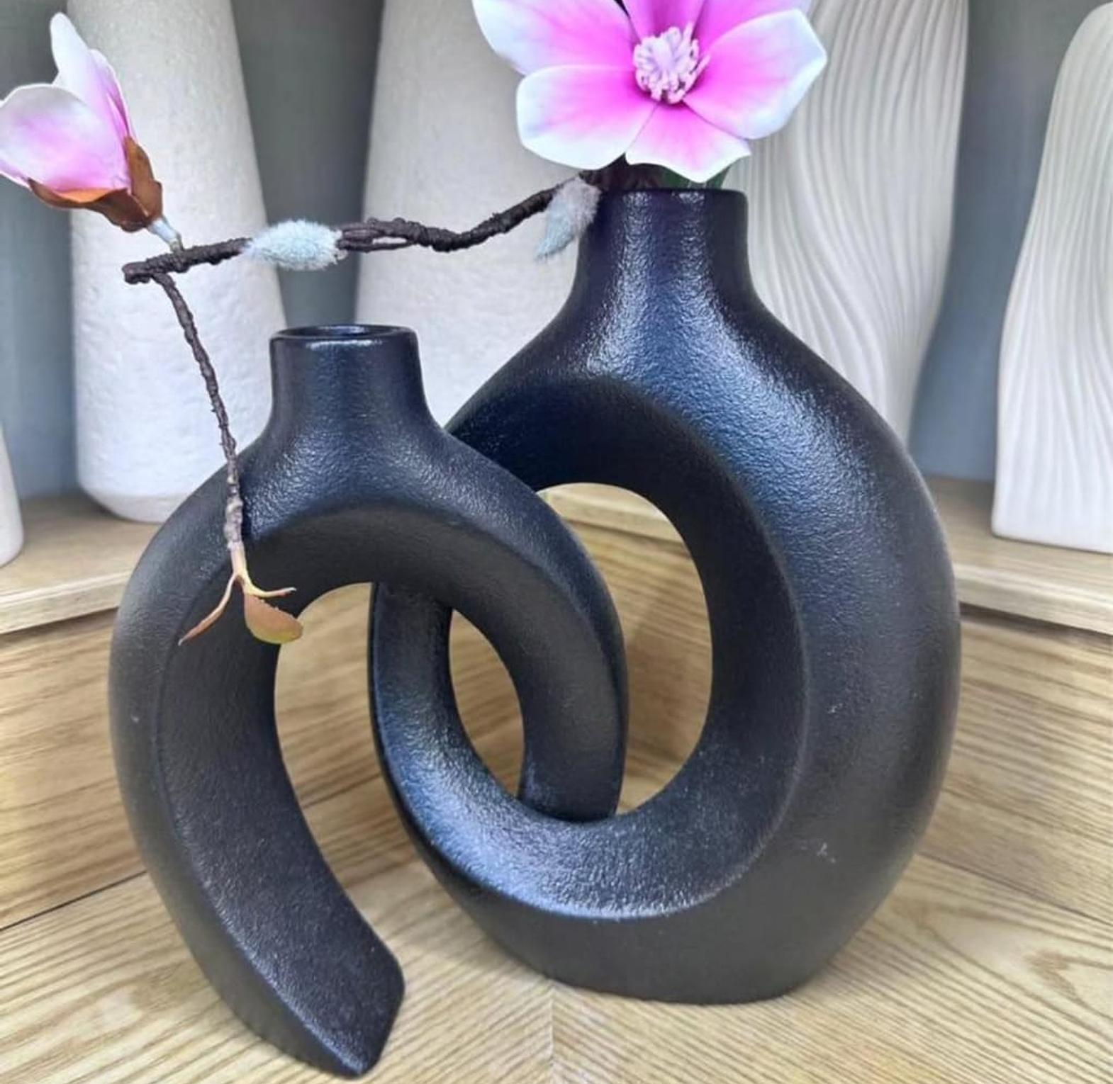 Bring contemporary elegance to your space with the Doughnut Nordic Vase, a striking ceramic piece that seamlessly blends form and function. Its bold, doughnut-shaped design makes a statement, while the smooth ceramic finish enhances its refined, minimalist appeal. Perfect for showcasing flowers or standing alone as a sculptural accent, this vase is ideal for modern interiors. Whether placed on a coffee table, mantelpiece, or shelf, it effortlessly complements a variety of home styles, adding a chic, understated charm. The high-quality ceramic material ensures durability, making this vase a timeless addition to any decor.