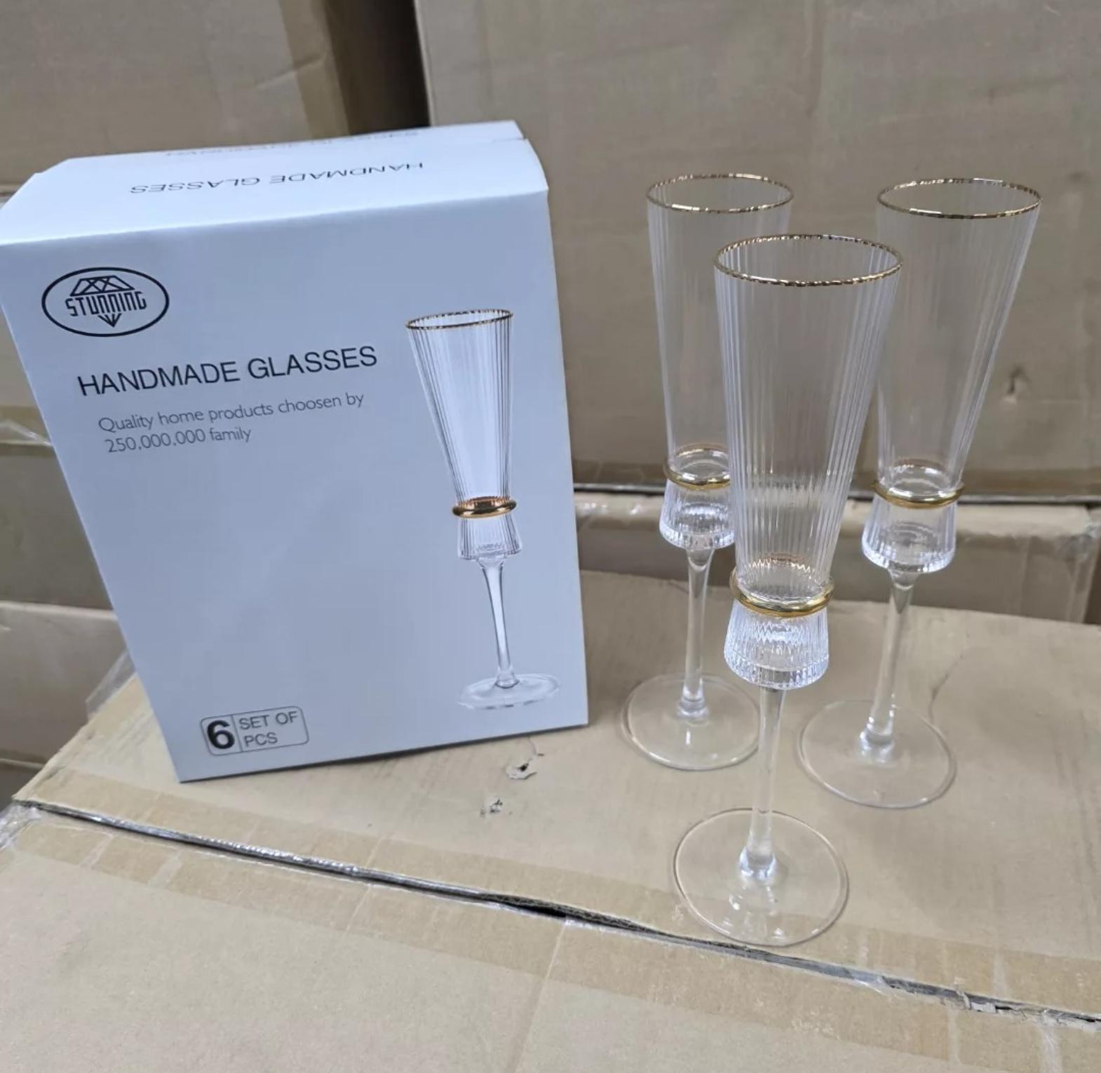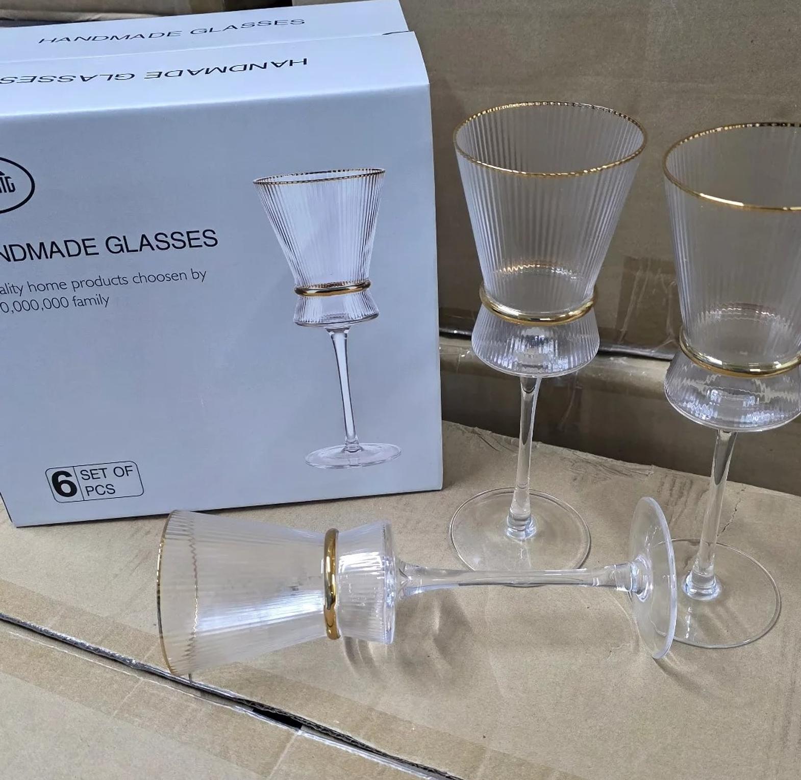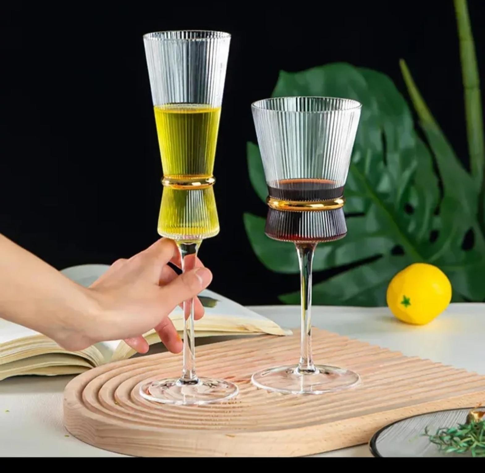 Indulge in tasty sips with our Exquisite Ribbed Crystal Wine & Champagne Flute Set. This stunning 6-piece collection of handmade glasses is designed to bring an unparalleled level of elegance and luxury to your barware. Each glass boasts a unique ribbed texture that beautifully catches the light, creating a dazzling visual effect. The design is further accentuated by a tasteful gold rim and a distinctive gold band at the stem, adding a touch of opulent refinement.