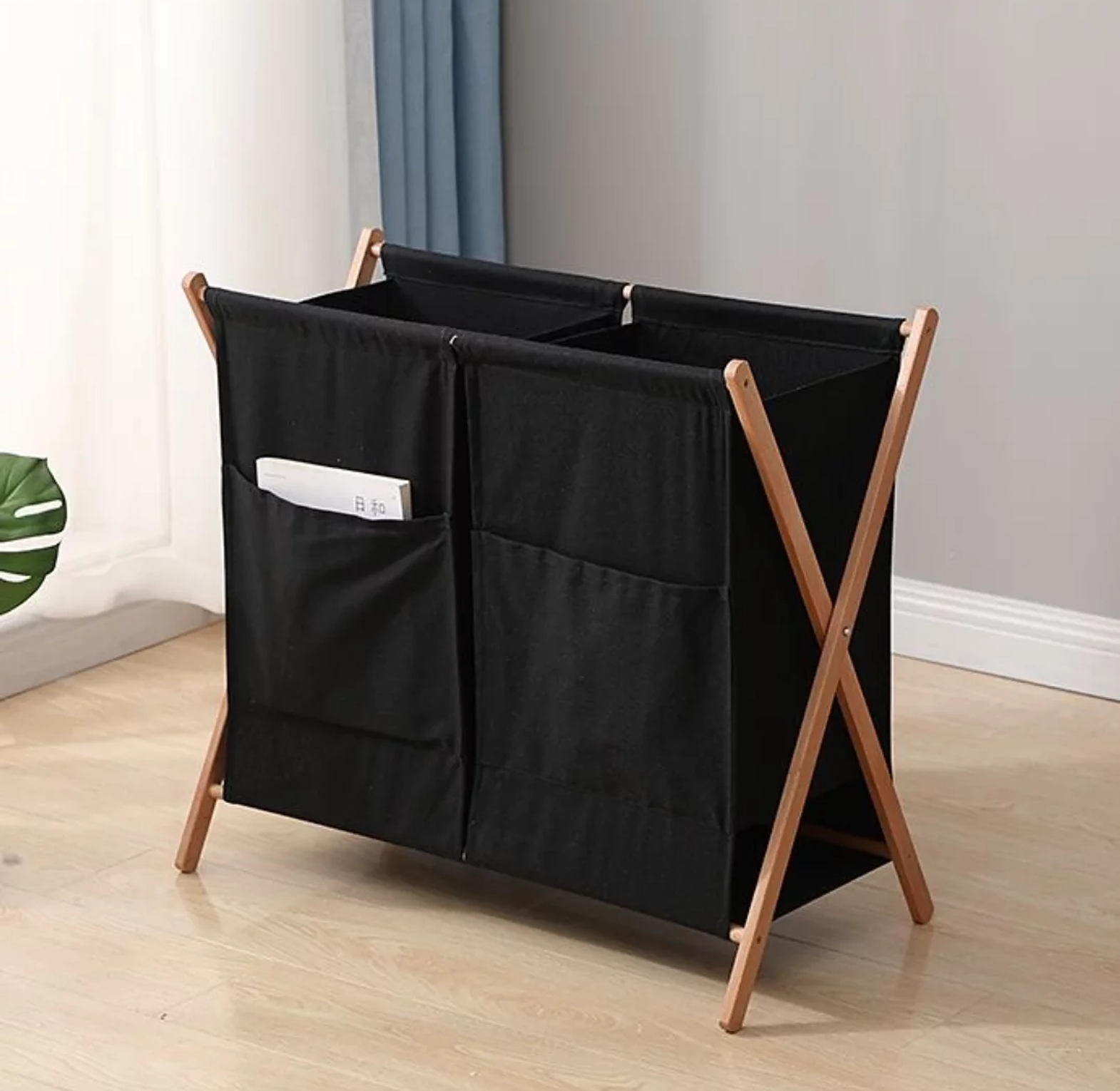 Streamline your laundry routine with this spacious and intelligently designed foldable partitioned laundry basket. The hamper features two separate interior compartments, making it simple to presort clothing into lights and darks, or colors and delicates, saving you time on laundry day. The basket section is supported by a stable and visually appealing wooden cross-frame that gives it a clean, modern aesthetic suitable for any bedroom, closet, or utility room. When not in use, the entire unit collapses flat for convenient storage, making it perfect for smaller living spaces. With generous dimensions of 62 cm×52 cm×30 cm, this organizer offers substantial capacity while maintaining a lightweight and easily portable structure.