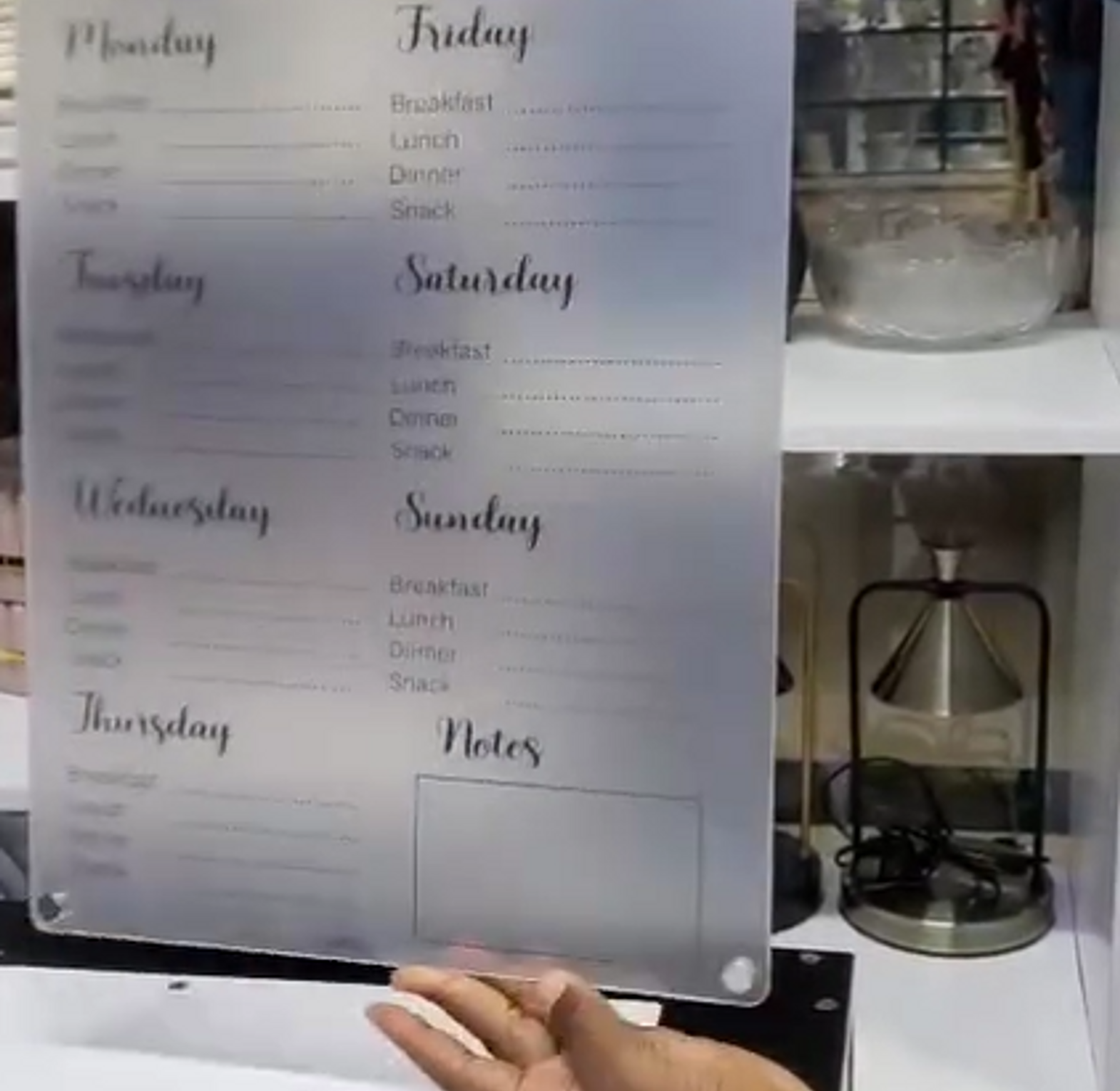 Streamline your weekly meal planning and keep your household organized with our Premium Magnetic Acrylic Meal Planner for Refrigerator. Sized perfectly at 30x40cm, this elegant and functional planner adheres securely to any magnetic surface, transforming your fridge into a central hub for family organization. Crafted from high-quality, transparent acrylic, it offers a modern, minimalist aesthetic that complements any kitchen decor.