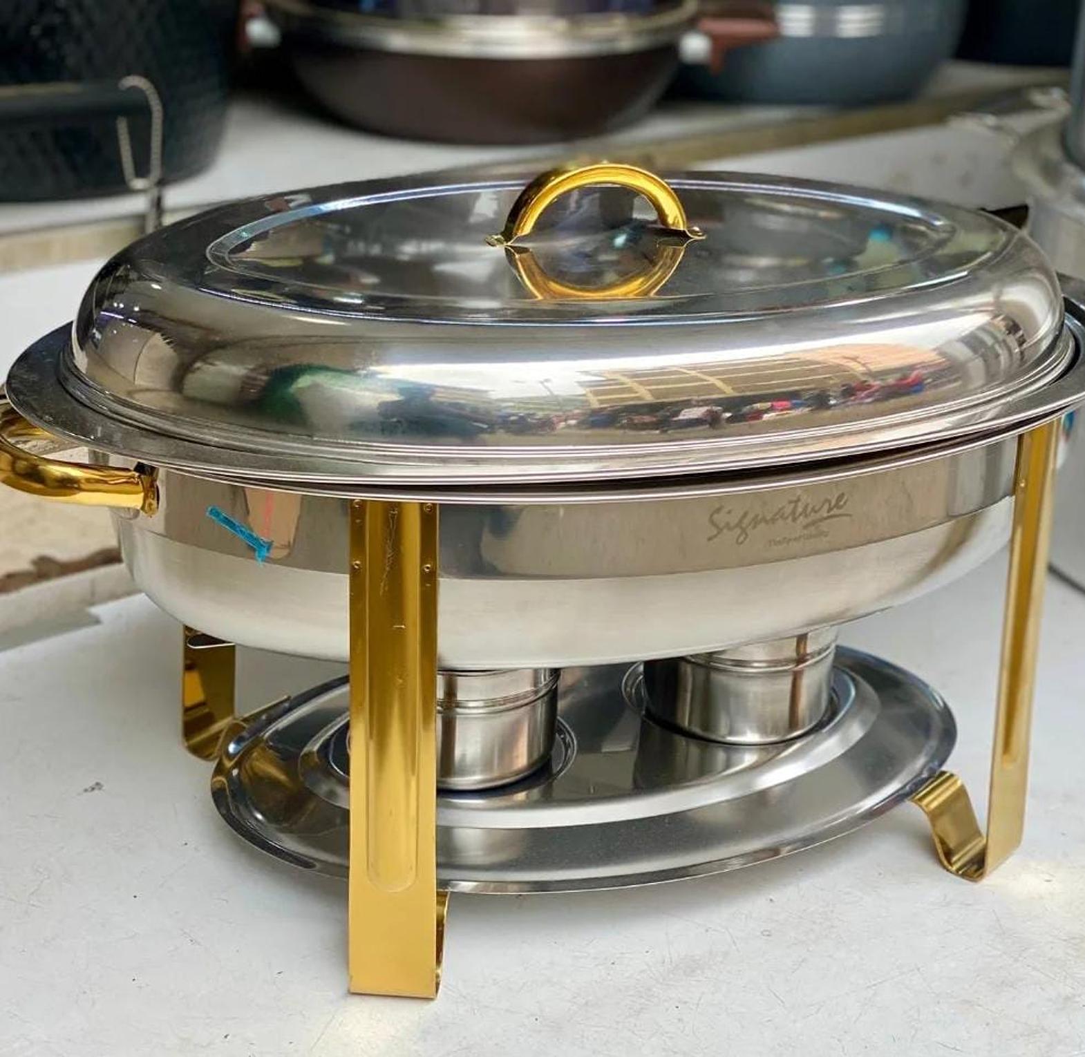 These golden stand signature food warmers offer a perfect blend of elegance and practicality for any gathering or special occasion. Crafted with a stunning gold-tone finish, they not only keep your food warm but also serve as a sophisticated centerpiece for buffets, dinner parties, or weddings. The sturdy golden stand provides stability, while the design allows for easy refilling and maintenance of your dishes at an ideal temperature. Whether serving appetizers, entrees, or desserts, these food warmers ensure that your food remains at its best, adding a refined touch of luxury to your dining experience.