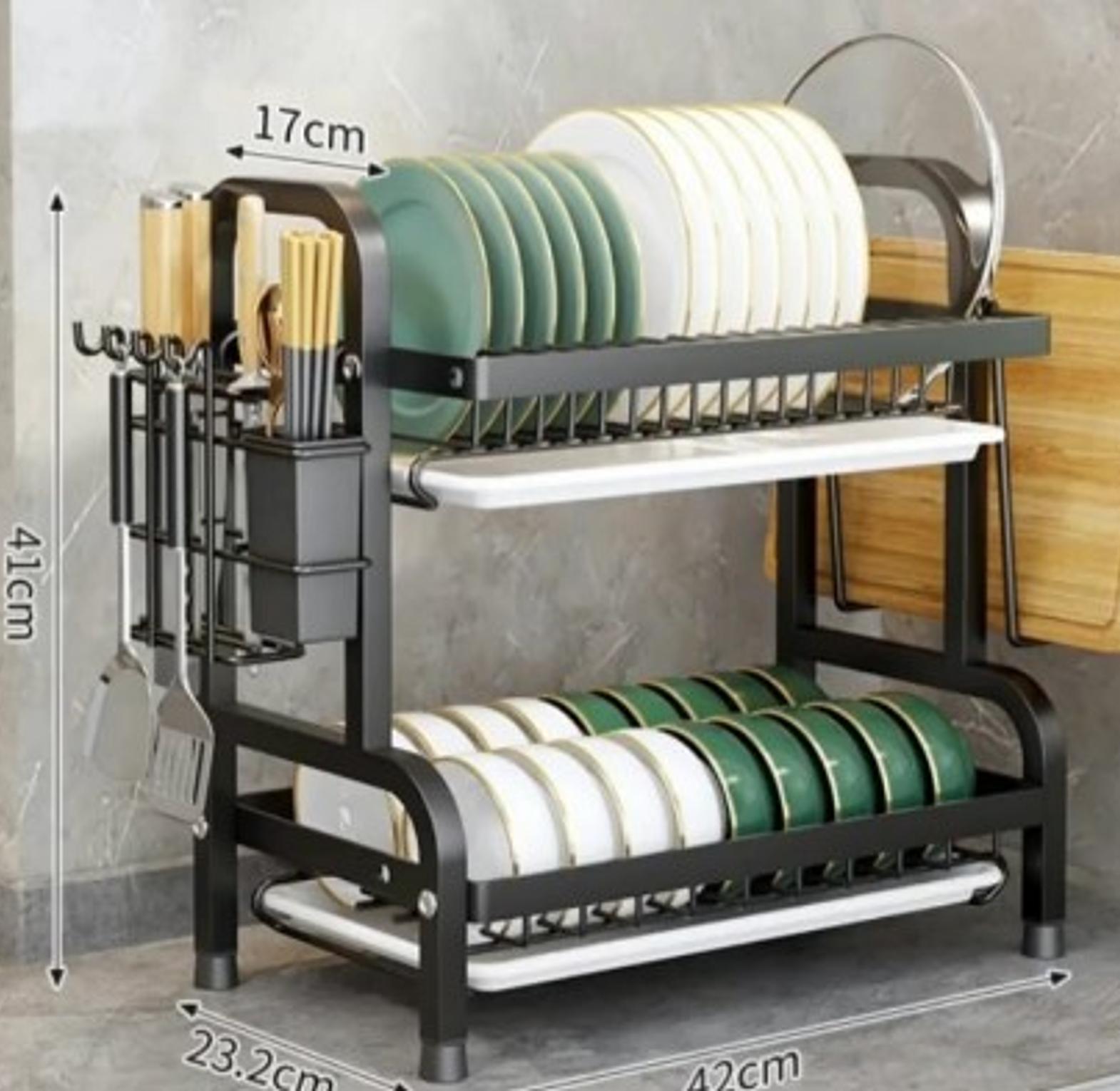 This premium 2-tier dish rack is crafted with heavy-duty materials, offering both strength and elegance for your kitchen. The dual-layer design provides ample space to dry dishes, bowls, and mugs, while the dedicated cutlery holder ensures organized utensil storage. Its sturdy construction resists rust and wear, making it ideal for daily use, while the drip tray underneath keeps your countertops clean and dry. With a sleek, modern design that blends seamlessly into any kitchen decor, this dish rack is perfect for families or individuals who value practicality and style in their kitchen essentials.