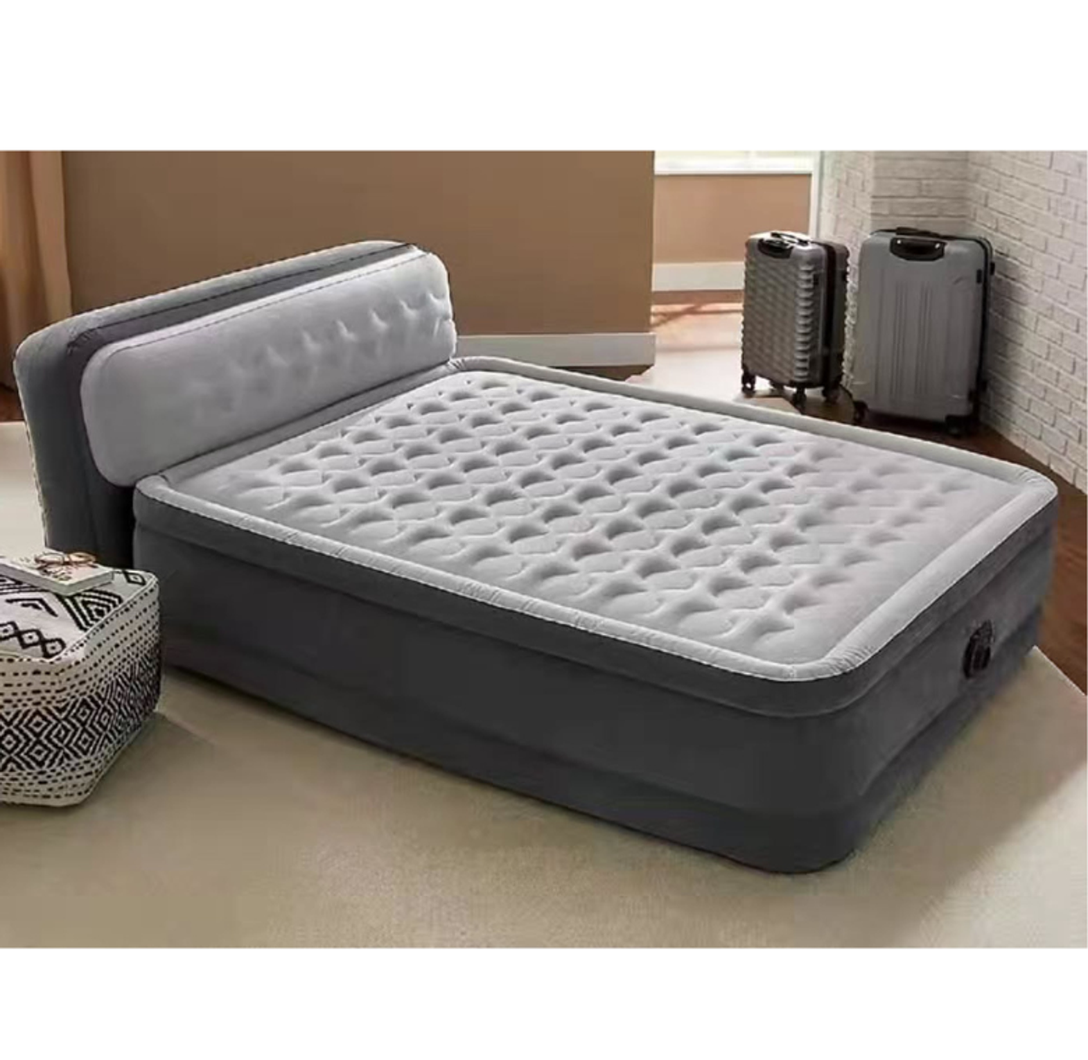 Provide your guests with an exceptional sleep experience using the feature-rich Intex Dura-Beam Queen Air Mattress. This superior airbed boasts a plush, supportive headboard that not only offers comfortable back support for reading but also cleverly prevents pillows from slipping off the back of the mattress. Inflation and deflation are made effortless and fast thanks to the built-in electric pump, which automates the setup and takedown process for maximum convenience. The mattress stands at a comfortable 18-inch height when inflated, mimicking the feel of a traditional bed, and features a velvety soft, flocked surface for a luxurious feel. Inside, the cutting-edge Fiber-Tech technology provides enhanced interior construction for superb stability and lasting support, while the flocked sides are engineered to resist punctures, ensuring reliable, long-lasting use.