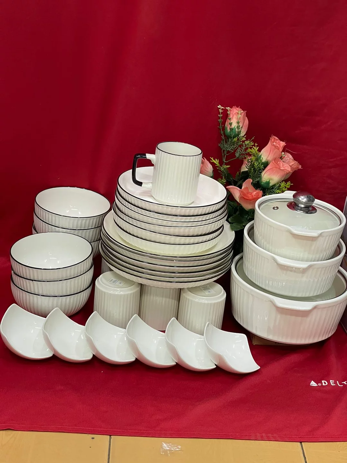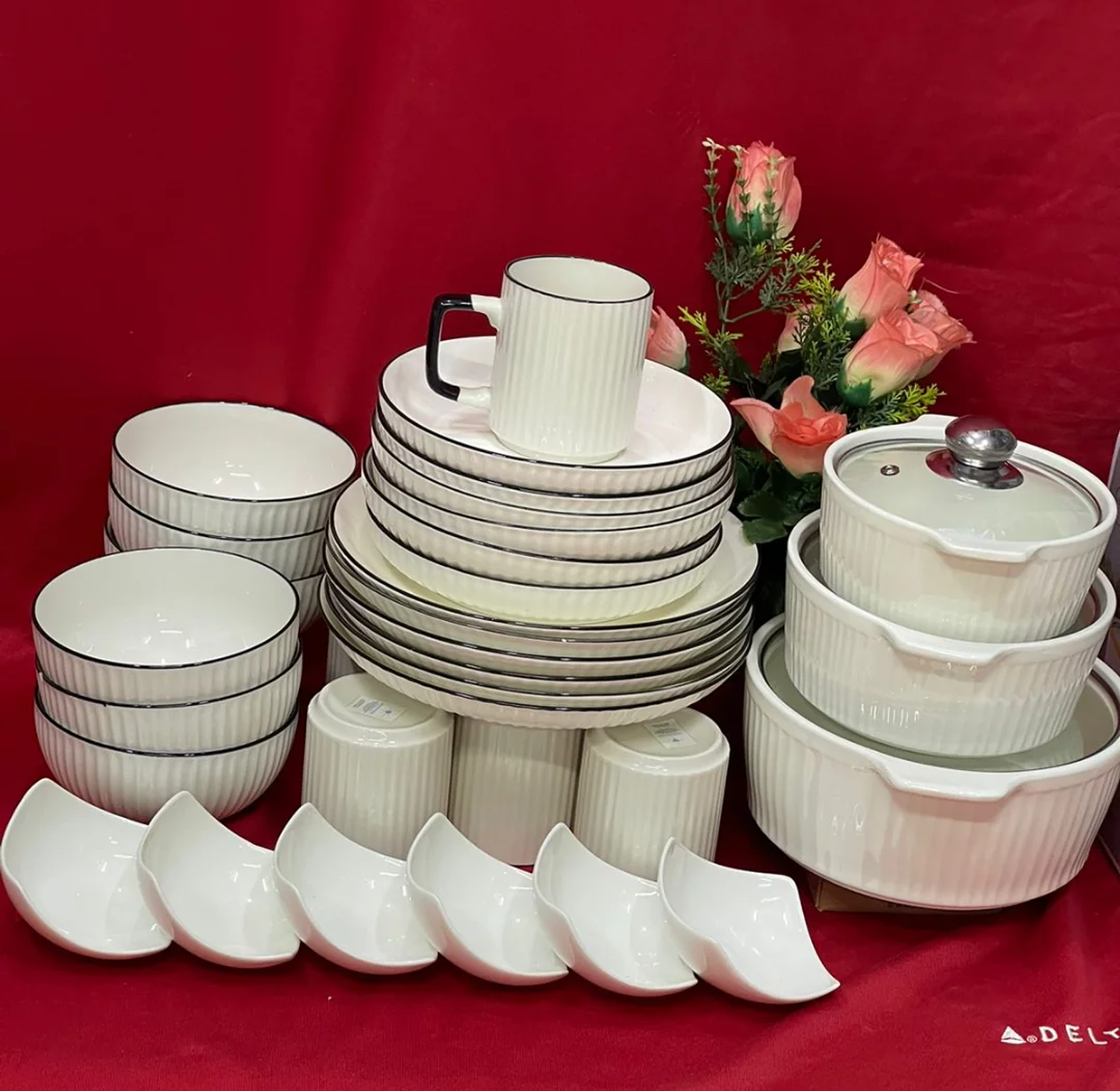 The Japanese Dinner Serving Set is a comprehensive 36-piece set that offers a complete table service for six, ideal for both everyday use and authentic Asian-inspired meals. The set is carefully curated to include six main plates, six side plates, six versatile bowls, and six elegant cups. For serving, it features three large dishes complemented by three fitted glass lids to keep food warm and visible. A distinctive element is the inclusion of six individual condiment sauces dishes, perfect for serving soy sauce, dipping oils, or spices. Crafted with durability and minimalist beauty in mind, this collection adds a touch of tranquil, cultural sophistication to any home in the region.
