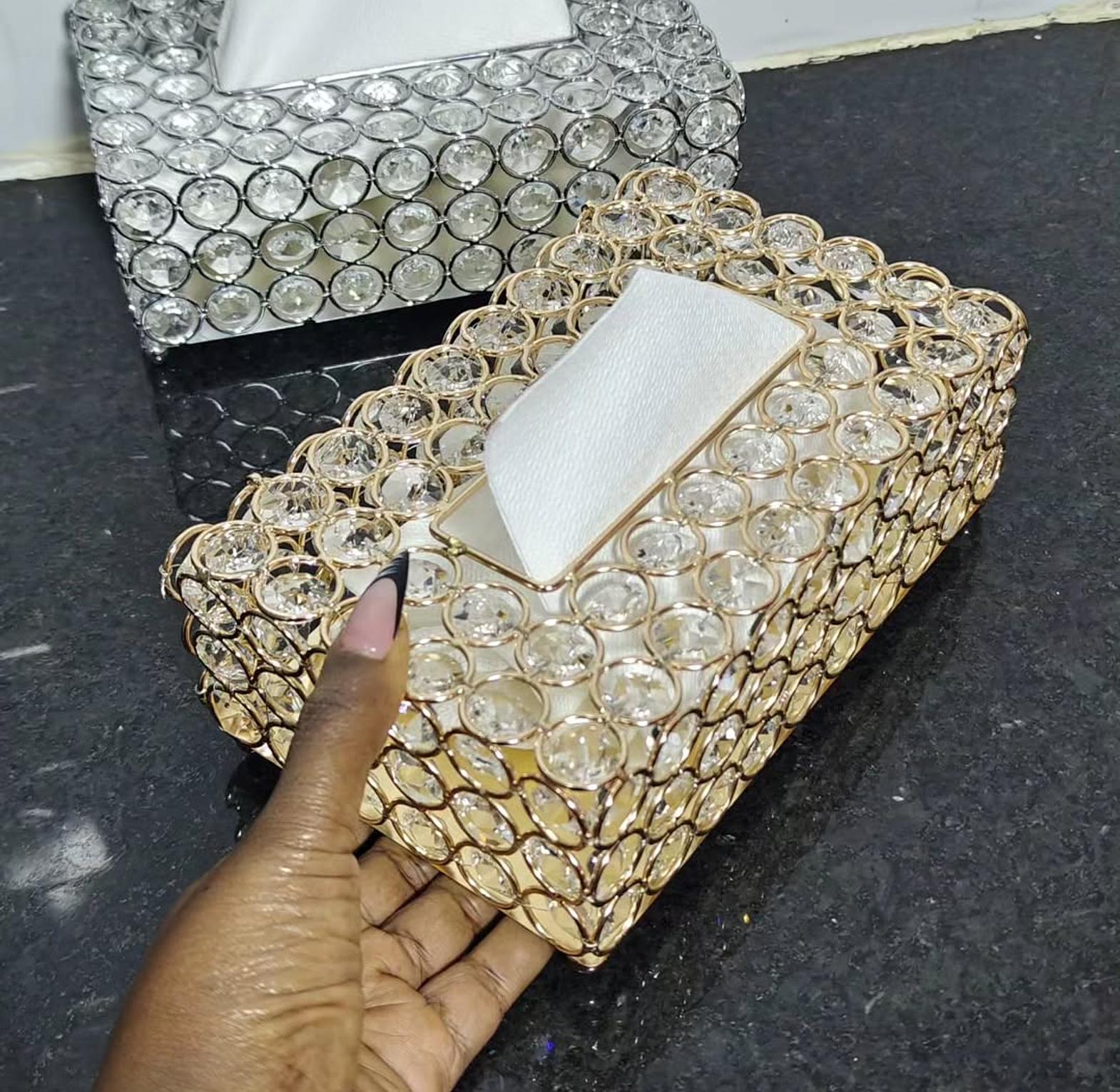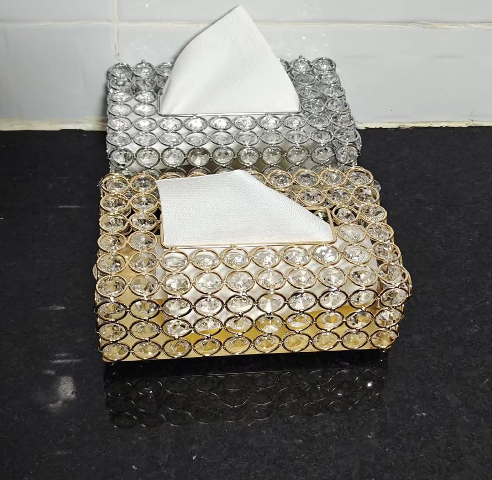 Transform a simple necessity into a striking decorative accessory with this elegant tissue box holder. Its sophisticated rectangular design is encased in a delicate metal framework adorned with rows of glittering, high-quality crystal-like beads. This design ensures that whether you choose the dazzling silver or the rich gold finish, the holder catches the light beautifully, adding a spark of luxury to your bathroom, living room, office desk, or bedroom nightstand. This holder not only conceals standard tissue boxes but also allows for easy, convenient dispensing while serving as a glamorous piece of home décor.