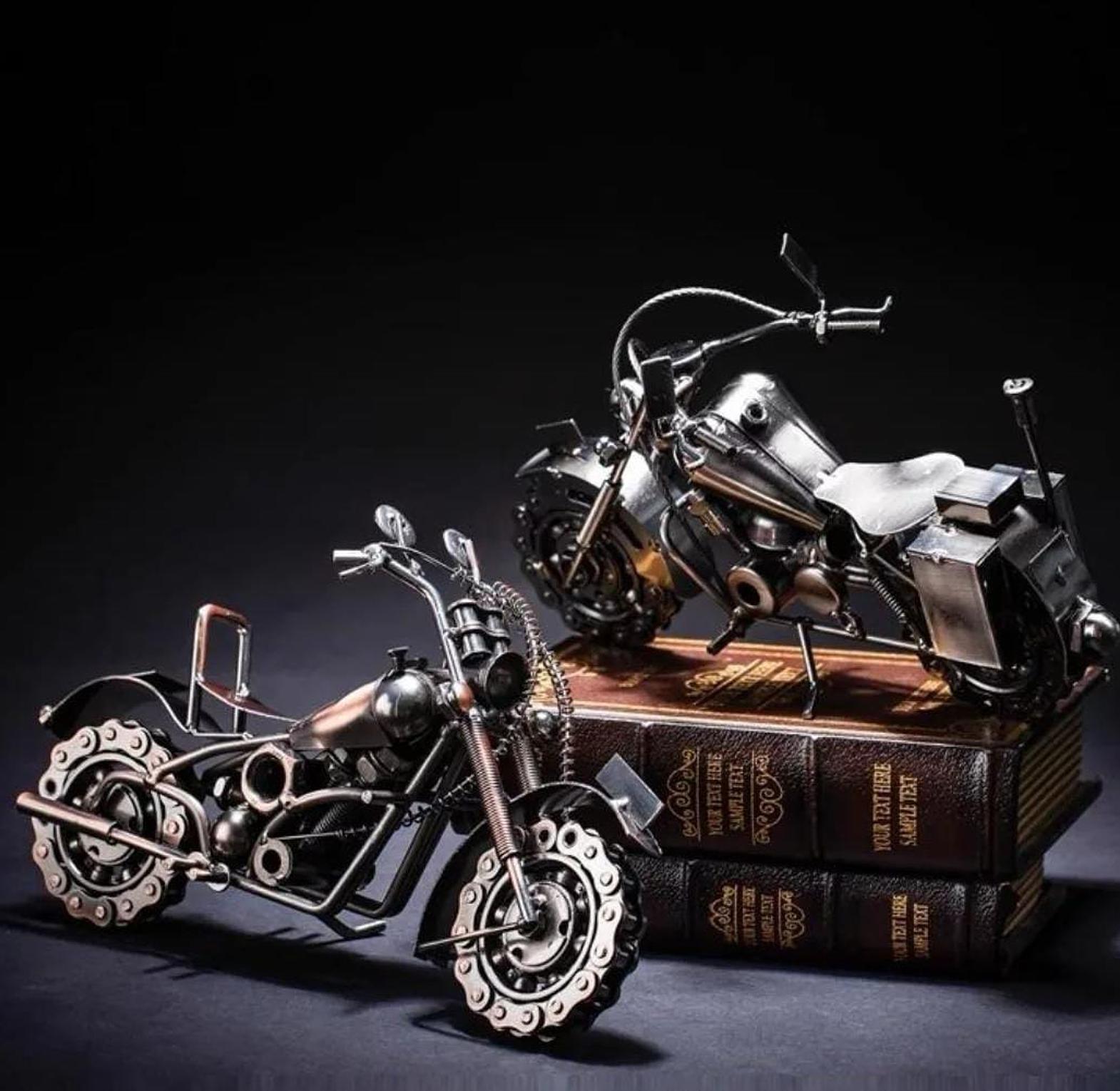 This metal vintage motorcycle sculpture is a striking piece that captures the essence of classic design and timeless appeal. Made from heavy metal, it showcases intricate detailing that reflects the power and elegance of vintage motorcycles. The weathered finish adds an authentic, rustic vibe, making it a standout addition to any room. Whether displayed in your living room, office, or garage, this motorcycle sculpture brings a sense of adventure and freedom to your space. Ideal for motorcycle enthusiasts, collectors, or anyone who appreciates unique, industrial-style décor, it’s a perfect blend of artistry and craftsmanship that will surely impress.