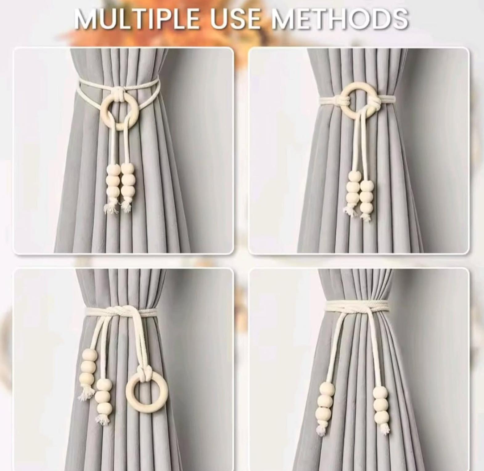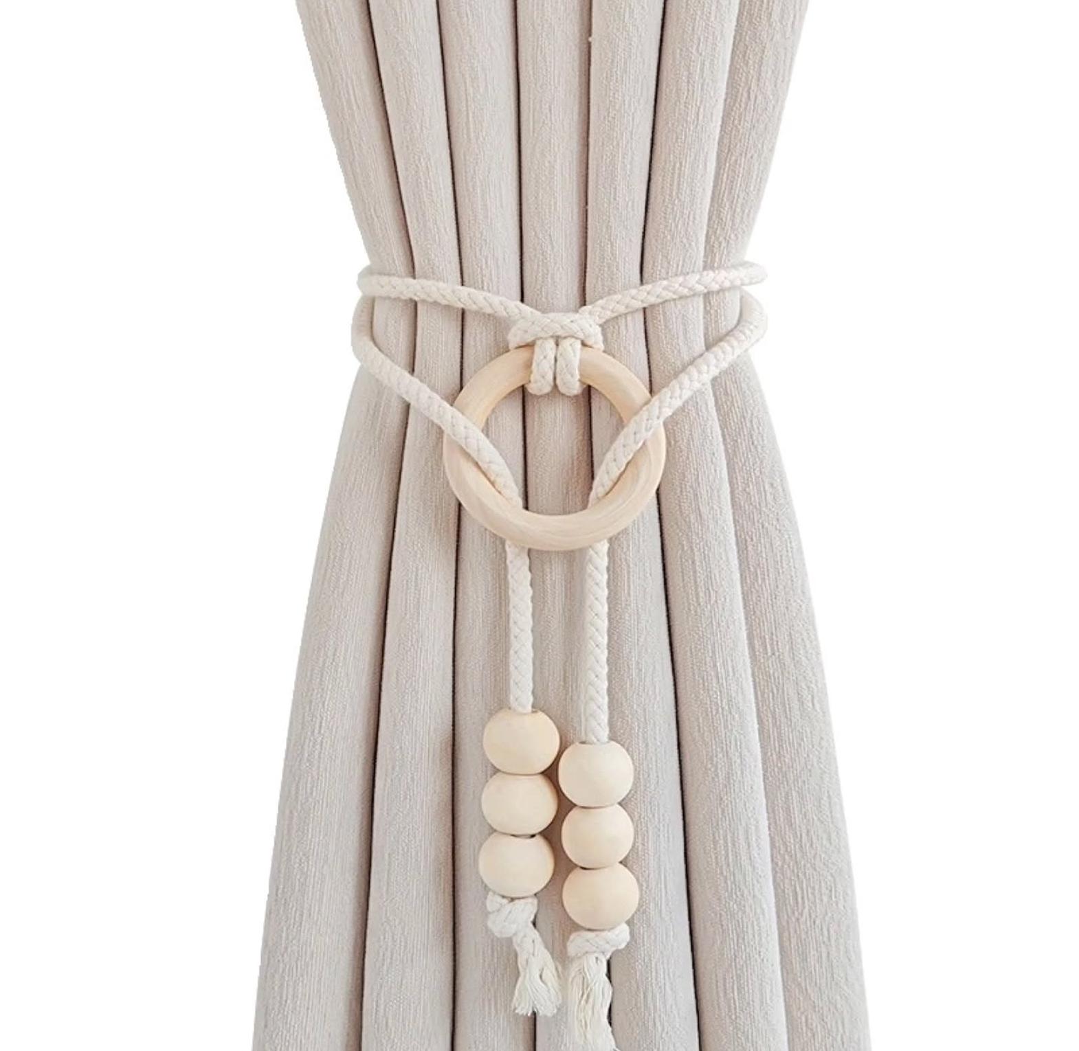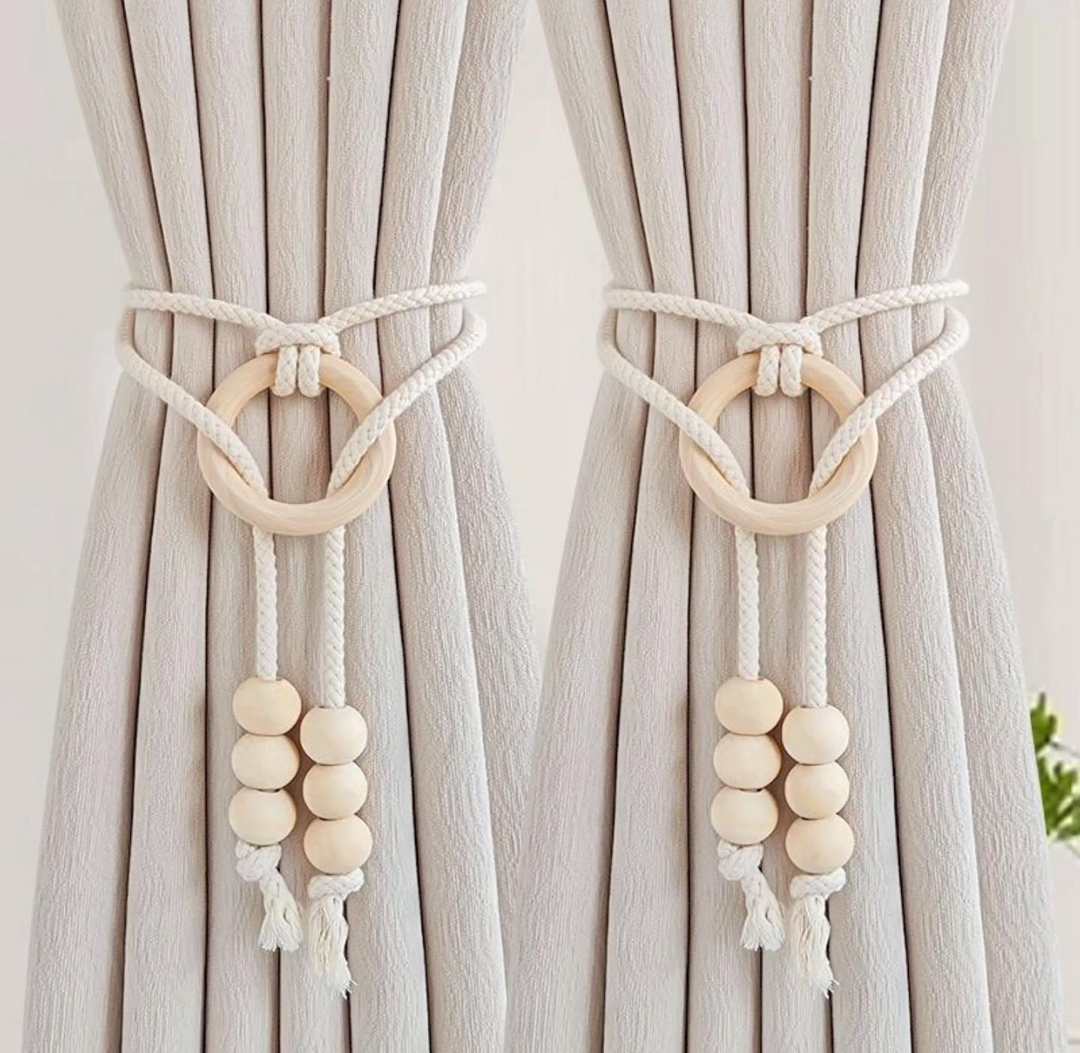 Enhance your window décor with this 2-piece set of natural cotton rope curtain tiebacks, designed in a charming boho style for a warm and inviting look. Each tieback features durable cotton rope paired with smooth wooden rings, combining functionality with decorative appeal. Ideal for holding back curtains neatly while adding texture and style, these versatile tiebacks are suitable for living rooms, bedrooms, offices, or studios. Easy to use and beautifully crafted, they are the perfect finishing touch to complete both modern and rustic interiors.