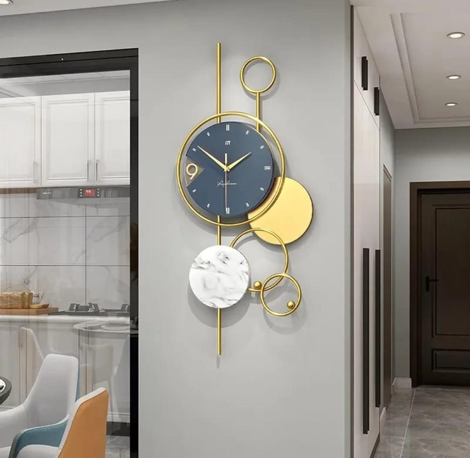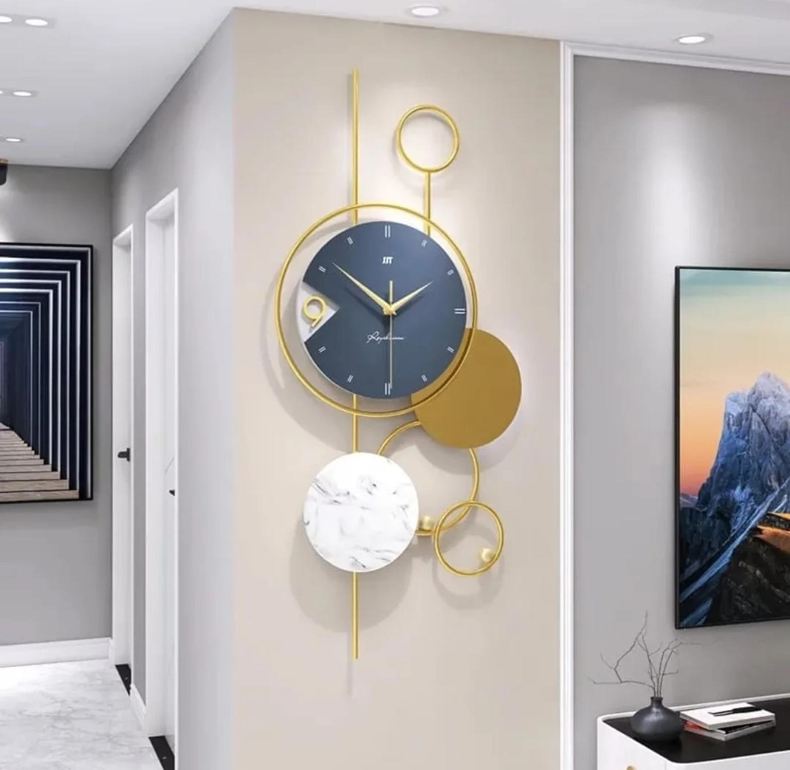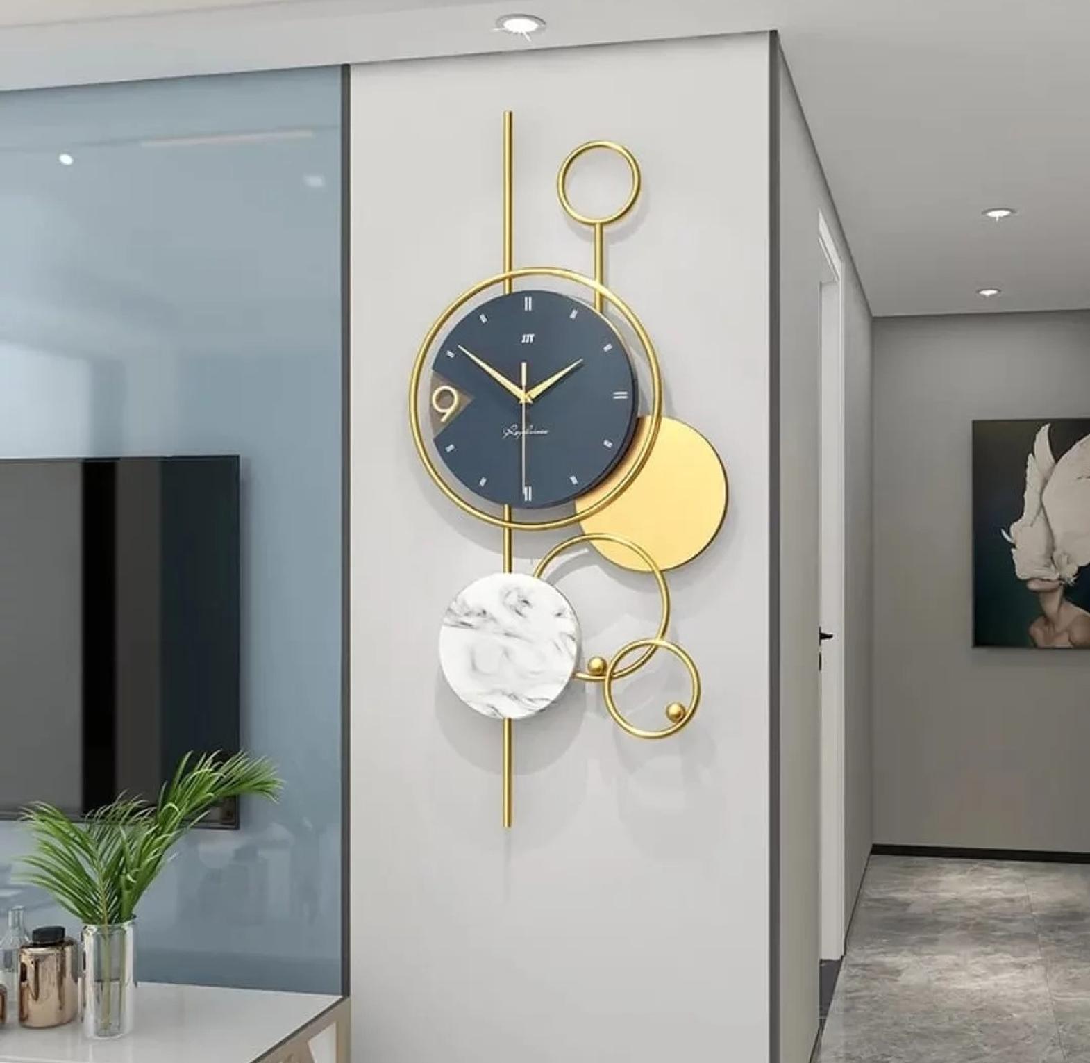 Make a striking statement in your home with the Geometric Horizon Luxury Wall Clock, a contemporary art piece that beautifully blends Nordic design with luxurious aesthetics. This impressive wall clock, measuring 78cm (height) x 38cm (width), is meticulously crafted from durable iron art, showcasing an abstract arrangement of circles and lines in a radiant golden finish. The design incorporates a round, high-density dial plate with clear markings and elegant hands, ensuring precise timekeeping with a silent sweeping movement that won't disrupt your peace. This clock is more than just a time-telling device; it's a prominent wall pendant home decoration that instantly enhances the sophistication of your living room, hallway, or office. Its creative and modern design, featuring a harmonious interplay of geometric shapes and textures (including what appears to be a marble-look accent), adds depth and visual interest to any wall. This distinctive piece is a must-have for those seeking luxury wall clocks, Nordic design clocks, iron art wall decor, modern living room accents, and statement timepieces.