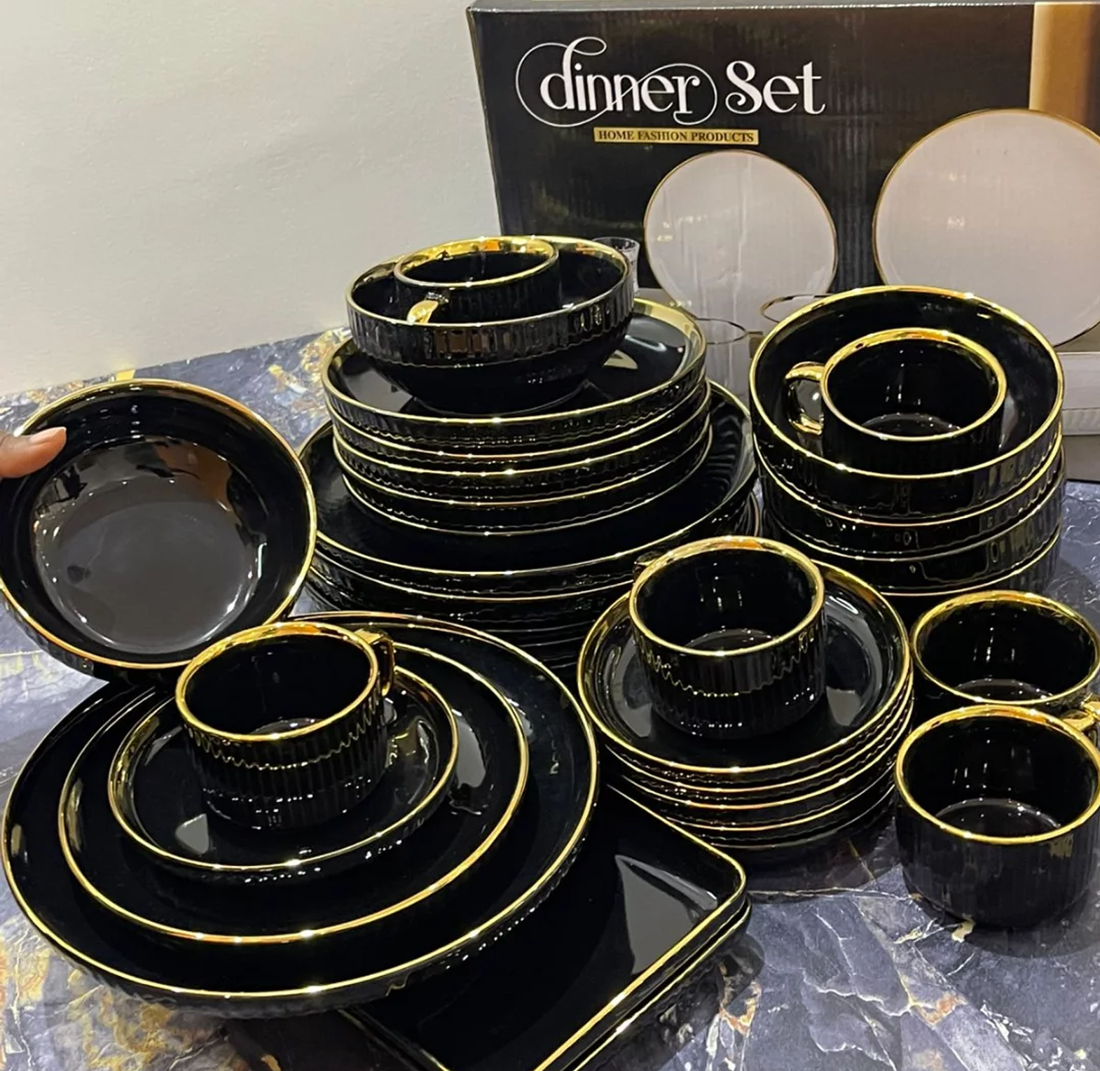 The Onyx & Gold Signature Dining Collection is a visually stunning 32-piece set that offers a contemporary and sophisticated table presentation. This comprehensive collection provides a full service for six people, including six main plates, six side plates, six versatile bowls, and six matching cups with six saucers. The dramatic black background of the ceramic pieces is elegantly finished with a radiant gold rim, creating a high-contrast and luxurious effect. Completing the set are two large platters for serving appetizers or main courses. This durable and fashionable dinnerware is an excellent choice for homeowners looking to introduce a touch of dramatic modern elegance to their entertaining spaces.