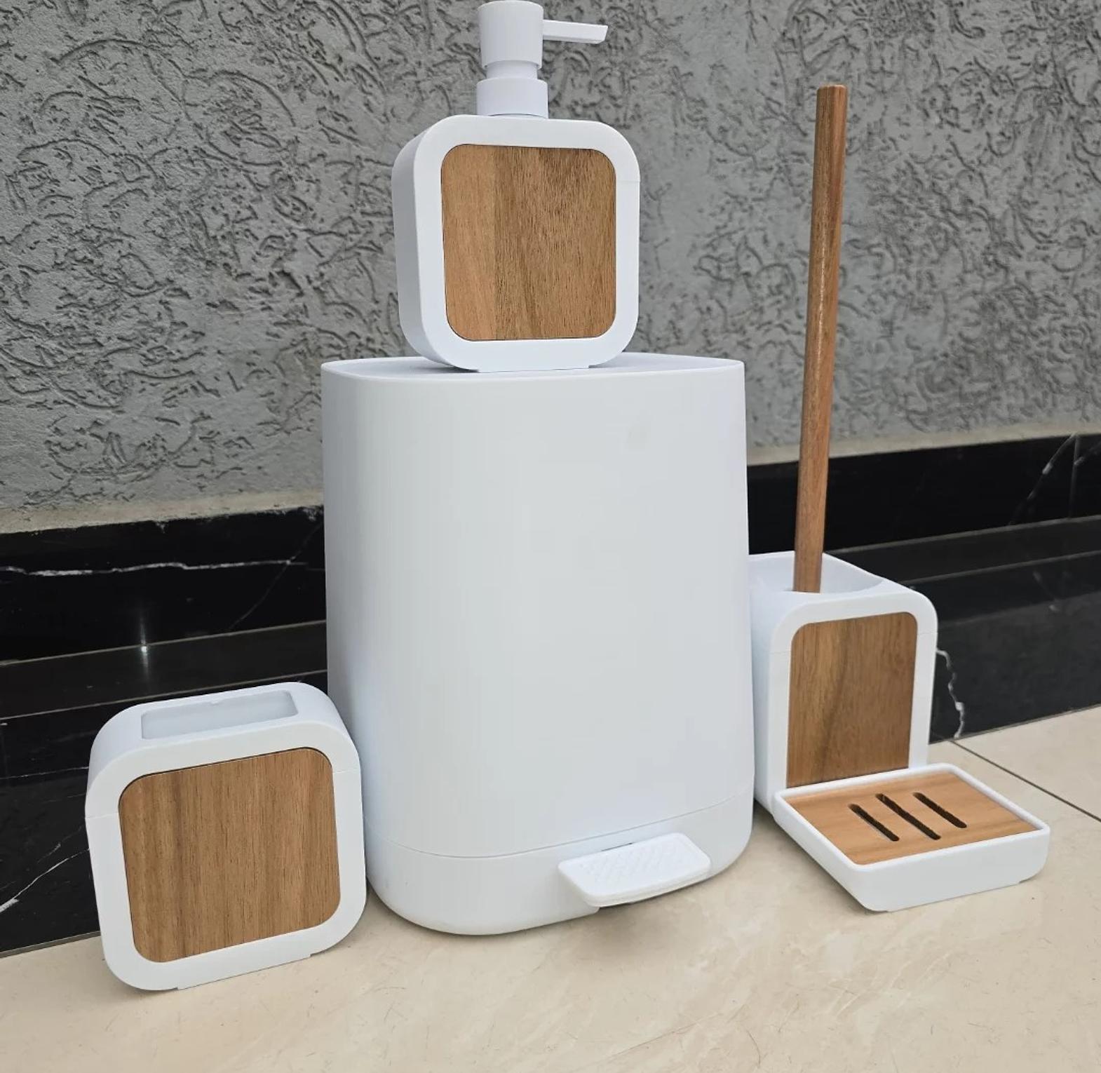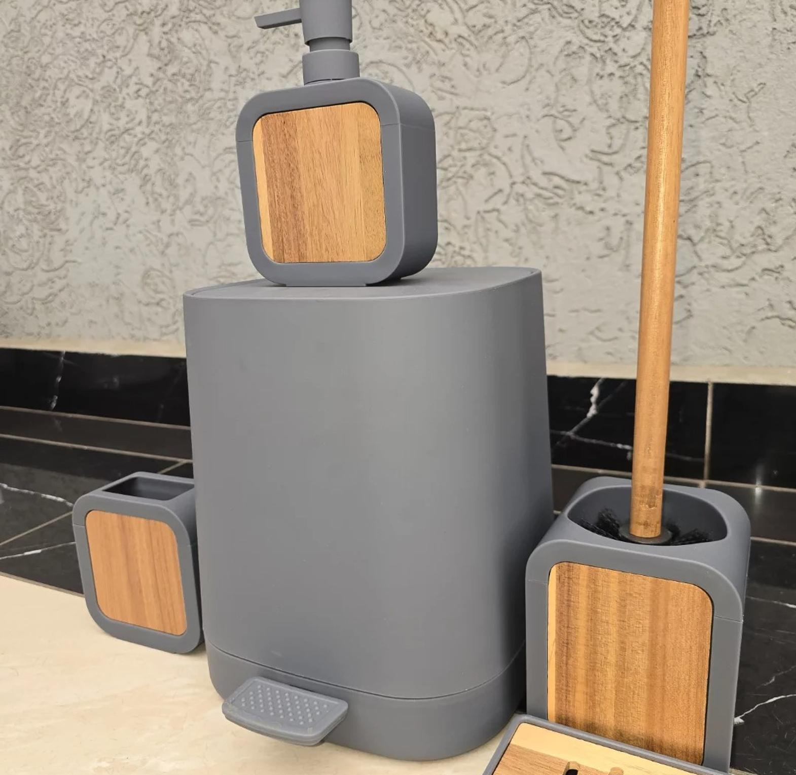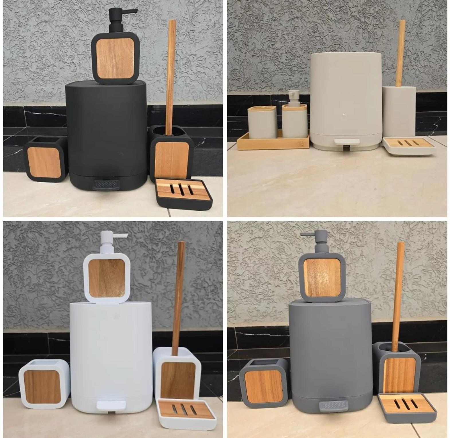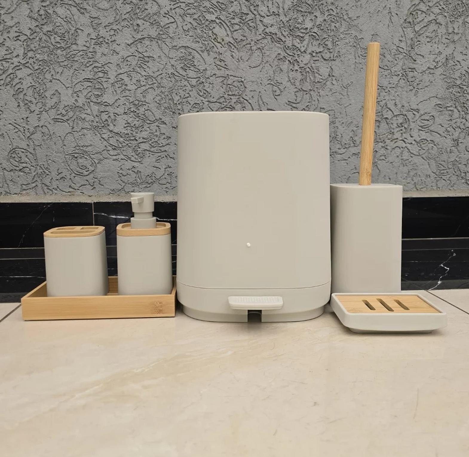 Elevate the sophistication and functionality of your bathroom with the Elegance Ease 6-Piece Bathroom Accessory Set. This meticulously curated collection provides a complete solution for bathroom organization, blending practical utility with sleek design. The set includes a toothbrush holder cup, a liquid soap dispenser, a soap dish, a trash can with a convenient pedal, a tumbler, and a toilet brush with its holder, ensuring every essential is beautifully coordinated. Each piece is constructed from very high-quality, environmentally friendly PP material, offering exceptional durability, resistance to moisture, and effortless cleaning. The design emphasizes clean lines and a smooth finish, providing a modern and elegant aesthetic that complements a wide array of bathroom decors. The inclusion of a pedal-operated trash can adds a hygienic and hands-free convenience. Available in versatile colors including black, white, beige, and grey, this set allows you to customize your bathroom's look while maintaining a cohesive and clutter-free environment. This comprehensive accessory set is a must-have for those seeking luxury bathroom accessories, modern bathroom sets, eco-friendly bath decor, complete vanity sets, and stylish toilet brush holders.