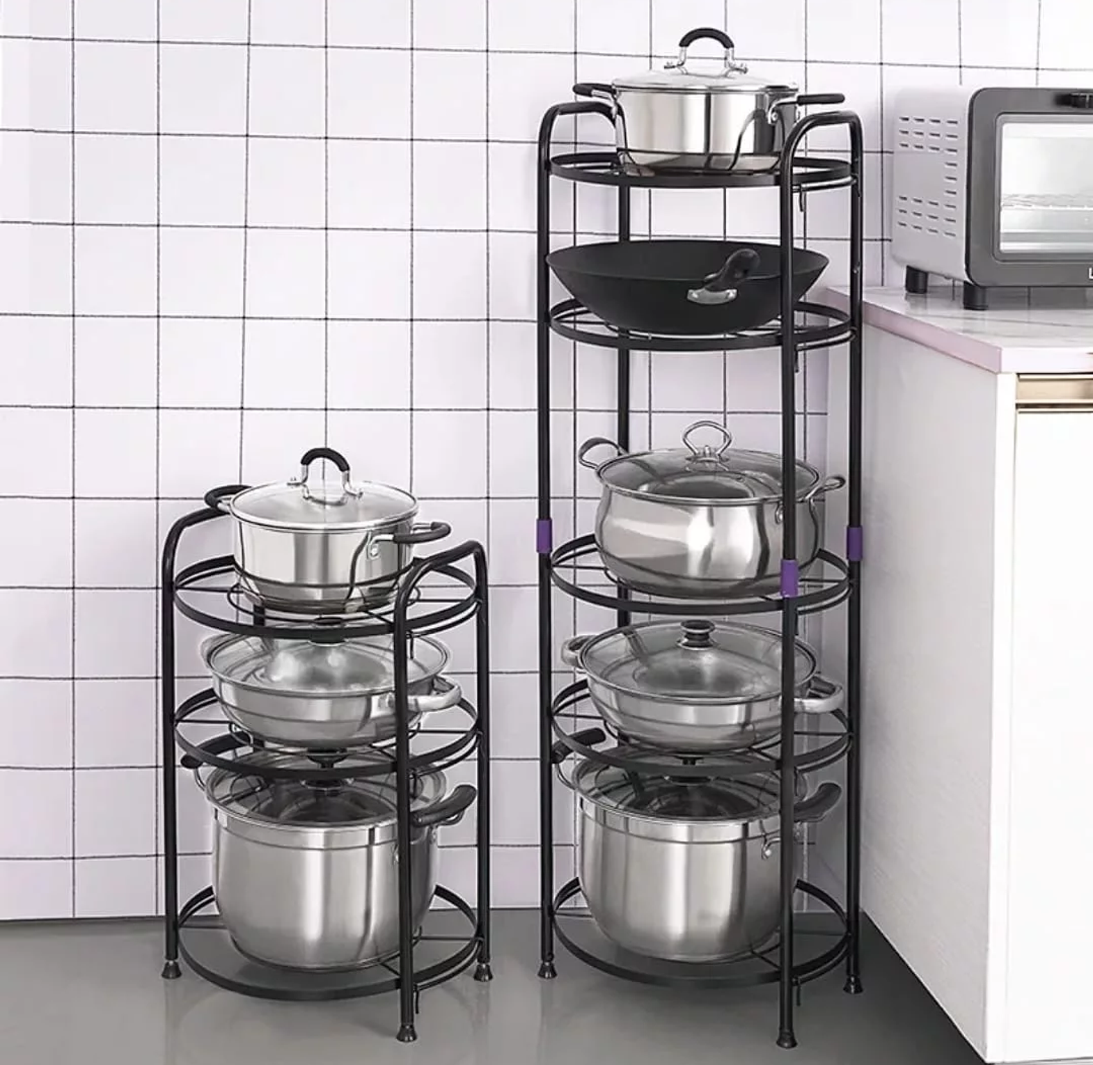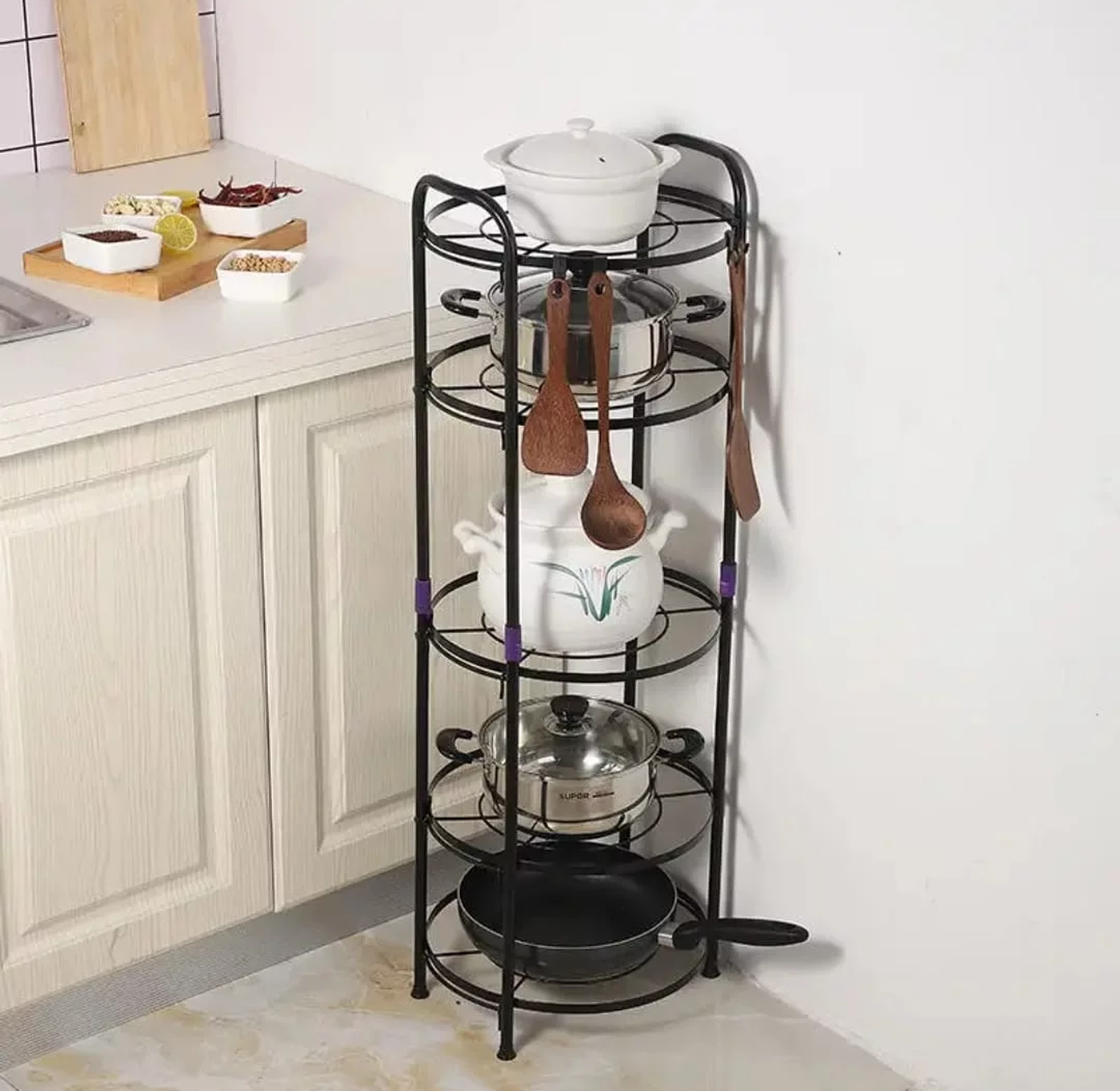 Reclaim cabinet space and organize your cookware efficiently with this excellent quality, vertical 5-tier pot rack holder. Constructed entirely from heavy-duty metal, this organizer is engineered for exceptional strength and durability, while its finish ensures it is non-rust, making it a long-lasting addition to your food preparation area. Standing at a convenient height of 103 cm with a diameter of 36 cm, the circular design fits neatly into corners or alongside cabinets, utilizing vertical space effectively. The rack's open shelves provide easy access to all your pots, pans, and lids, and the integrated side loops are perfect for hanging cooking utensils. Available in a sleek black color, it combines high functionality with a modern, clean aesthetic.