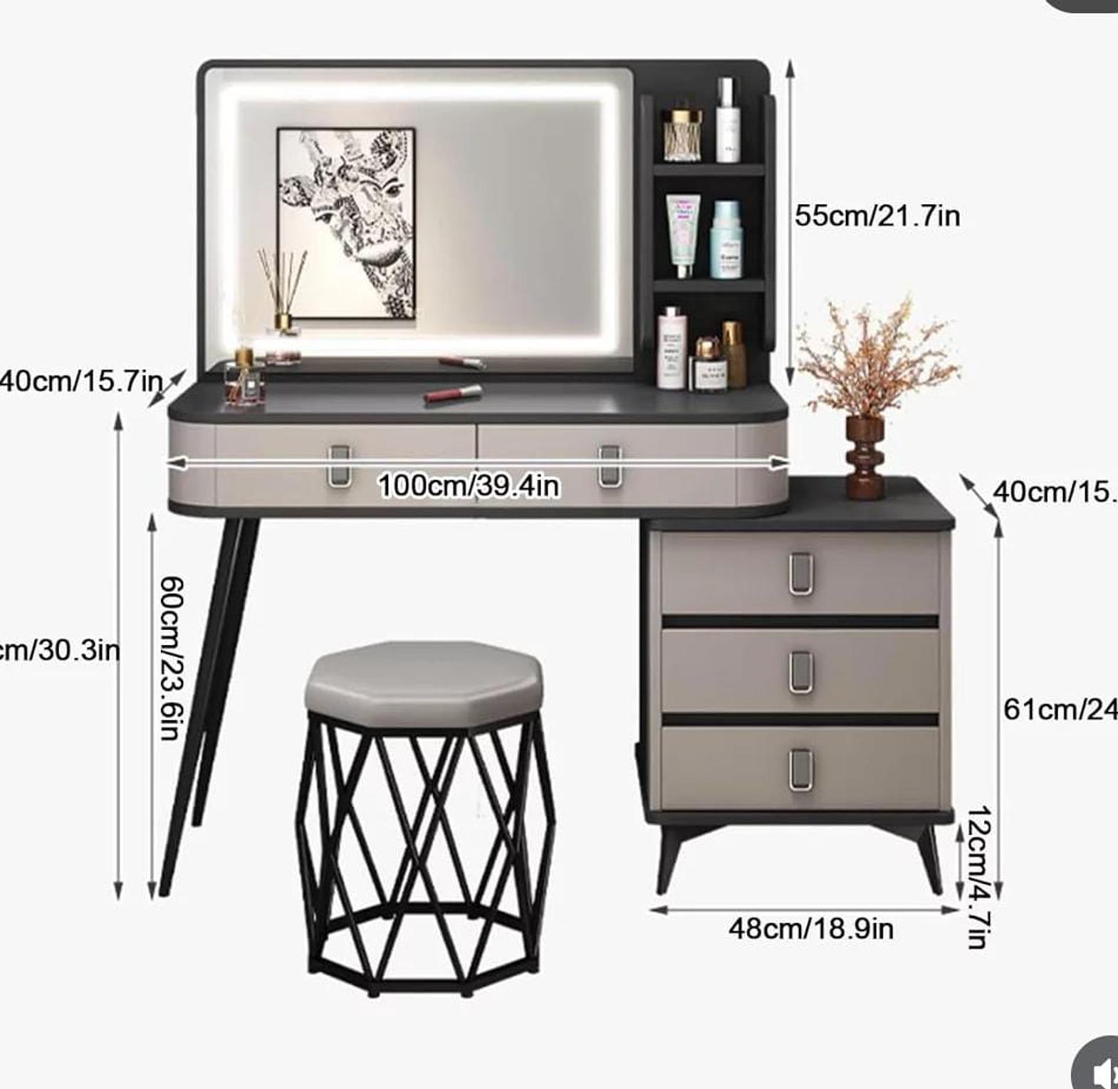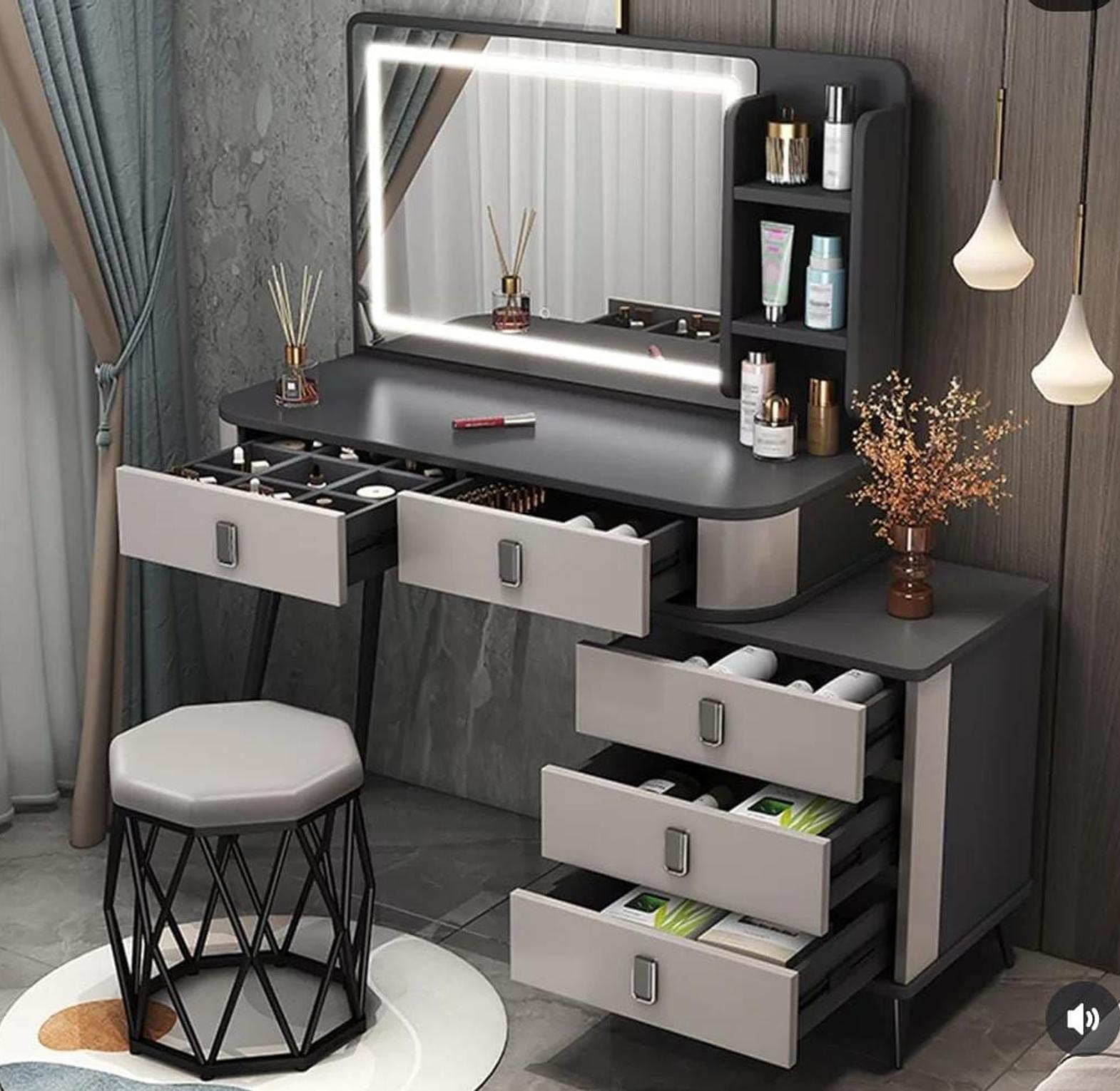 This retractable dressing table combines modern elegance with practical innovation, featuring a sleek design that saves space while keeping your beauty essentials organized. The built-in LED light offers soft, adjustable illumination, ensuring perfect lighting for makeup application or grooming at any time of day. Its retractable structure allows you to extend it when in use and neatly tuck it away when not needed, making it ideal for compact bedrooms or apartments. With well-designed storage compartments and a refined finish, this dressing table is both a statement piece and a functional must-have for a polished daily routine.
