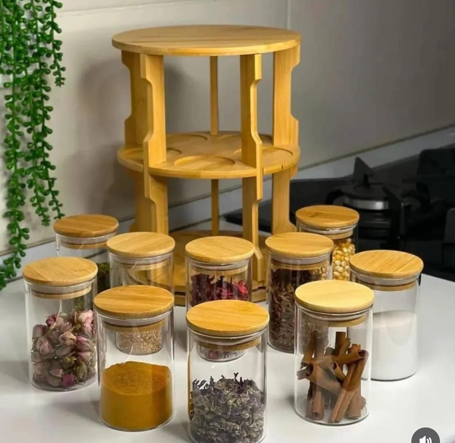 The Rotating Spice Bamboo Tabletop Rack with 10pcs Jars is a perfect blend of natural elegance and everyday functionality. Crafted from eco-friendly bamboo, this space-saving rack spins smoothly for easy access to your favorite spices, keeping your kitchen neat and your seasonings within arm’s reach. The set includes 10 clear jars, each with a secure lid to preserve freshness and aroma, making it easy to identify and dispense your spices. Its sturdy build and timeless design suit both modern and rustic kitchens, while the compact footprint makes it ideal for countertops or small spaces. A must-have for anyone who values convenience, style, and well-organized cooking.